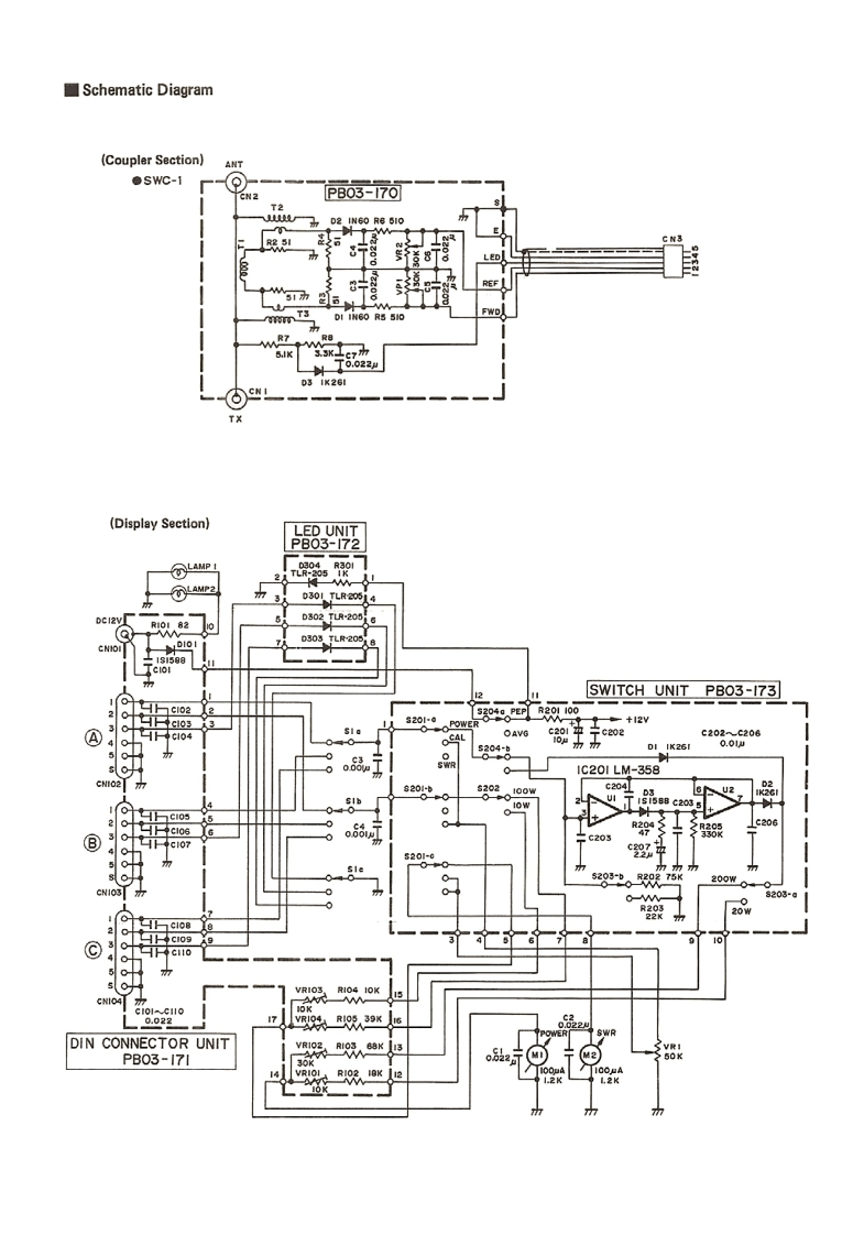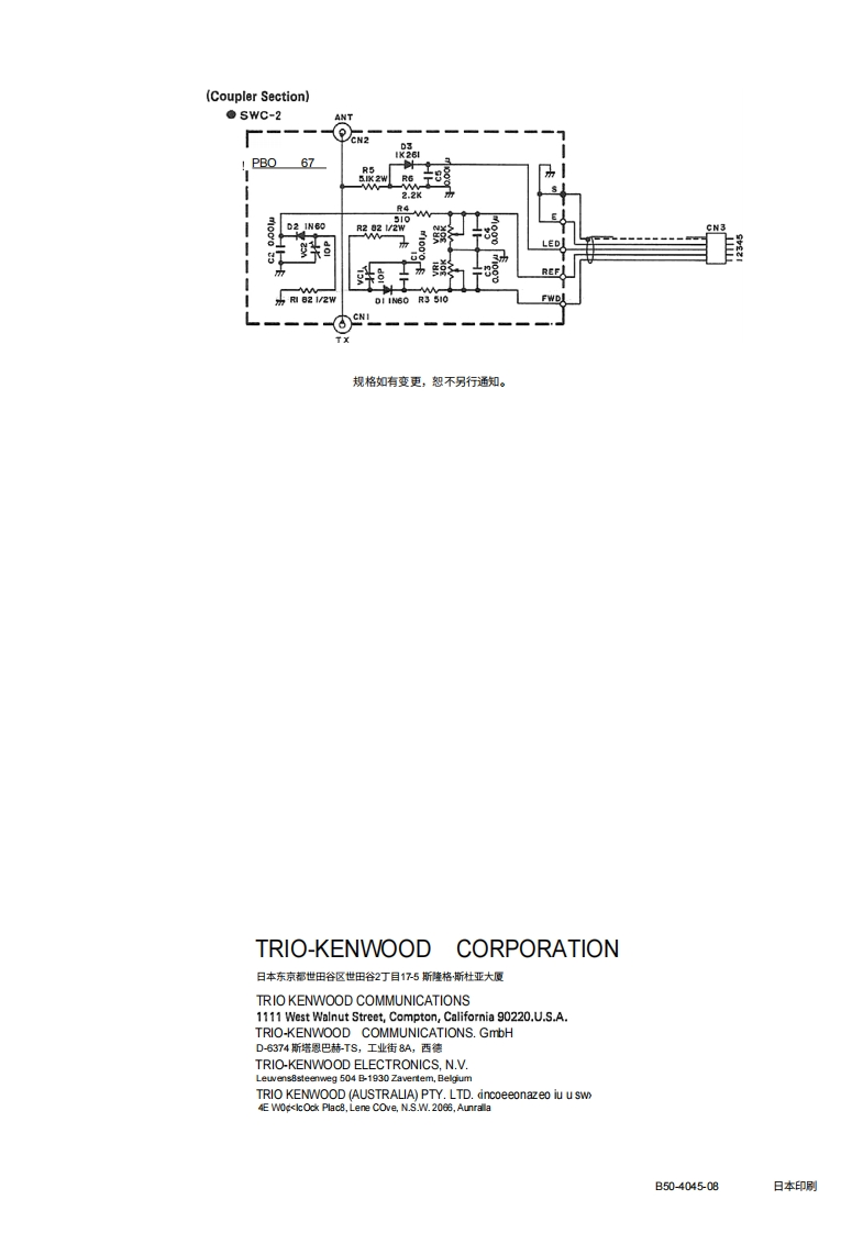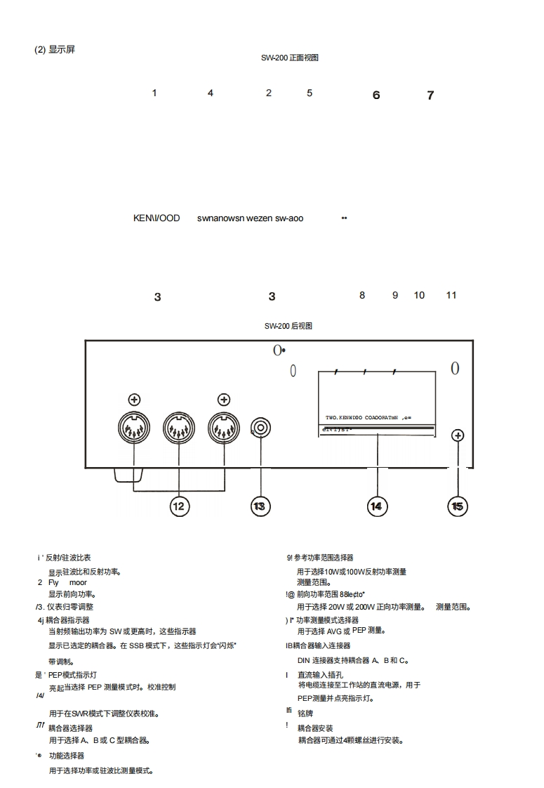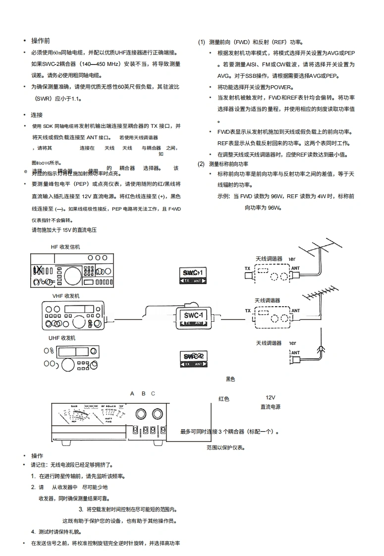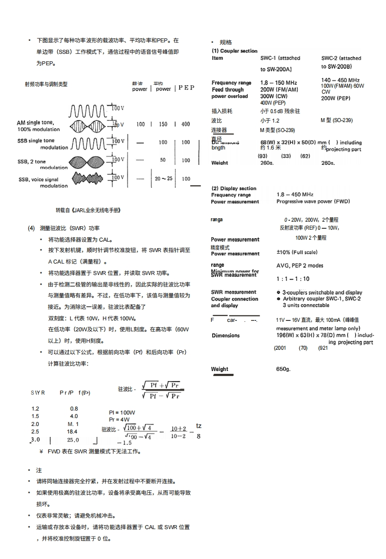 KEN!/OOD组件及其功能M八77-2OO发射(X)连接器功率驻波比表UHF连接器通过SOA同轴电缆接收发射机输出。ANT连接器3用于天线或等效负载的UHF连接器。耦合器支架使用此支架将耦合器用螺丝固定。耦合器可安装·特点在显示单元背面。SW-200穿通式驻波比功率表,配合方向耦合器使用,可在4检测器电缆1.8一450MH也频率范围内使用。·作为一款直通式表,它可连接在发射机与天线之间,从而在运行5连接至显示单元后面板上的耦合器输入端子。铭牌过程中测量输出功率。此处标明了耦合器的额定值。请勿尝试在超过规定额定值的功率。配套探测器中采用环形方向耦合器(SWC-1)或带状线方向耦合器水平下使用该耦合器。(SWC2)。其灵敏度高,输出特性平坦,且无需任何校准或计算即可进行功率测量。在1.8MHz高频段,仅需3W功率即可测量驻波比(SWR)。(1)Detector53oKENWOODSWC-1FREQUENCY COVERAGE 18-15OMHzMAX.POWER200WFM/AM]300wCWI4o9052TxANT◆。耦合器和显示单元可以分离,因此显示单元可以安装在任何方便的地方(图示为SWC一)。由于最多可将3个耦合器连接到显示单元,因此一个显示单元可用于观察多个发射机或天线系统。。显示单元采用双表设计,可问时测量前向功率和反射功率,从而快速、轻松地对发射机和天线进行调谐。●SW200SWR/功率表可测量单边带PEP(峰包络功率)。PDF restoration新ught to you by wwwripi在em