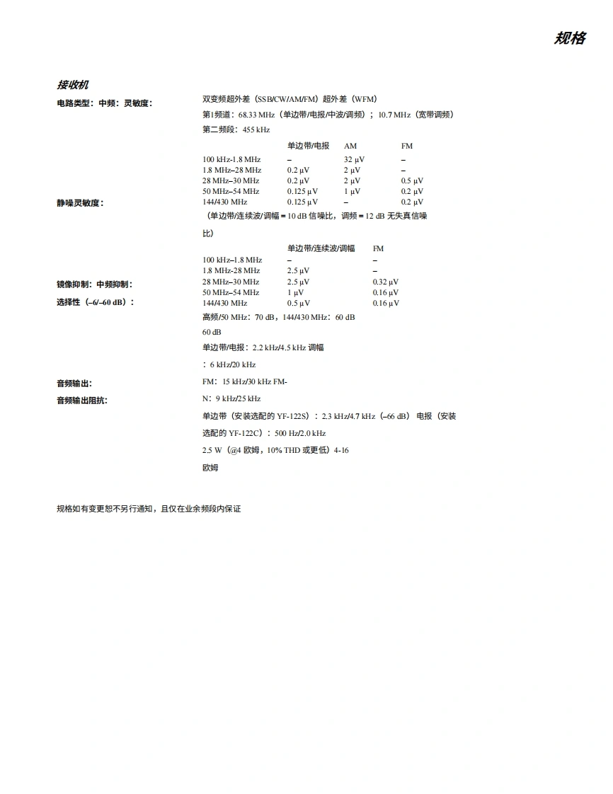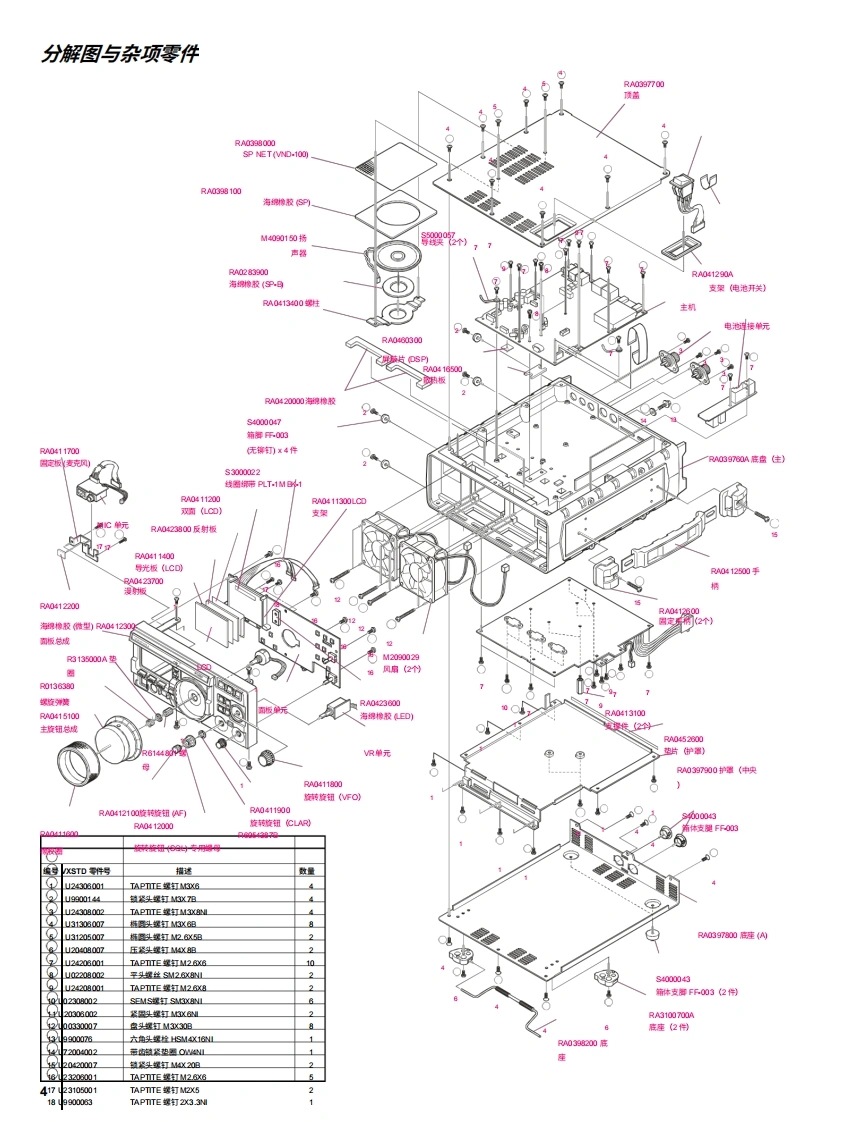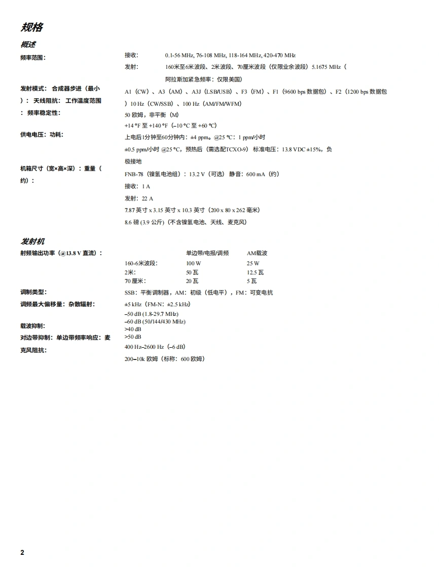 YAESUVERTEX STANDARD CO.,LTD日本东京京和日区中日黑48-8解编153-864VER TEX STANDARDHF/VHF/UHF国驰知加相州赛里市克药10900号,单编9030全模式收发机购事业美国佛里达州阿市528350号2的室,编331YAESU EUROPE B.V.FT-897P.0.Bg75s.1182N39年oL The Nothe幽YAESU UK LTD.技术补充VER TEX STANDARD HK LTD.德九龙现速有离通1丝-141号春城中心205室C2002 VERTEX STANDARD CO.,LTD.日本印刷。02.175.01简介本手册提供了维修FT-897 HF/VHF/UHF全模式收发机所需的技术信息。维修本设备需要具备处理表面贴装芯片元件的专业知识。非合格人员尝试维修本设备可能会导致永久性损坏,此类损坏不在保修范围内,并且在某些国家可能属于违法行为。收发器中的每块双面电路板均提供两份PCB布局图。每面的名称根据该面安装的大部分元器件类型(“有引脚”或“仅芯片”)来确定。在大多数情况下,一侧仅包含芯片元件,而另一侧侧包含芯片元件与引脚元件的混合(如微调电容器、线圈、电解电容器、集成电路等),或仅包含引脚元件。尽管我们相信本手册中的技术信息准确无误,但VERTEX STANDARD对因可能存在的排版或其他错误而造成的任何损失概不负责。如您发现技术信息中存在任何不一致之处,敬请告知,我们将不胜感激。目录规格电路板单元(原理图、布局与元器件分解图及杂项零件主单元2引PL单元53框图.5功放单元59电路说明,.7面板单元。73对齐….10麦克风单元…81VR单元82BATT-CONN单元.83