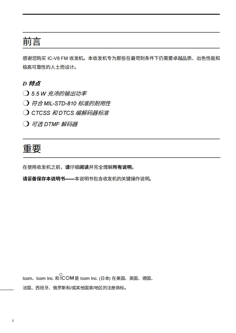 ICOM艾可慕IC-V8_user操作说明书手册20260331-中文版找手册网11天前发布关注私信3.87MB83页029ICOM艾可慕IC-V8_user操作说明书手册20260331-中文版此内容为付费资源,请付费后查看¥19¥21黄金会员免费钻石会员免费登录购买付费资源 第1页 / 共83页 第2页 / 共83页 第3页 / 共83页 第4页 / 共83页 第5页 / 共83页 第6页 / 共83页 第7页 / 共83页 第8页 / 共83页 第9页 / 共83页 第10页 / 共83页 试读已结束,还剩73页,您可下载完整版后进行离线阅读 THE END艾可慕 文本预览 ●)使用说明书VHF收发机iv8COM IC-VB本设备符合FCC规则第15部分的规定。其使用须遵守以下两个条件:()本设备不得造成有害干扰;2)本设备必须接受任何接收到的干扰,包括可能导致意外运行的干扰号a品Icom Inc.Downloaded by0RadioAmateur.EU 查看更多 收起部分 喜欢就支持一下吧收藏