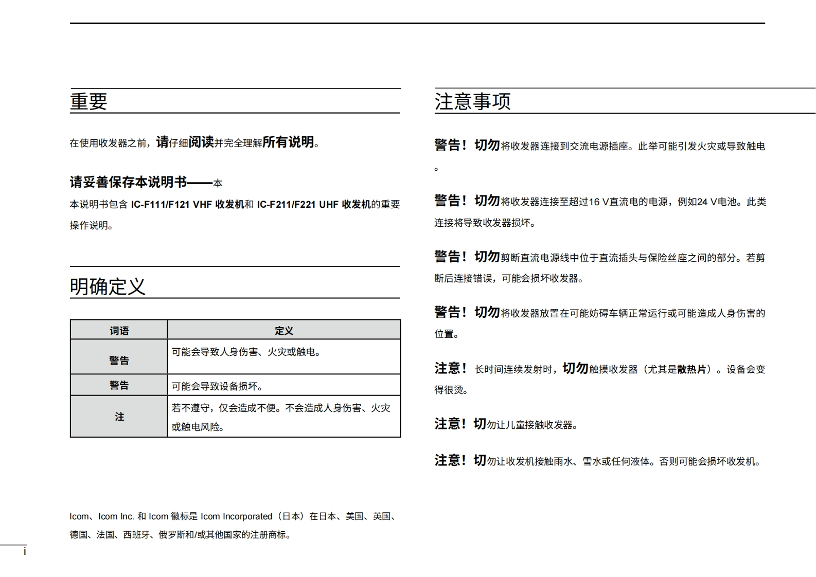 ICOM艾可慕Icom_IC-F111_IC-F121_IC-F211_IC-F221_user操作说明书手册20260331-中文版找手册网11天前发布关注私信2.08MB26页023ICOM艾可慕Icom_IC-F111_IC-F121_IC-F211_IC-F221_user操作说明书手册20260331-中文版此内容为付费资源,请付费后查看¥19¥21黄金会员免费钻石会员免费登录购买付费资源 第1页 / 共26页 第2页 / 共26页 第3页 / 共26页 第4页 / 共26页 第5页 / 共26页 第6页 / 共26页 第7页 / 共26页 第8页 / 共26页 第9页 / 共26页 第10页 / 共26页 试读已结束,还剩16页,您可下载完整版后进行离线阅读 THE END艾可慕 文本预览 COM使用说明书VHF收发机iF111iF121IcomIneECOMUHF收发机PoP1P2P321Icom Inc. 查看更多 收起部分 喜欢就支持一下吧收藏