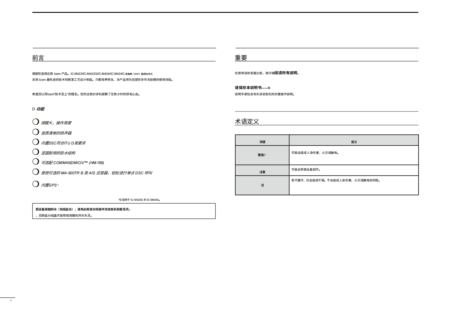 Marine_IC-M424G_操作说明书手册20260331-中文版找手册网11天前发布关注私信4.81MB109页036Marine_IC-M424G_操作说明书手册20260331-中文版此内容为付费资源,请付费后查看¥19¥21黄金会员免费钻石会员免费登录购买付费资源 第1页 / 共109页 第2页 / 共109页 第3页 / 共109页 第4页 / 共109页 第5页 / 共109页 第6页 / 共109页 第7页 / 共109页 第8页 / 共109页 第9页 / 共109页 第10页 / 共109页 试读已结束,还剩99页,您可下载完整版后进行离线阅读 THE END艾可慕 文本预览 COM使用说明书VHF船用收发机iM423iM4233iM424 iM424GHF MARINE IC-M423G GPS本设备符合F℃C规则第15部分的规定。使用本设备须确保不会造成有害干扰。25W INTENTRX0明0CT0112:3CALI TNGMENU CLEARIcom Inc.SCAN■OWHI/LOCHAN, 查看更多 收起部分 喜欢就支持一下吧收藏