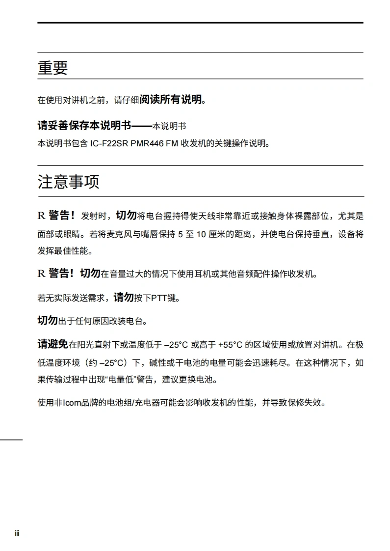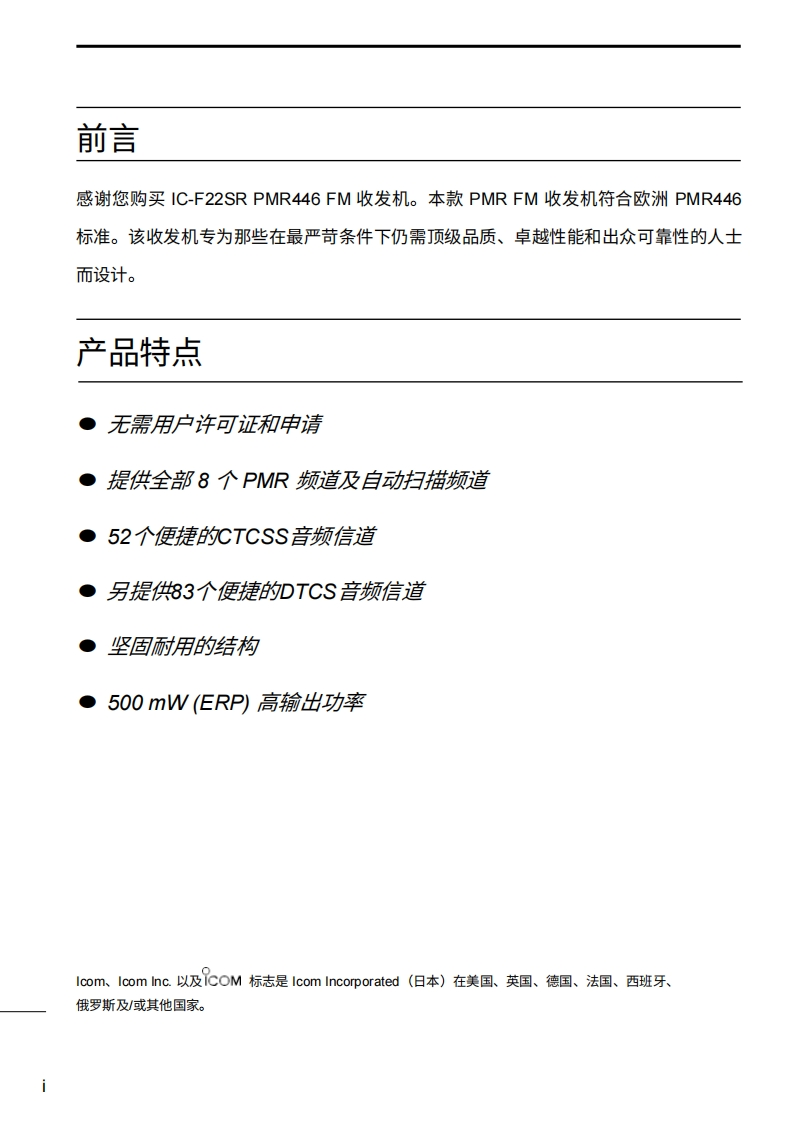 艾可慕IC-F22SR_Manual操作说明书手册20260331-中文版找手册网10天前发布关注私信1.76MB40页025艾可慕IC-F22SR_Manual操作说明书手册20260331-中文版此内容为付费资源,请付费后查看¥19¥21黄金会员免费钻石会员免费登录购买付费资源 第1页 / 共40页 第2页 / 共40页 第3页 / 共40页 第4页 / 共40页 第5页 / 共40页 第6页 / 共40页 第7页 / 共40页 第8页 / 共40页 第9页 / 共40页 第10页 / 共40页 试读已结束,还剩30页,您可下载完整版后进行离线阅读 THE END艾可慕 文本预览 ●cOM使用说明书PMR446FM收发机iF22SRCOMIcom Inc. 查看更多 收起部分 喜欢就支持一下吧收藏
