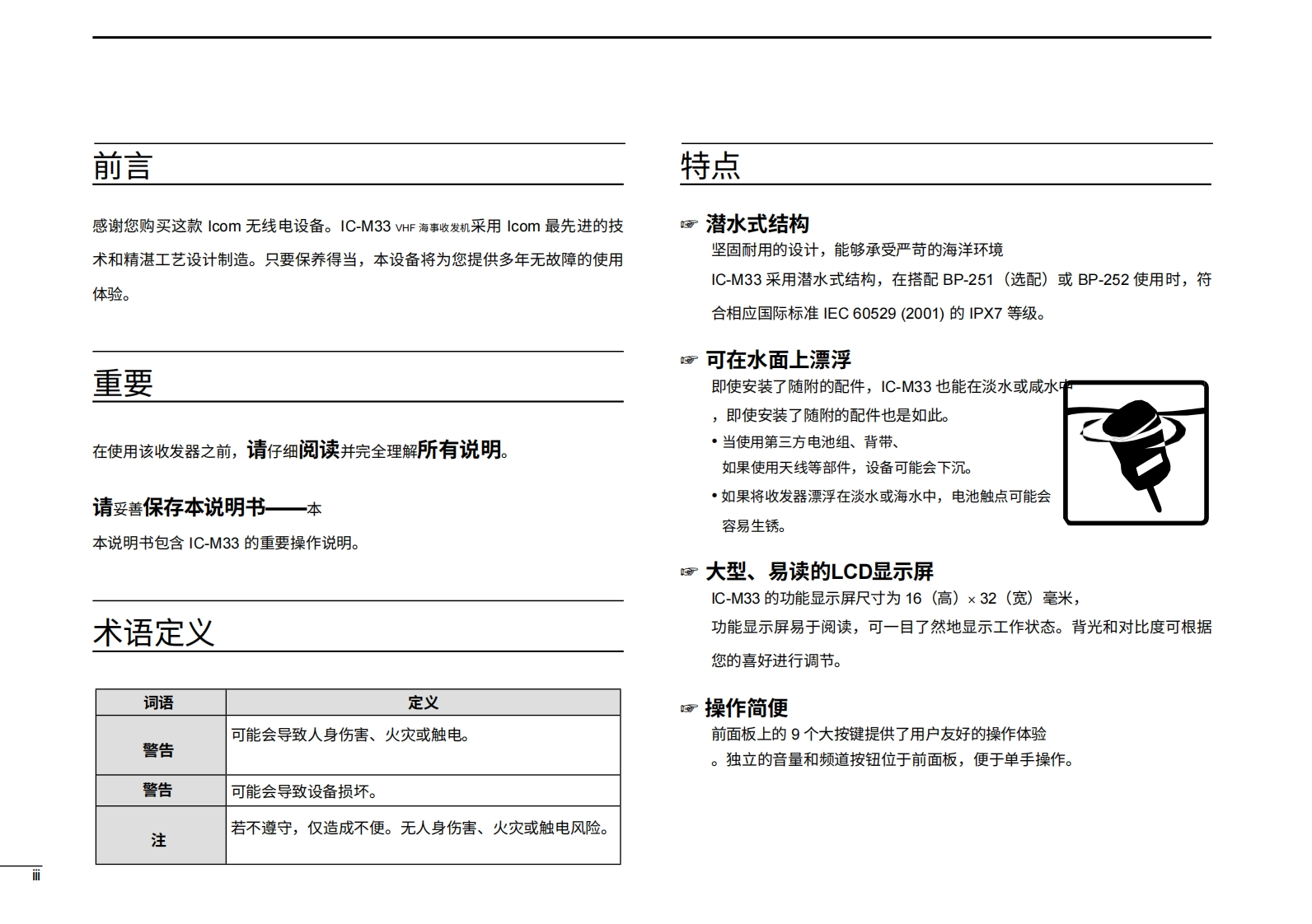艾可慕IC-M33_Manual操作说明书手册20260331-中文版找手册网11天前发布关注私信2.93MB41页041艾可慕IC-M33_Manual操作说明书手册20260331-中文版此内容为付费资源,请付费后查看¥19¥21黄金会员免费钻石会员免费登录购买付费资源 第1页 / 共41页 第2页 / 共41页 第3页 / 共41页 第4页 / 共41页 第5页 / 共41页 第6页 / 共41页 第7页 / 共41页 第8页 / 共41页 第9页 / 共41页 第10页 / 共41页 试读已结束,还剩31页,您可下载完整版后进行离线阅读 THE END艾可慕 文本预览 使用说明书VHF船用收发机iM33ICOMWATERPROOFBUOYANT06CHIcom Inc.1C-M33 查看更多 收起部分 喜欢就支持一下吧收藏