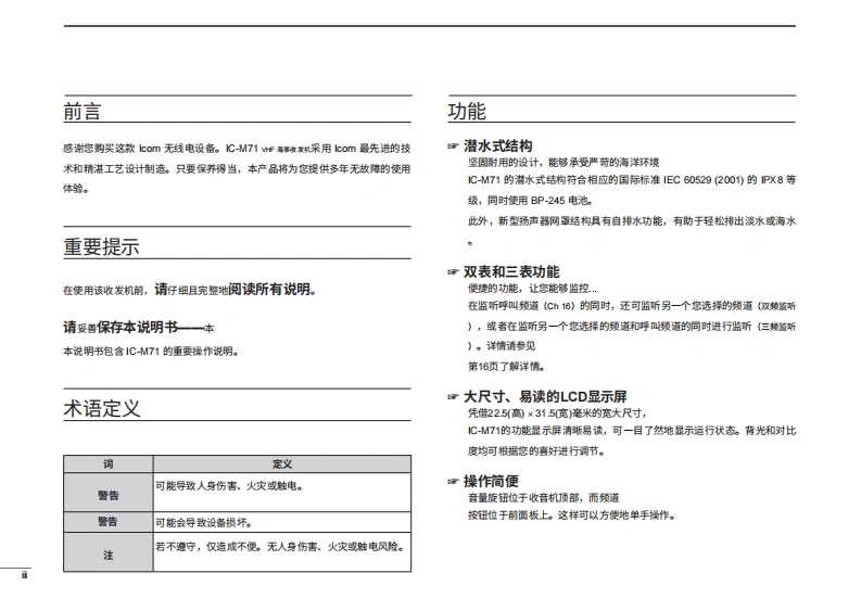 艾可慕IC-M71_Manual操作说明书手册20260331-中文版找手册网10天前发布关注私信3.60MB45页026艾可慕IC-M71_Manual操作说明书手册20260331-中文版此内容为付费资源,请付费后查看¥19¥21黄金会员免费钻石会员免费登录购买付费资源 第1页 / 共45页 第2页 / 共45页 第3页 / 共45页 第4页 / 共45页 第5页 / 共45页 第6页 / 共45页 第7页 / 共45页 第8页 / 共45页 第9页 / 共45页 第10页 / 共45页 试读已结束,还剩35页,您可下载完整版后进行离线阅读 THE END艾可慕 文本预览 使用说明书VHF船用收发机IC-M71COMC-171DIALSCANIcom Inc. 查看更多 收起部分 喜欢就支持一下吧收藏