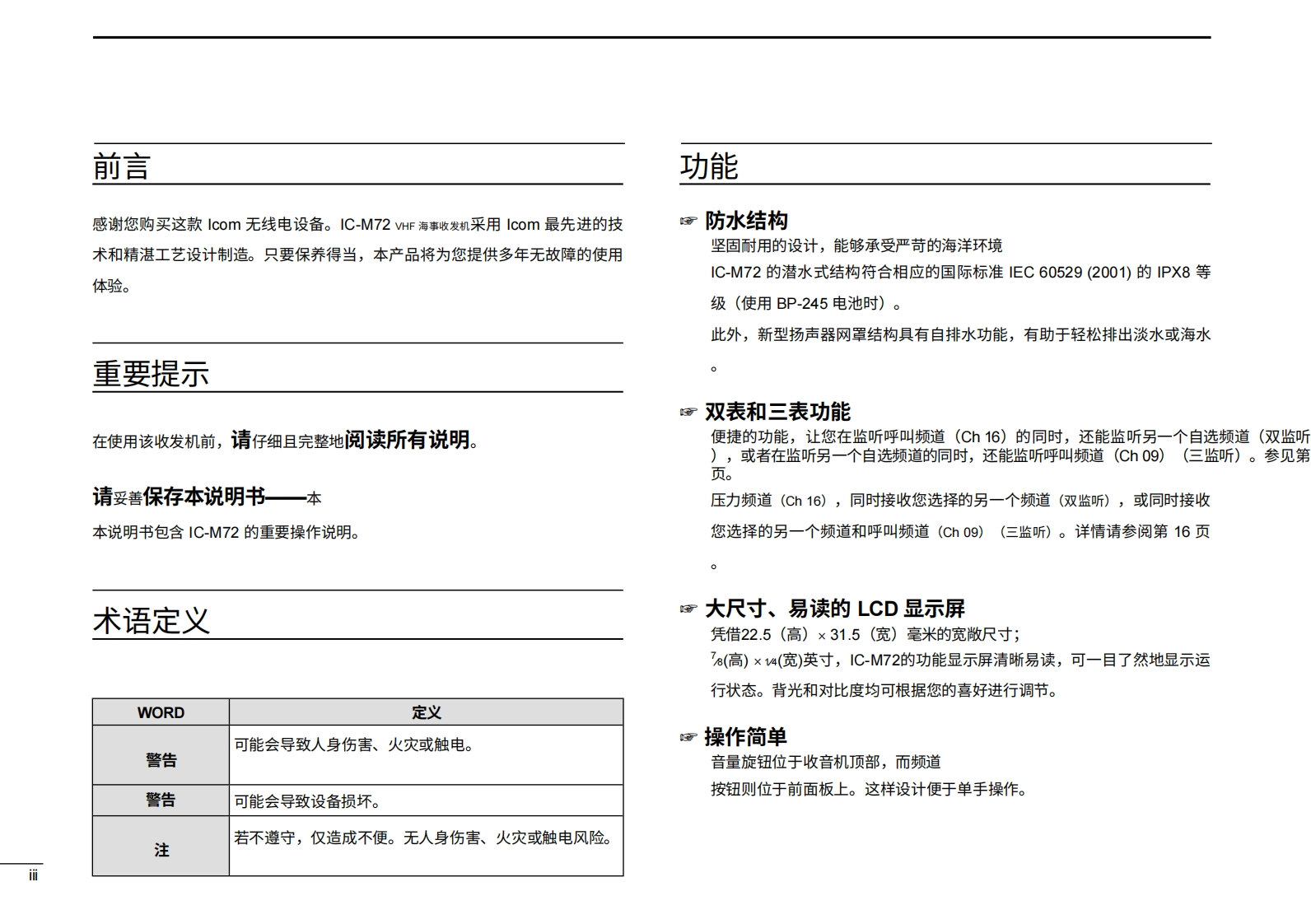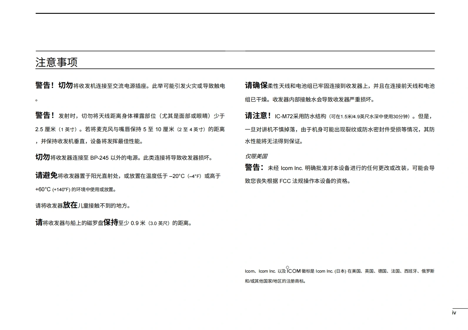 艾可慕IC-M72_Manual操作说明书手册20260331-中文版找手册网10天前发布关注私信3.56MB43页020艾可慕IC-M72_Manual操作说明书手册20260331-中文版此内容为付费资源,请付费后查看¥19¥21黄金会员免费钻石会员免费登录购买付费资源 第1页 / 共43页 第2页 / 共43页 第3页 / 共43页 第4页 / 共43页 第5页 / 共43页 第6页 / 共43页 第7页 / 共43页 第8页 / 共43页 第9页 / 共43页 第10页 / 共43页 试读已结束,还剩33页,您可下载完整版后进行离线阅读 THE END艾可慕 文本预览 使用说明书VHF船用收发机iM72COMi达IC472SUBMERSIBLE PLUSU/VCCH/WXA TAGDUALSCANOCK本设备符合美国联邦通信委员会(FCC)规则第15部分的规定16H/L。使用本设备须确保不会造成有害干扰。VHF MARINE TRAC2Icom Inc. 查看更多 收起部分 喜欢就支持一下吧收藏