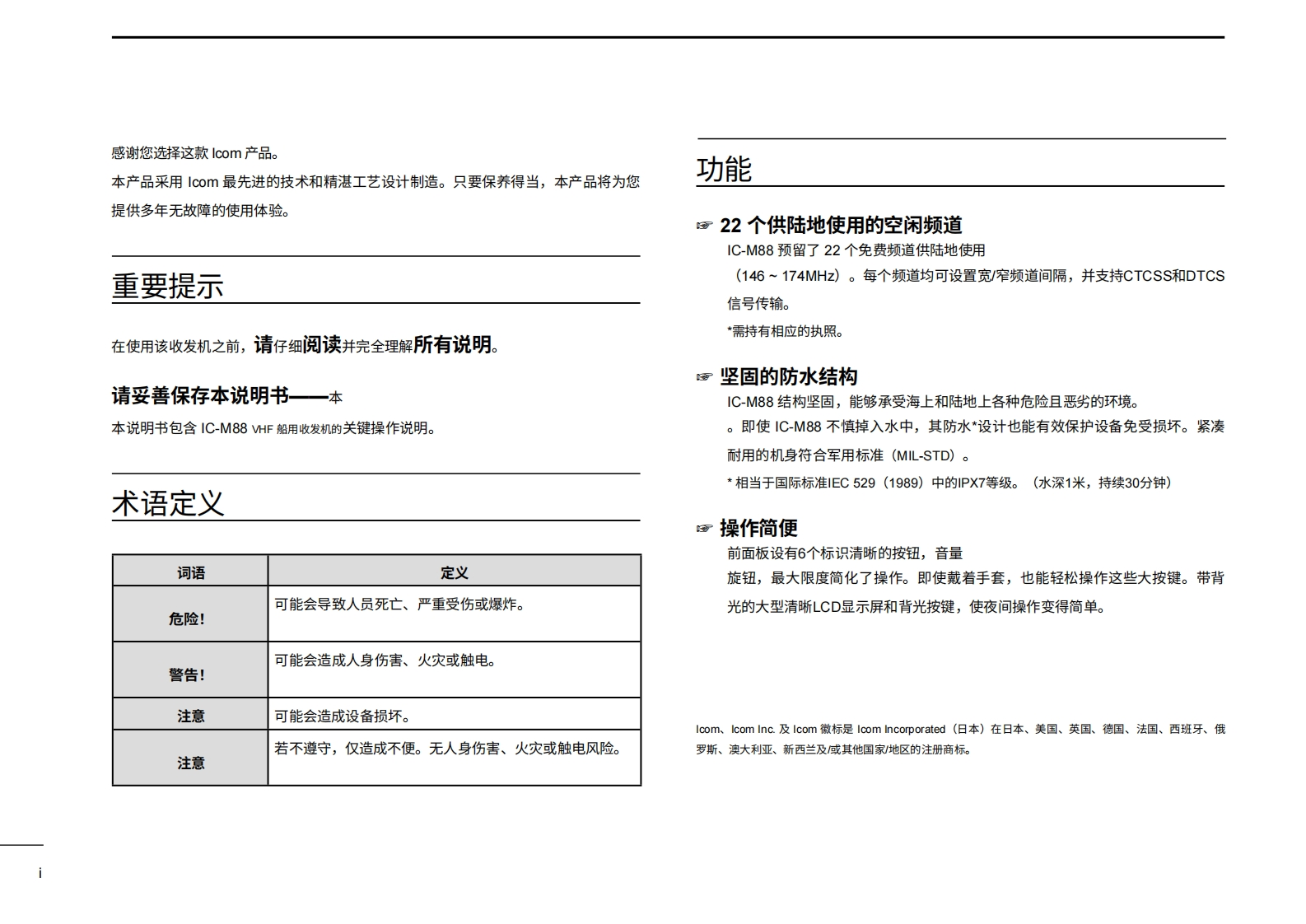 艾可慕IC-M88-Instruction-manual操作说明书手册20260331-中文版找手册网10天前发布关注私信3.77MB53页040艾可慕IC-M88-Instruction-manual操作说明书手册20260331-中文版此内容为付费资源,请付费后查看¥19¥21黄金会员免费钻石会员免费登录购买付费资源 第1页 / 共53页 第2页 / 共53页 第3页 / 共53页 第4页 / 共53页 第5页 / 共53页 第6页 / 共53页 第7页 / 共53页 第8页 / 共53页 第9页 / 共53页 第10页 / 共53页 试读已结束,还剩43页,您可下载完整版后进行离线阅读 THE END艾可慕 文本预览 COM使用说明书VHF船用收发机iM88WATERPROOF本设备符合美国联邦通信委员会(FCC)规则第15部分的规定。使用本设备须确保不会造成有害干扰。6IC-M88TAGU/I/C/LDUACH/WXSCNLOCKH/LIcom Inc.COM 查看更多 收起部分 喜欢就支持一下吧收藏