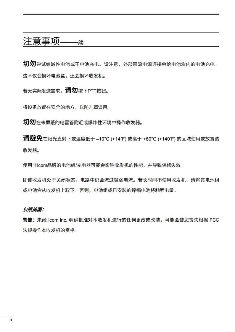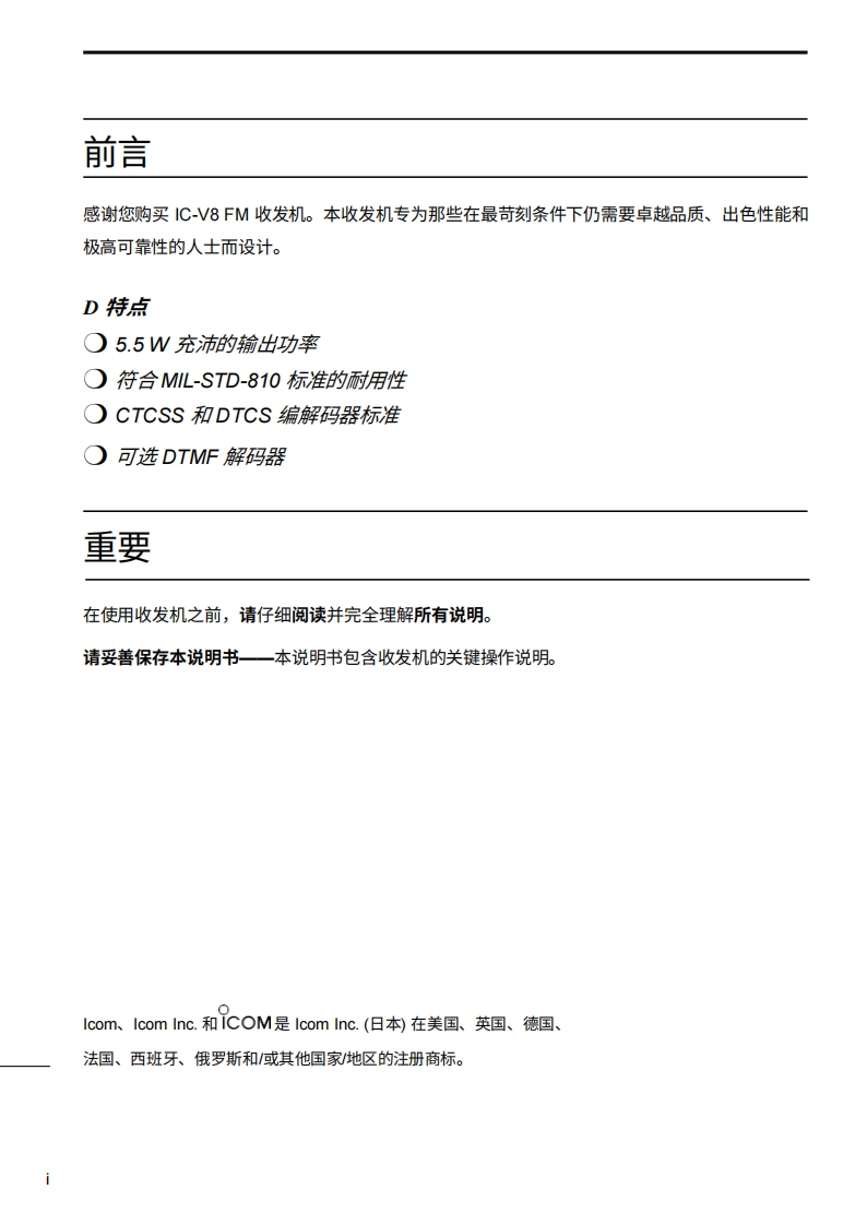 艾可慕ICOM—IC-V8-Instruction-Manual20260331-中文版找手册网10天前发布关注私信3.87MB83页020艾可慕ICOM—IC-V8-Instruction-Manual20260331-中文版此内容为付费资源,请付费后查看¥19¥21黄金会员免费钻石会员免费登录购买付费资源 第1页 / 共83页 第2页 / 共83页 第3页 / 共83页 第4页 / 共83页 第5页 / 共83页 第6页 / 共83页 第7页 / 共83页 第8页 / 共83页 第9页 / 共83页 第10页 / 共83页 试读已结束,还剩73页,您可下载完整版后进行离线阅读 THE END艾可慕 文本预览 ●)使用说明书VHF收发机iv8COM IC-VB本设备符合FCC规则第15部分的规定。其使用须遵守以下两个条件:(1)本设备不得造成有害干扰;2)本设备必须接受任何接收到的干扰,包括可能导致意外运行的干扰g品Icom Inc.70 查看更多 收起部分 喜欢就支持一下吧收藏