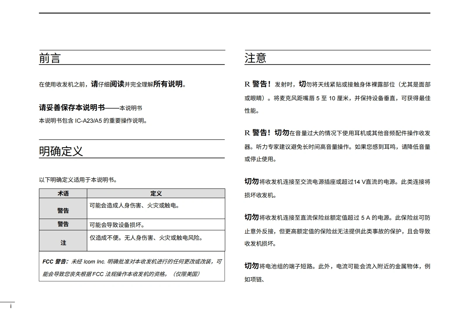 艾可慕Icom_IC-A23–IC-A5-(Instruction-Manual操作说明书手册)20260331-中文版找手册网10天前发布关注私信2.37MB56页034艾可慕Icom_IC-A23–IC-A5-(Instruction-Manual操作说明书手册)20260331-中文版此内容为付费资源,请付费后查看¥19¥21黄金会员免费钻石会员免费登录购买付费资源 第1页 / 共56页 第2页 / 共56页 第3页 / 共56页 第4页 / 共56页 第5页 / 共56页 第6页 / 共56页 第7页 / 共56页 第8页 / 共56页 第9页 / 共56页 第10页 / 共56页 试读已结束,还剩46页,您可下载完整版后进行离线阅读 THE END艾可慕 文本预览 COM使用说明书VHF航空频段收发机i△23i△5本设备符合FCC规则第15部分的规定。其操作须遵守以下两个条件:(1)本设备不得造成有害干扰;(②)本设备必须接受任何接收到的干扰,包括可能导致意外操作的干扰。Icom Inc. 查看更多 收起部分 喜欢就支持一下吧收藏