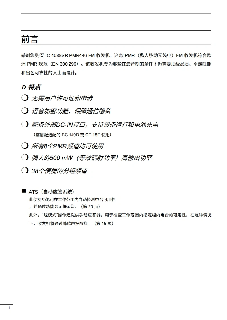 艾可慕icom_ic4088sr_使用说明书手册20260331-中文版找手册网11天前发布关注私信2.30MB35页046艾可慕icom_ic4088sr_使用说明书手册20260331-中文版此内容为付费资源,请付费后查看¥19¥21黄金会员免费钻石会员免费登录购买付费资源 第1页 / 共35页 第2页 / 共35页 第3页 / 共35页 第4页 / 共35页 第5页 / 共35页 第6页 / 共35页 第7页 / 共35页 第8页 / 共35页 第9页 / 共35页 第10页 / 共35页 试读已结束,还剩25页,您可下载完整版后进行离线阅读 THE END艾可慕 文本预览 使用说明书PMR446FM收发机14088SR738。LICENCE-FREE20FM TRANSCEIVERIcom Inc. 查看更多 收起部分 喜欢就支持一下吧收藏