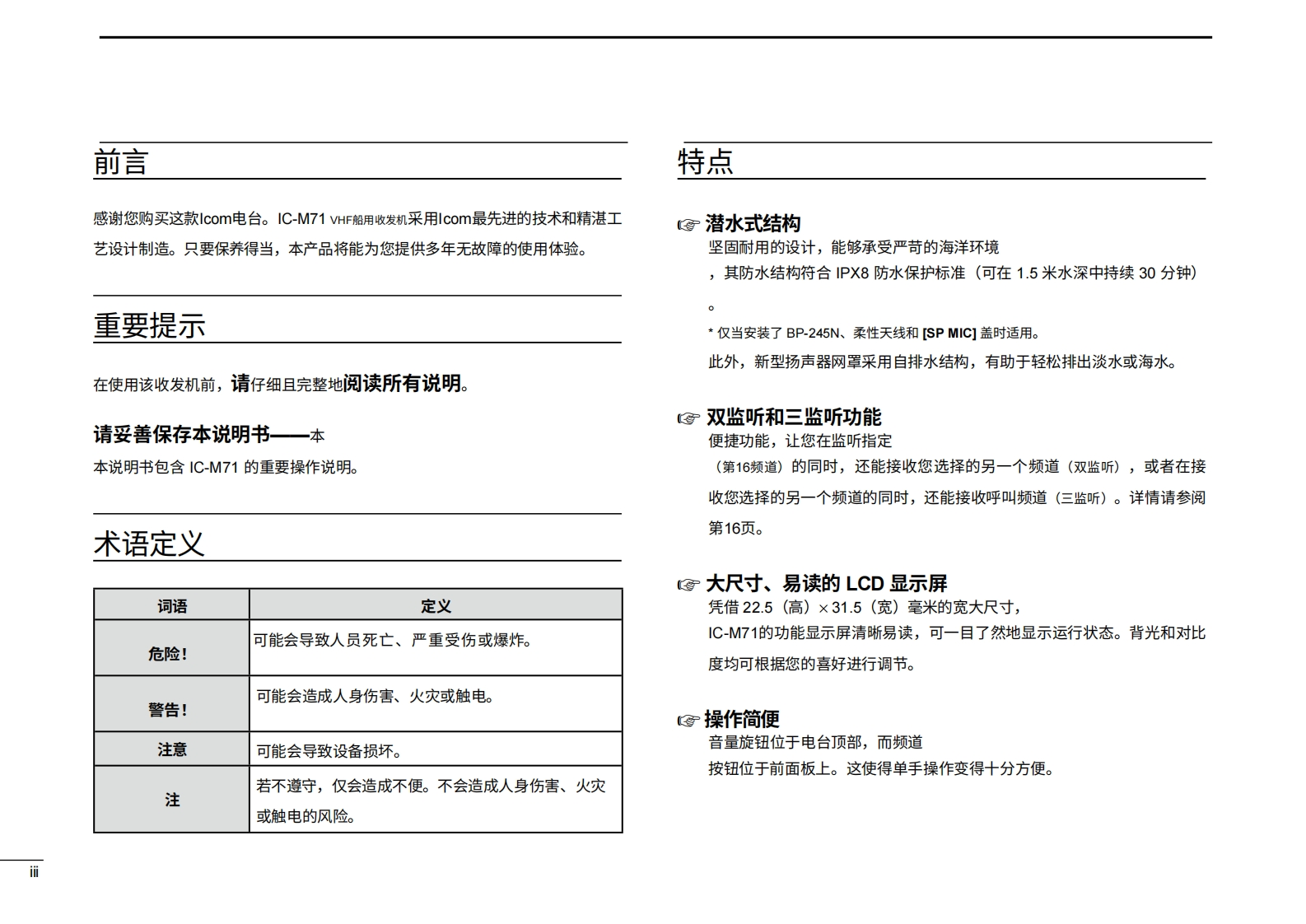 艾可慕icom_icm71_使用说明书手册20260331-中文版找手册网11天前发布关注私信3.72MB42页038艾可慕icom_icm71_使用说明书手册20260331-中文版此内容为付费资源,请付费后查看¥19¥21黄金会员免费钻石会员免费登录购买付费资源 第1页 / 共42页 第2页 / 共42页 第3页 / 共42页 第4页 / 共42页 第5页 / 共42页 第6页 / 共42页 第7页 / 共42页 第8页 / 共42页 第9页 / 共42页 第10页 / 共42页 试读已结束,还剩32页,您可下载完整版后进行离线阅读 THE END艾可慕 文本预览 COM使用说明书VHF船用收发机i-M71COMI171WATERPROOFDIALAV TAGDUALSCANLOCK06H/LIcom Inc. 查看更多 收起部分 喜欢就支持一下吧收藏