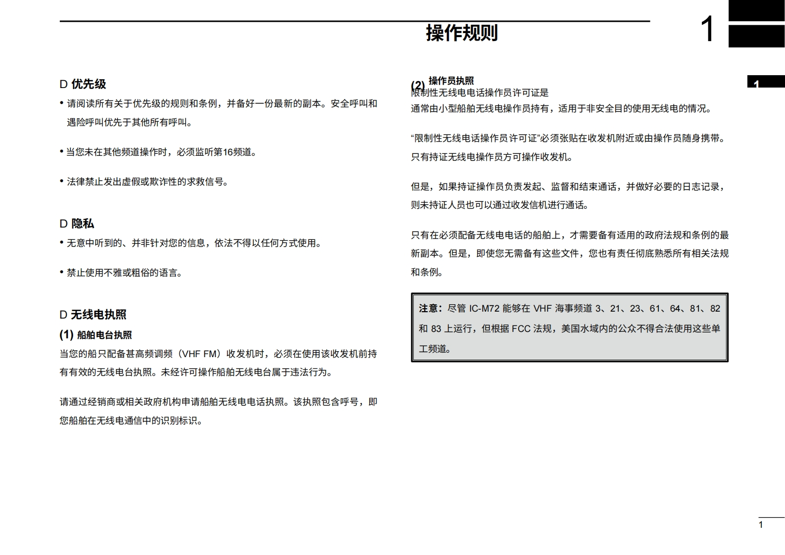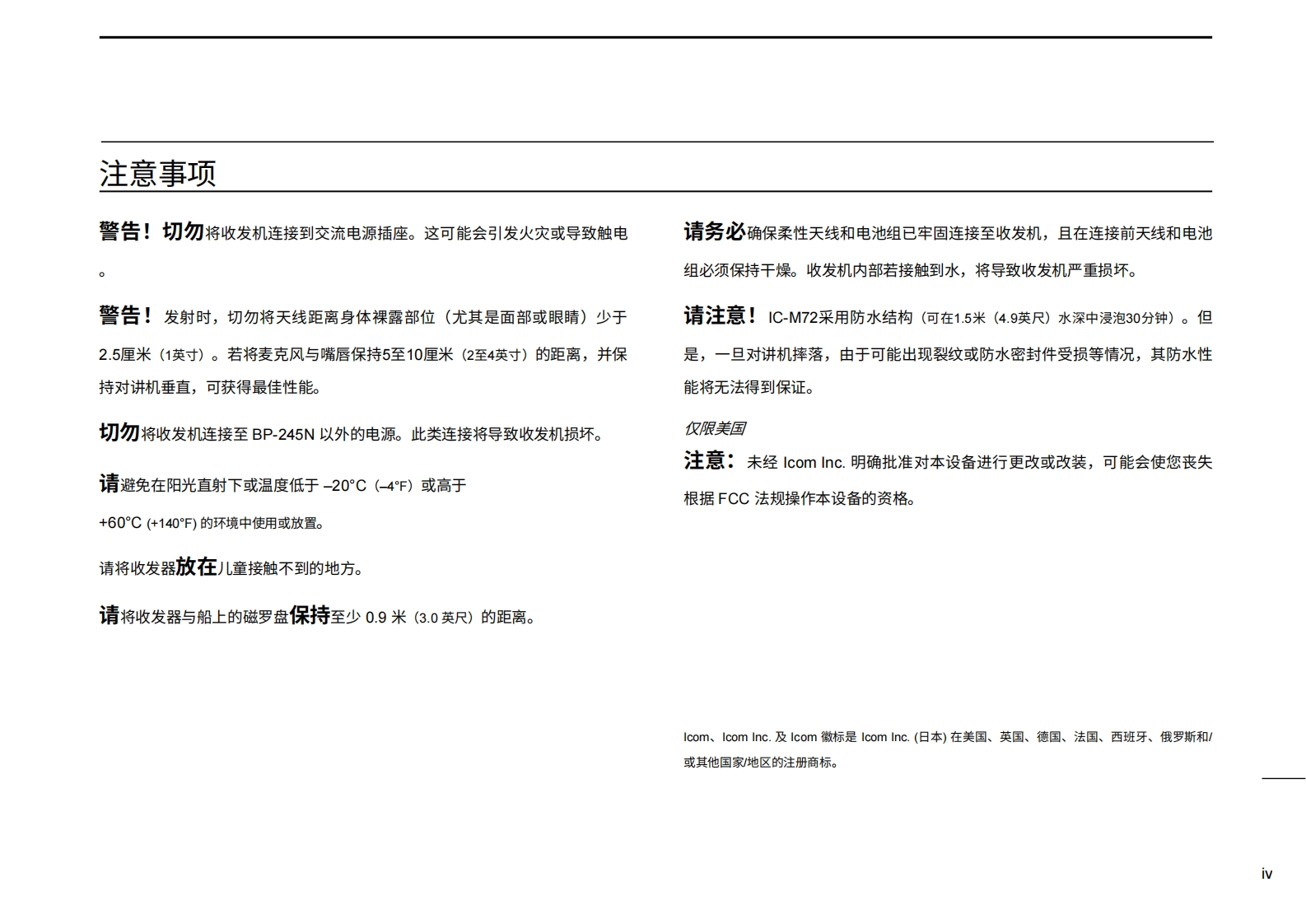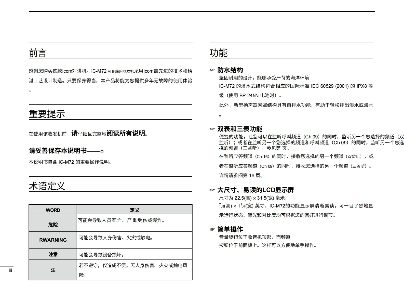 艾可慕icom_icm72_使用说明书手册20260331-中文版找手册网11天前发布关注私信3.63MB47页047艾可慕icom_icm72_使用说明书手册20260331-中文版此内容为付费资源,请付费后查看¥19¥21黄金会员免费钻石会员免费登录购买付费资源 第1页 / 共47页 第2页 / 共47页 第3页 / 共47页 第4页 / 共47页 第5页 / 共47页 第6页 / 共47页 第7页 / 共47页 第8页 / 共47页 第9页 / 共47页 第10页 / 共47页 试读已结束,还剩37页,您可下载完整版后进行离线阅读 THE END艾可慕 文本预览 COM使用说明书VHF船用收发机iM72ICOMUSA达I-472SUBMERSIBLE PLUSCH/WXAV TAGDUALSCANLOCK本设备符合美国联邦通信委员会(FCC)规则第15部分的规定16H/L。使用本设备须确保不会造成有害干扰。Icom Inc. 查看更多 收起部分 喜欢就支持一下吧收藏