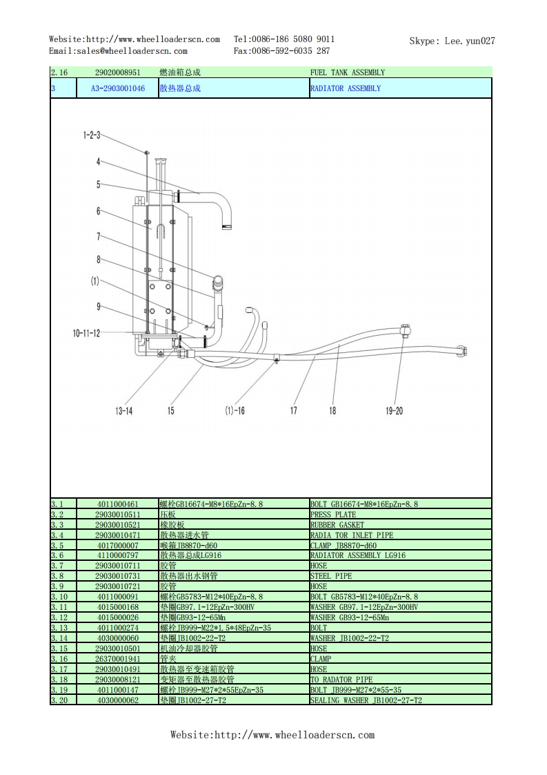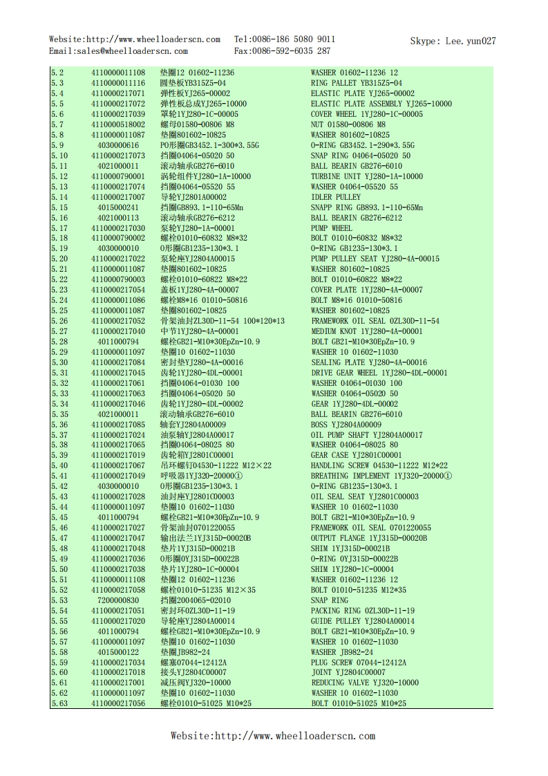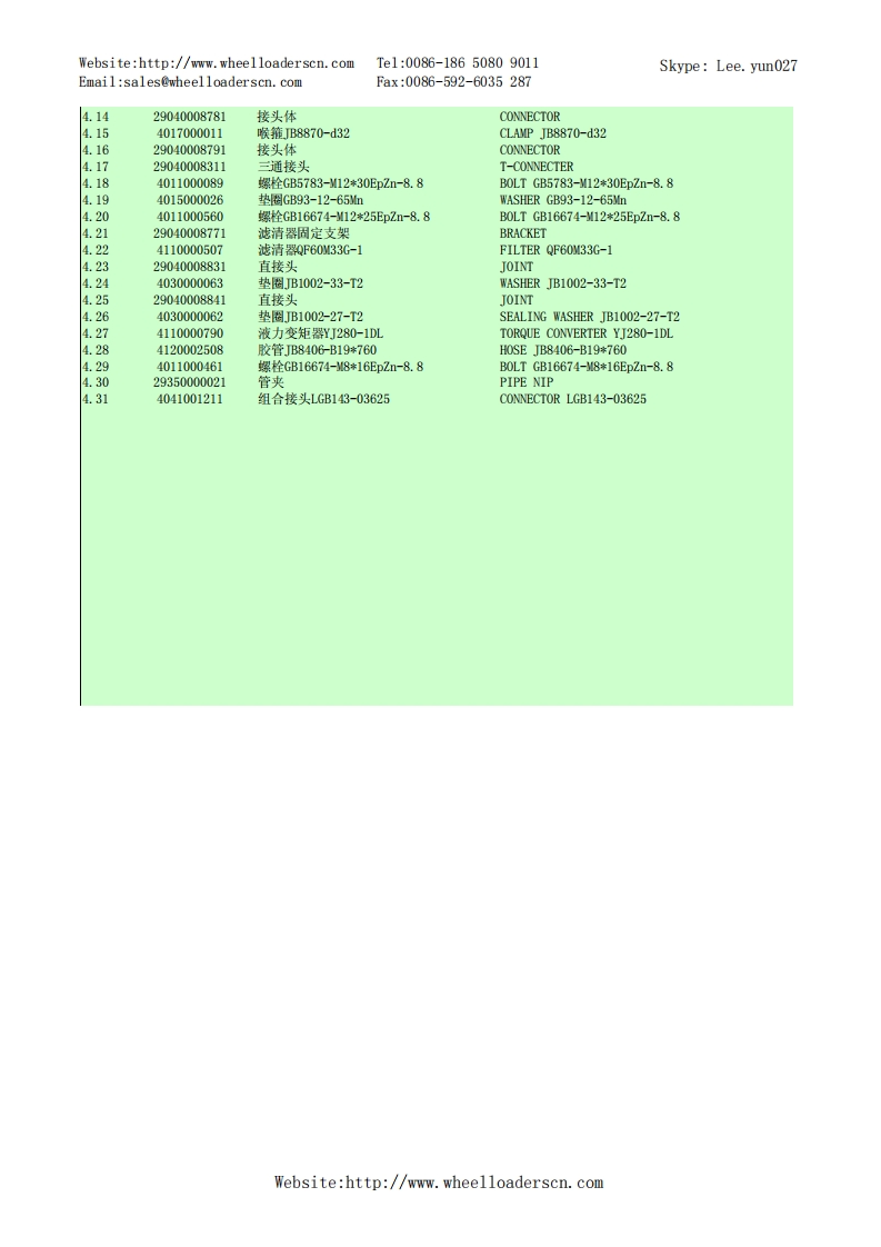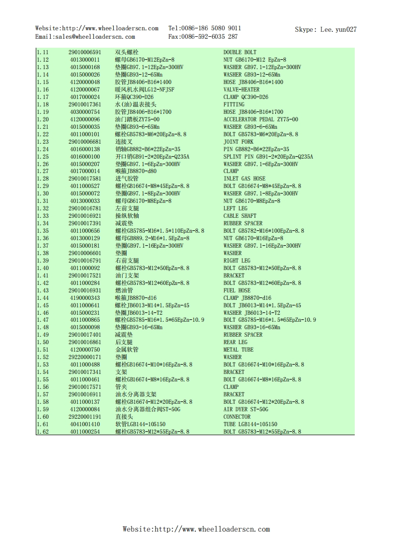 Website:http://www.wheelloaderscn.comTe1:0086-18650809011Skype:Lee.yun027Email:sales@wheelloaderscn.comFax:0086-592-6035287序号编码名称英文名称01609214A29LG916轮式装载机TU0E-1609214A29A1-2901001668发动机总成DIESEL ENGINE ASSEMBLY02-2》-90554110001006发动机ZHBG44ENGINE ZHBG44229010017301橡胶垫RUBBER GASKET34015000197垫圈GB96.1-10EpZn-300HWWASHER GB96.1-10EpZn-300HV.44011000082螺栓GB5783-M10*25EpZn-8.8B0LTGB5783-10*25EpZn-8.81.529010017591上盖板(LG916华丰)PLATE1.64011000474螺栓GB16674-10*25EpZn-8.8B0LTGB16674-10*25EpZn-8.8.729010017331橡胶垫RUBBER GASKET1.829010017381橡胶垫RUBBER GASKET1.929010017261空滤环雍CLAMP.1029010017491停车操纵软轴】PARKING CONTROL SYSTEMWebsite:http://www.wheelloaderscn.com