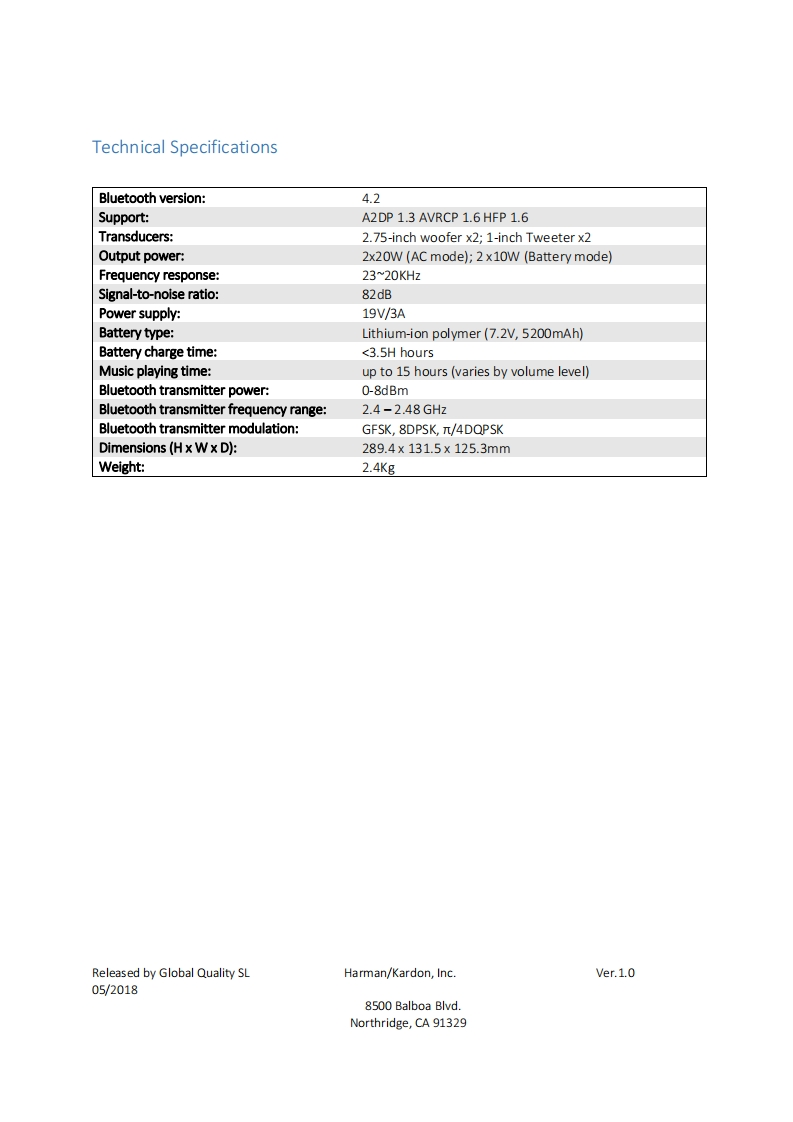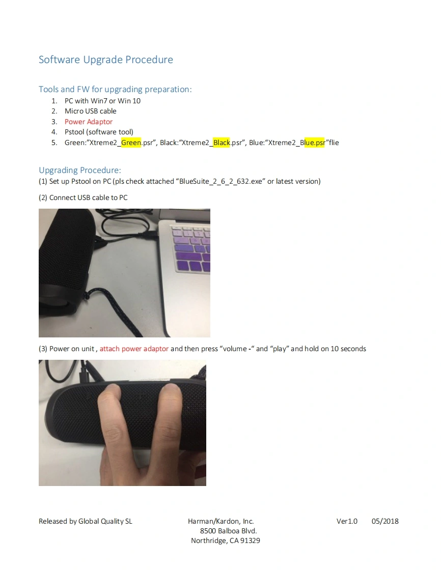 JBLService ManualXTREME 2 (S/N starting from PL)Portable Bluetooth Speaker with passive bass radiators,5200 mAh battery for 15 hours of playtimeand charging of other devices through dual USB,and IPX7 waterproof.SKU:JBLXTREME2BLKAM,JBLXTREME2BLUAM,JBLXTREME2GRNAM,JBLXTREME2BLKEU,JBLXTREME2BLUEU,JBLXTREME2GRNEU.JBLXTREME2BLKAS,JBLX TREME2BLUAS,JBLXTREME2GRNAS,JBLXTREME2BLKCN,JBLXTREME2BLUCN,JBLXTREME2GRNCN,JBLXTREME2BLKJN,JBLXTREME2BLUJN,JBLXTREME2GRNJN,JBLXTREME2BLKBR,JBLXTREME2BLUBR,JBLXTREME2GRNBR,JBLXTREME2BLKIN,JBLXTREME2BLUIN,JBLXTREME2GRNIN,JBLXTREME2REDAM,JBLXTREME2SQUADAM,JBLXTREME2REDEU,JBLXTREME2SQUADEU,JBLXTREME2REDAS,JBLXTREME2SQUADAS,JBLXTREME2REDCN,JBLXTREME2SQUADCN,JBLXTREME2REDJN,JBLXTREME2SQUADJN,JBLXTREME2REDBR,JBLXTREME2SQUADBR,JBLXTREME2REDIN,JBLXTREME2SQUADINReleased by Global Qualityharman/kardon,Inc.Ver.2.110/20198500 Balboa Blvd.Northridge,CA 91329