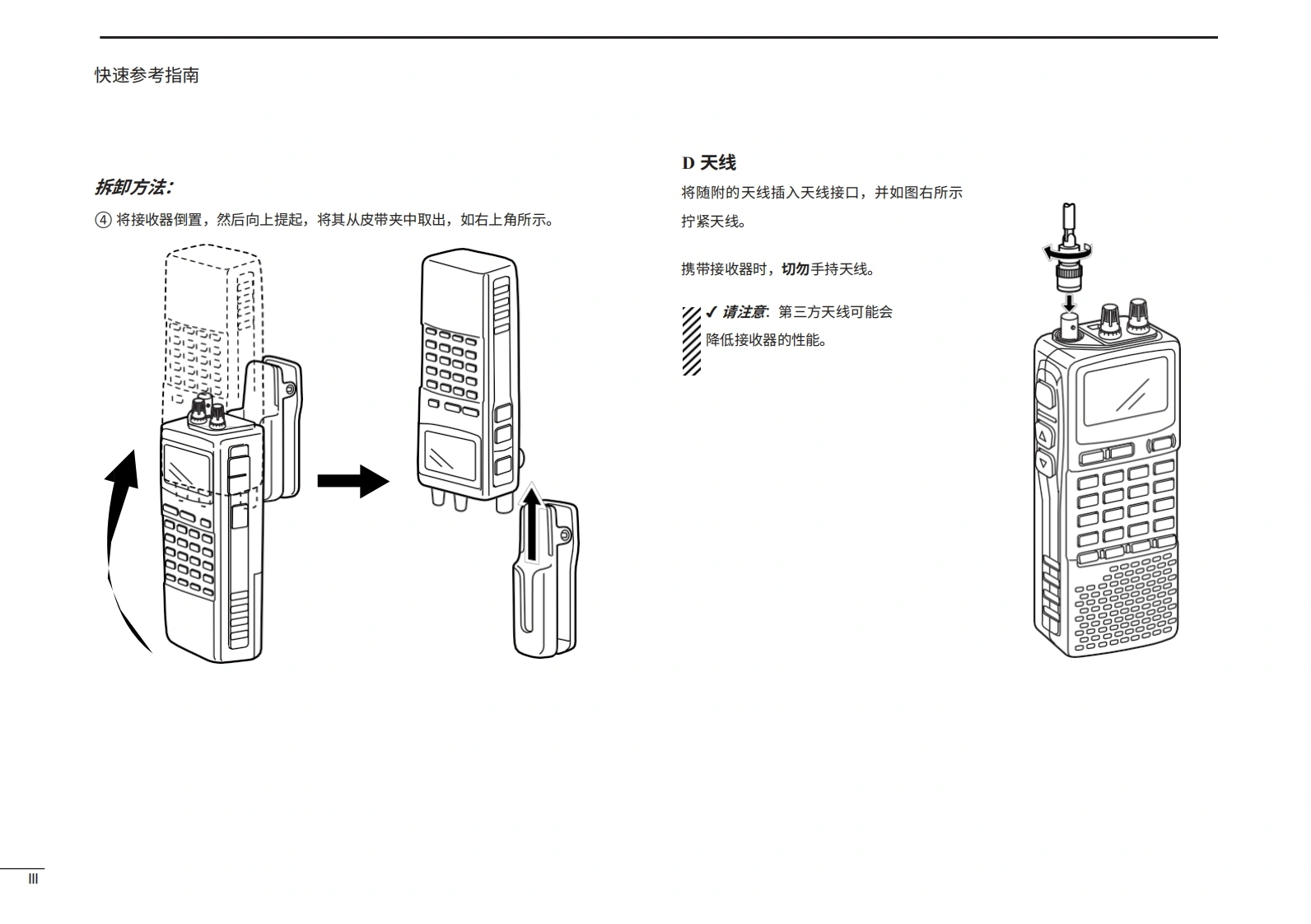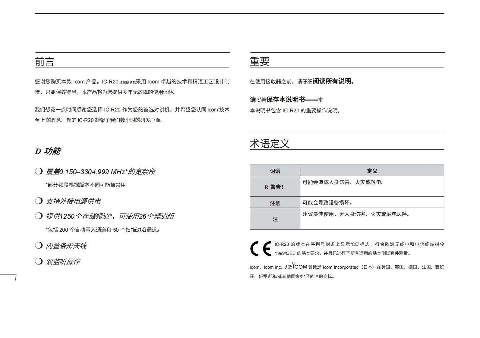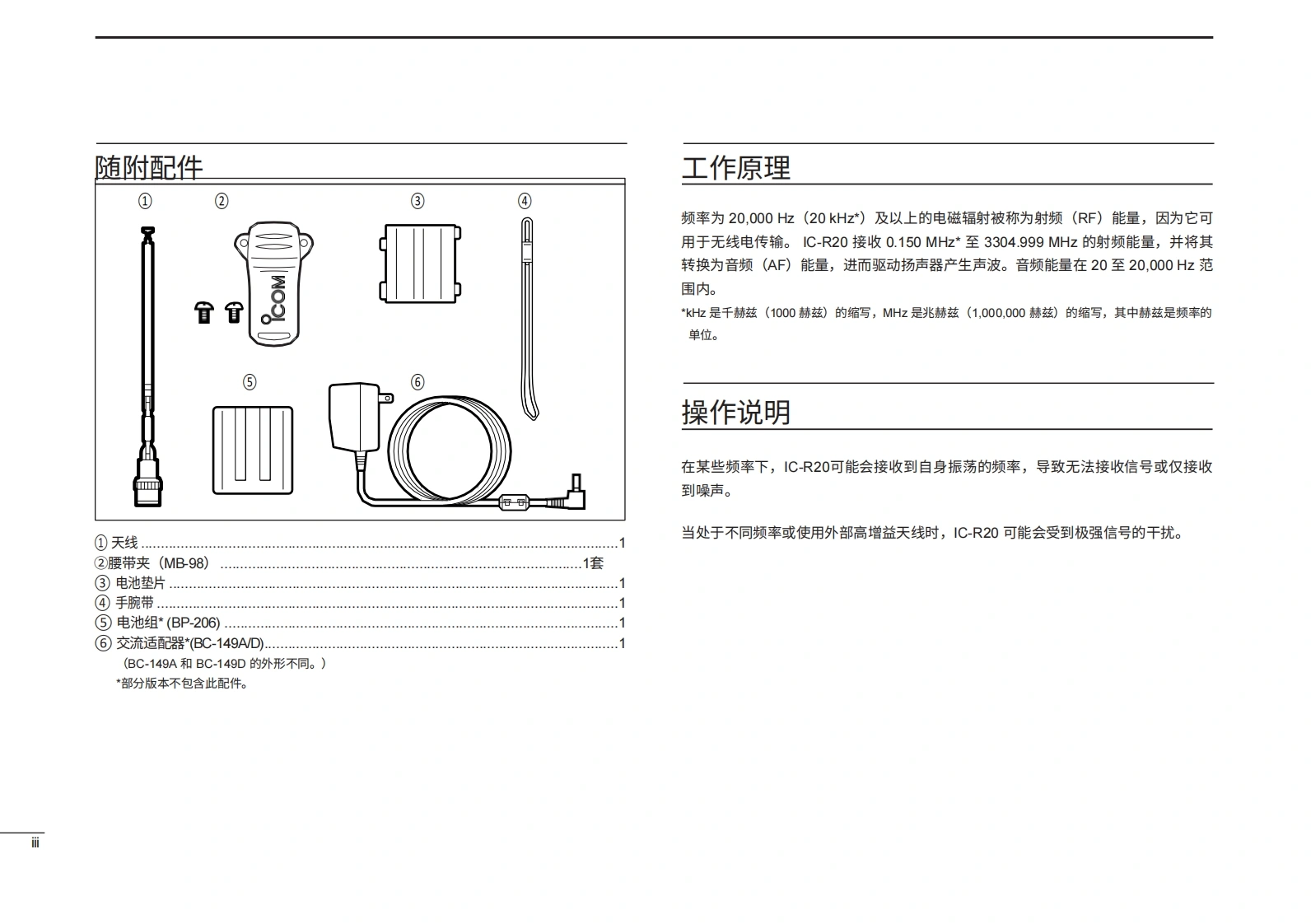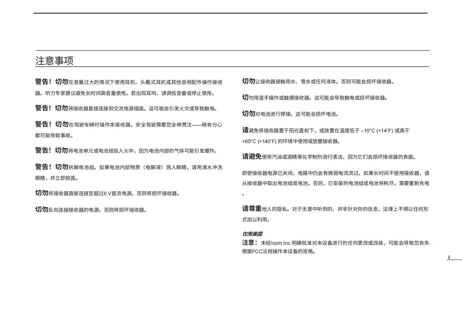 IC-R20_Manual操作说明书手册20260331中文版找手册网10天前发布关注私信8.29MB111页020IC-R20_Manual操作说明书手册20260331中文版此内容为付费资源,请付费后查看¥19¥21黄金会员免费钻石会员免费登录购买付费资源 第1页 / 共111页 第2页 / 共111页 第3页 / 共111页 第4页 / 共111页 第5页 / 共111页 第6页 / 共111页 第7页 / 共111页 第8页 / 共111页 第9页 / 共111页 第10页 / 共111页 试读已结束,还剩101页,您可下载完整版后进行离线阅读 THE END艾可慕 文本预览 COM使用说明书通信接收器iR21C-203304.9999eVoLm999eccc000000本设备符合FCC规则第15部分的规定。其使用须遵守以下两个条件:(1)本设备不得造成有害干扰;(②)本设备必须接受任何接收到的干扰,包括可能导致意外运行的干扰。警告:根据FCC规则和联邦法律,禁止对本设备进行改装以接收蜂窝无线电话服务信号。COMIcom Inc. 查看更多 收起部分 喜欢就支持一下吧收藏