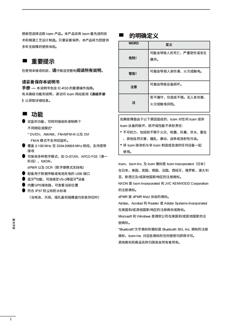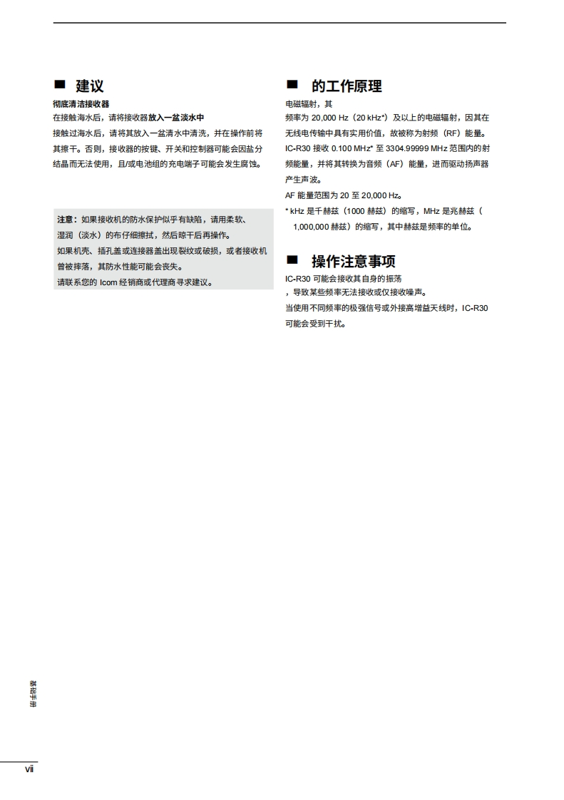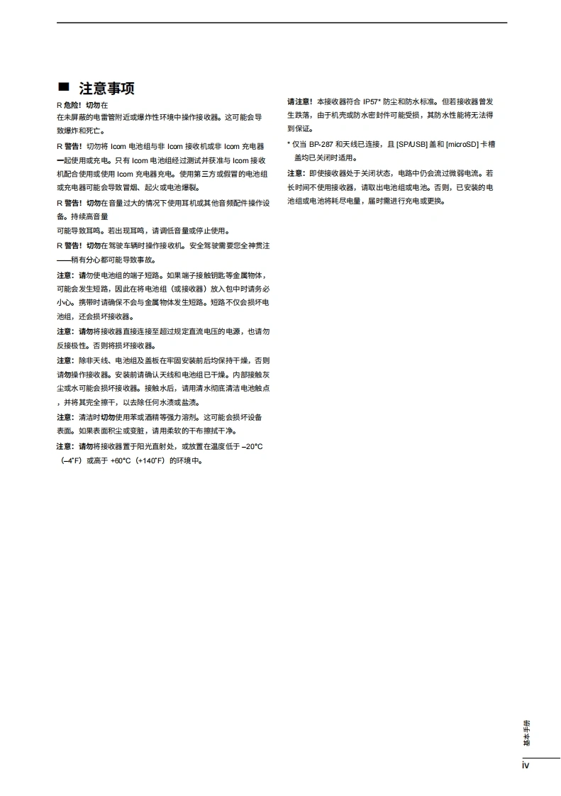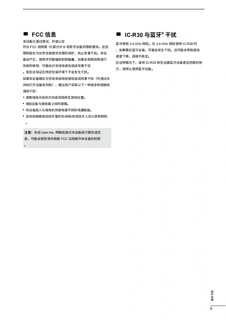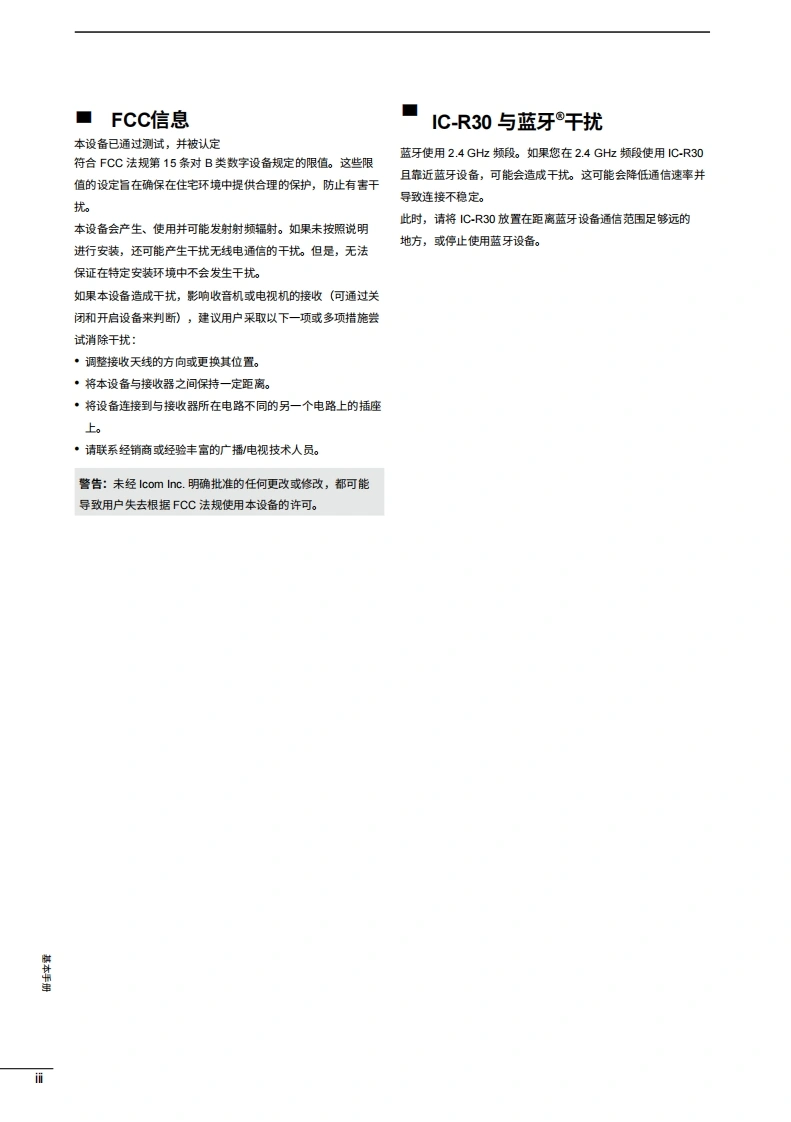 icom是基础手册通信接收器iR3COM@+@01120网本设备符合FCC规则第15部分的规定。使用须遵守以下两个条件:()本设备不得造成有害干扰;(②本设备必须接受任何接收到的干扰,121.600Nar ita RAH断包括可能导致意外运行的干扰。2212警告:根据FCC规则和联邦法律,禁止对本设备进行改装以接收蜂434.400窝无线电电话服务信号。=n四03-04S4 SCAN 5 SCOPE 6 SK7 ATT 8 MW 9 TSIcom Inc.