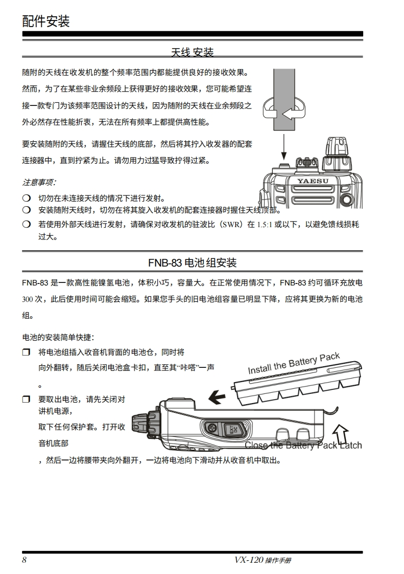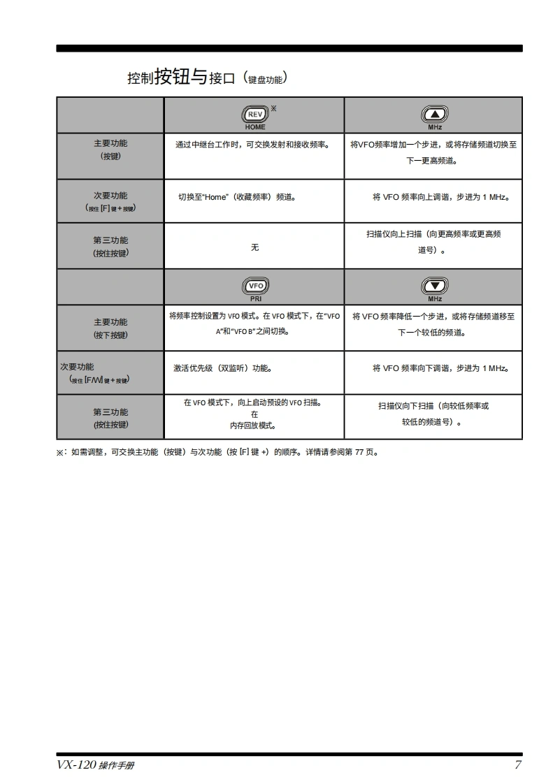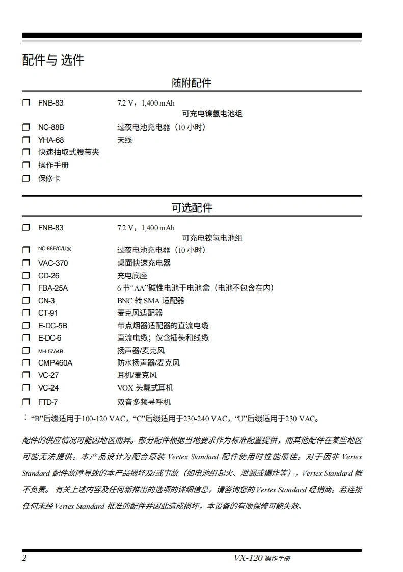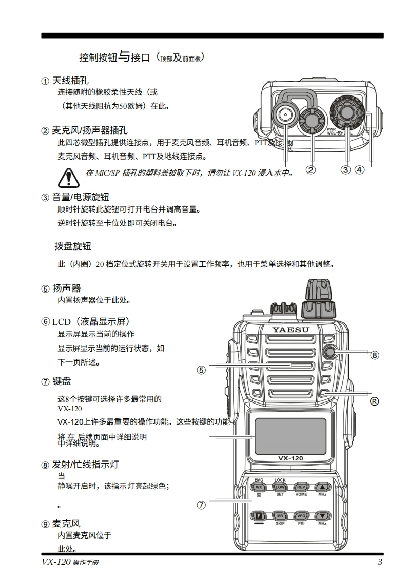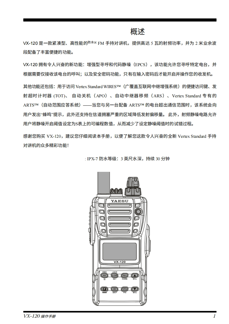 YAESUVHF FM收发机V×-120操作手册YAESU-8-"6520VERTEX STANDARD CO.,LTD日本东京都目黑区中目黑4-8-8,邮编153-8644VERTEX STANDARDVX-120美国总部美国加利福尼亚州赛普里斯市沃克街10900号,邮编90630EMGWXLOWREVYAESU EUROPE B.V.SETP.O.Box 75525,1118 ZN Schiphol,The NetherlandsYAESU UK LTD.MR英国汉普郡温彻斯特温纳尔克洛斯太阳谷商业园12单元,邮编S0230LBVERTEX STANDARD HK LTD.香港九龙观塘海滨道139-141号海景中心20楼5室