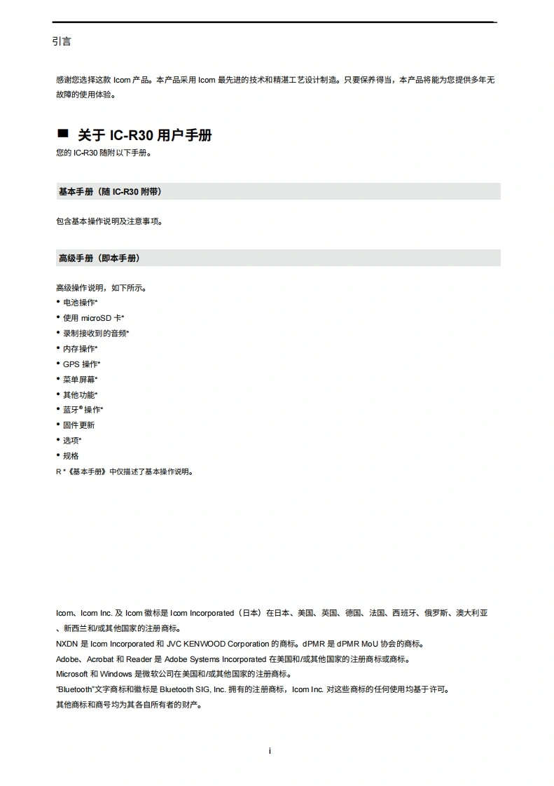 IC-R30_Advanced_Manual操作说明书手册20260331中文版找手册网10天前发布关注私信7.06MB177页038IC-R30_Advanced_Manual操作说明书手册20260331中文版此内容为付费资源,请付费后查看¥19¥21黄金会员免费钻石会员免费登录购买付费资源 第1页 / 共177页 第2页 / 共177页 第3页 / 共177页 第4页 / 共177页 第5页 / 共177页 第6页 / 共177页 第7页 / 共177页 第8页 / 共177页 第9页 / 共177页 第10页 / 共177页 试读已结束,还剩167页,您可下载完整版后进行离线阅读 THE END艾可慕 文本预览 icOm高级手册通信接收器简介iR3O1电源2张microSD卡3录制与播放4存储操作5GPS操作6菜单屏幕7其他功能8蓝牙°操作10选项Icom Inc.11技术规格 查看更多 收起部分 喜欢就支持一下吧收藏