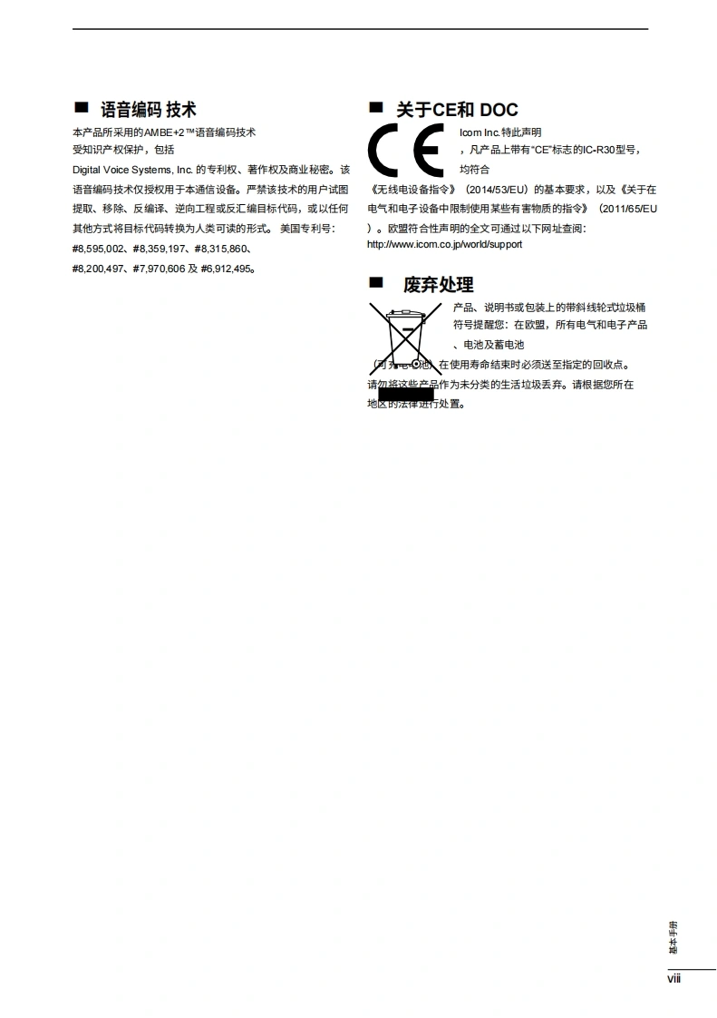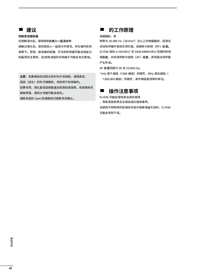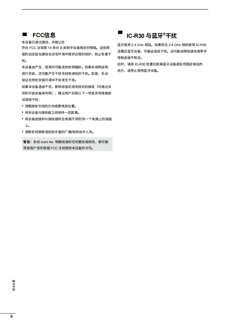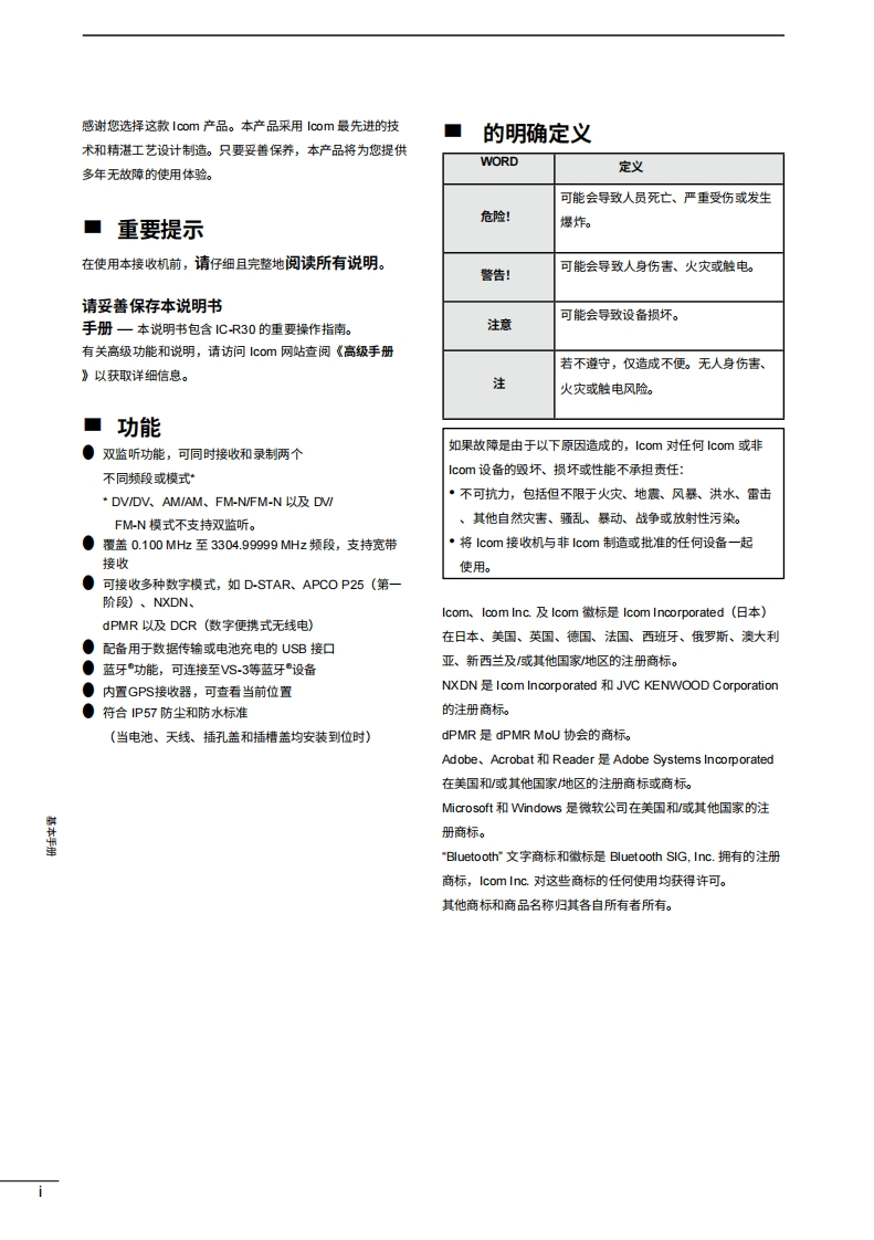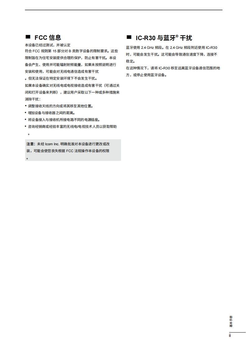 icom是基础手册通信接收器iR3COM@+ew0t120网本设备符合FCC规则第15部分的规定。使用须遵守以下两个条件:()本设备不得造成有害干扰;(②本设备必须接受任句接收到的干扰,121.600Nar ita RAH断包括可能导致意外运行的干扰。2212警告:根据FCC规则和联邦法律,禁止对本设备进行改装以接收蜂434.400窝无线电电话服务信号。=…四030484 SCAN 5 SCOPE 6 SK7 ATT 8 MW 9 TSIcom Inc.IC-R30