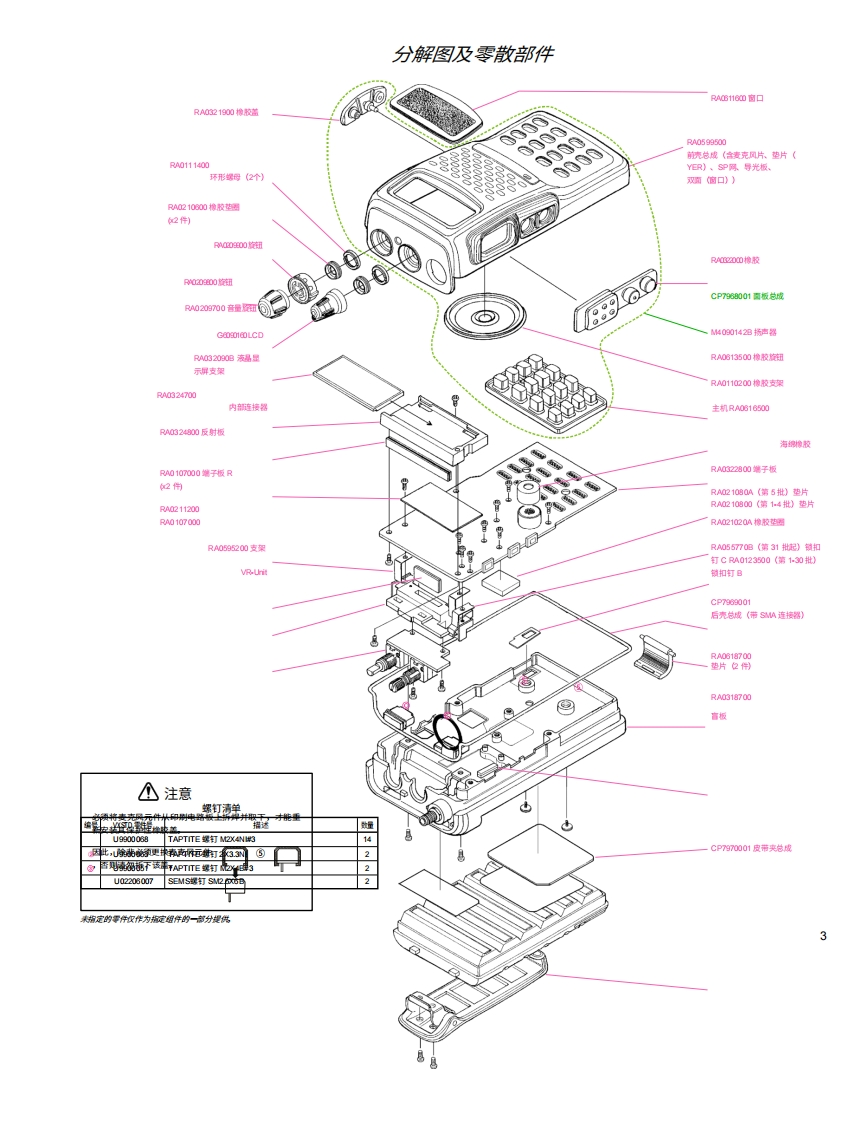 YAESUVERTEX STANDARDCO.,LTD.日林京日黑4,四-VERTEX STANDARD奥国士利呢正辆借新有天说衡0四0四号,邮0四FT-60R国标零女超YAESU EUROPE B.V.P.段Bax7码Ia2 N Scphol The Nherandh技术补充说明YAESU UK LTD.舞国汉赠都到科遇纳惊克新我路两2元,邮罐:功四心VERTEX STANDARD HK LTD.C2005 VERTEX STANDARD CO.,LTD.EHO17M90B看港大支现流湖黄随41号海量中心过横5置简介本手册提供了维修FTB0 R VHF/UHF双频段收发机所需的技术信息。维修本设备需要具备处理表面贴装芯片元件的专业技能。未经授权的人员尝试维修本设备可能会导致永久性损坏,此类损坏不在保修范围内,且在某些国家可能属于违法行为。本收发器中每块双面电路板均提供两张PCB布局图。电路板的每一面均以其安YAESU装的大部分元件的类型来命名A面或B面)。在大多数情况下,一侧仅含芯片元件(表面贴装器件),另一侧则混合了芯片元件和引线元件(微调器、线圈、电解电容器、集成电路等),或仅含引线元件。尽管我们相信本手册中的信息准确无误,但VERTEX STANDARD对因可能存在的排版或其他错误而造成的任何损失概不负责。如您发现技术信息中存在任何不FM TRANSCEIVER FT-6O一致之处,数请告知,我们将不胜感激。常是需9目录SETBAND D制而+@可@规格.2分解图及家项零件框图电路说明.对济电路单元(原理图、布局与元器件)主单元13VR单元:1
