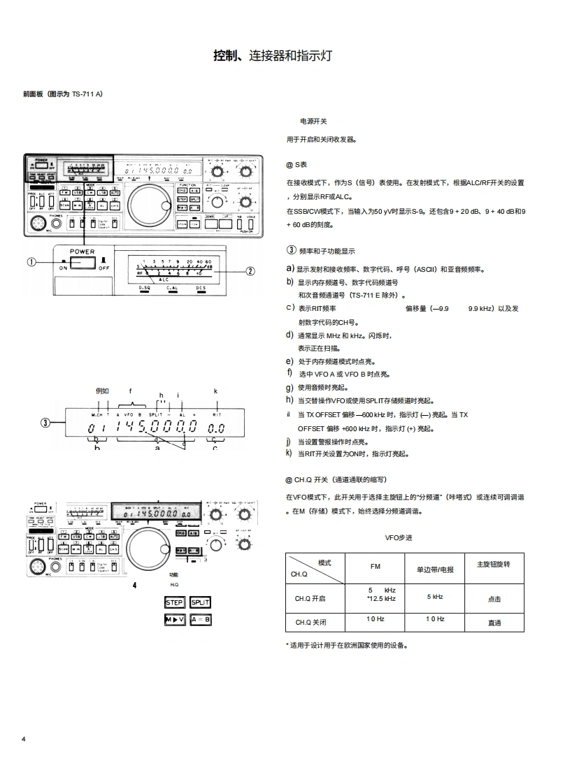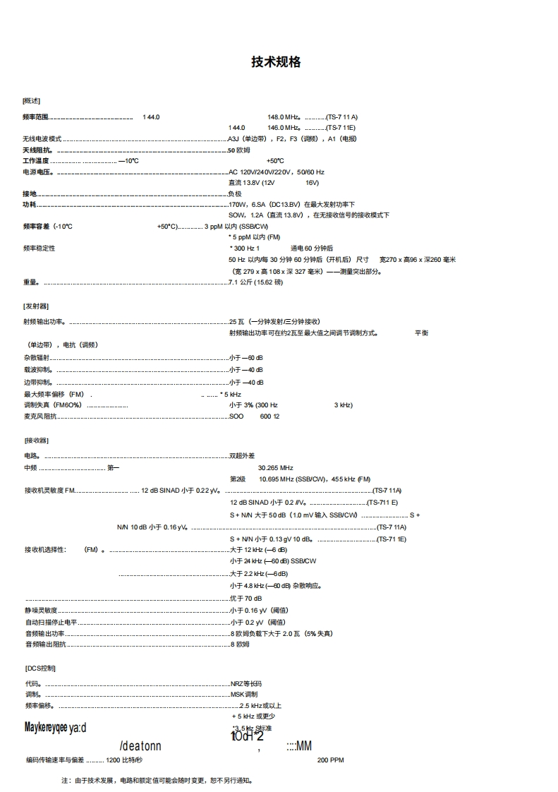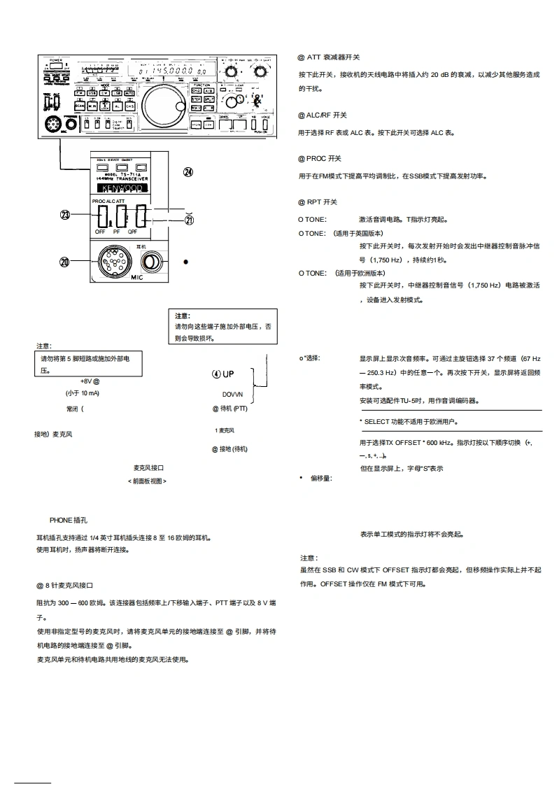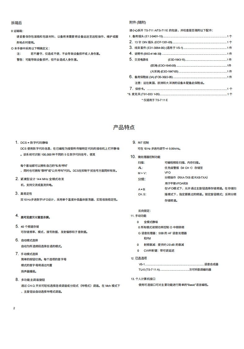KENTOODTS-711A/E144Hz全模式收发机使用说明书y50008&8品品品品品116iii三图示为TS711A板本,感谢您购买我们的最新产品一TS711AWE收发机。在开始使用收发机之前,请仔细阅读本说明书。本设备经过精心设计,并按照严格的质量标准制造,应能为您提供多年令人满意且可靠的使用体验。目录附件(随粉)一产品特点2规格.3控制装置、连接器和指示灯.……操作自动操式设置.11调诺频率.…初始频率设置….11通过蜂鸿声确认….11HM操作.11单边带SS)操作2电报操作.13卫星通信,13功能控制5开关14数字功能….15扫猫.15警报操作DCS系统功能,16固定站操作19移动安装概闼。19维护与调整。20故障排除。.22附件(选配)23电路说明。25框图28PLL单元原理图.29