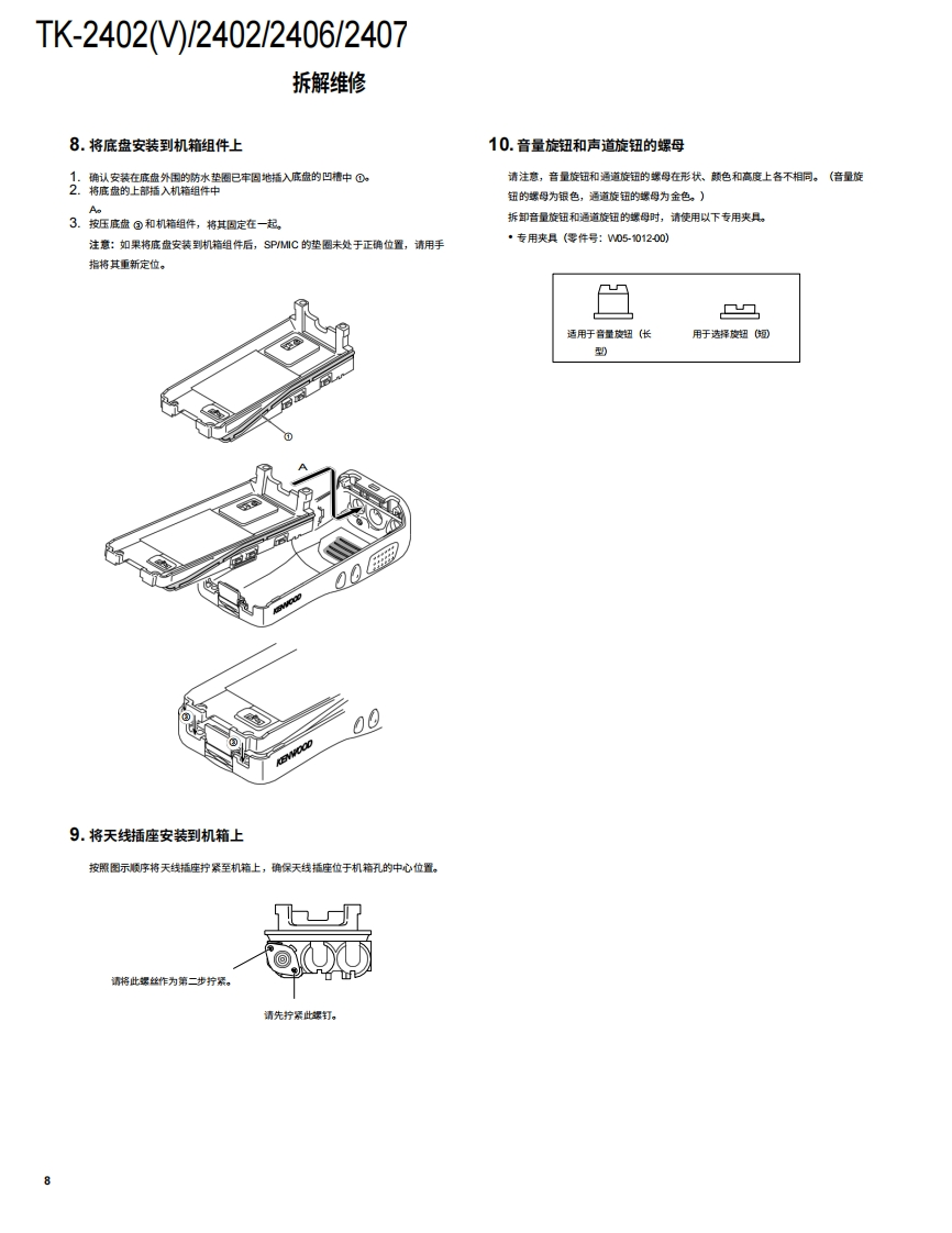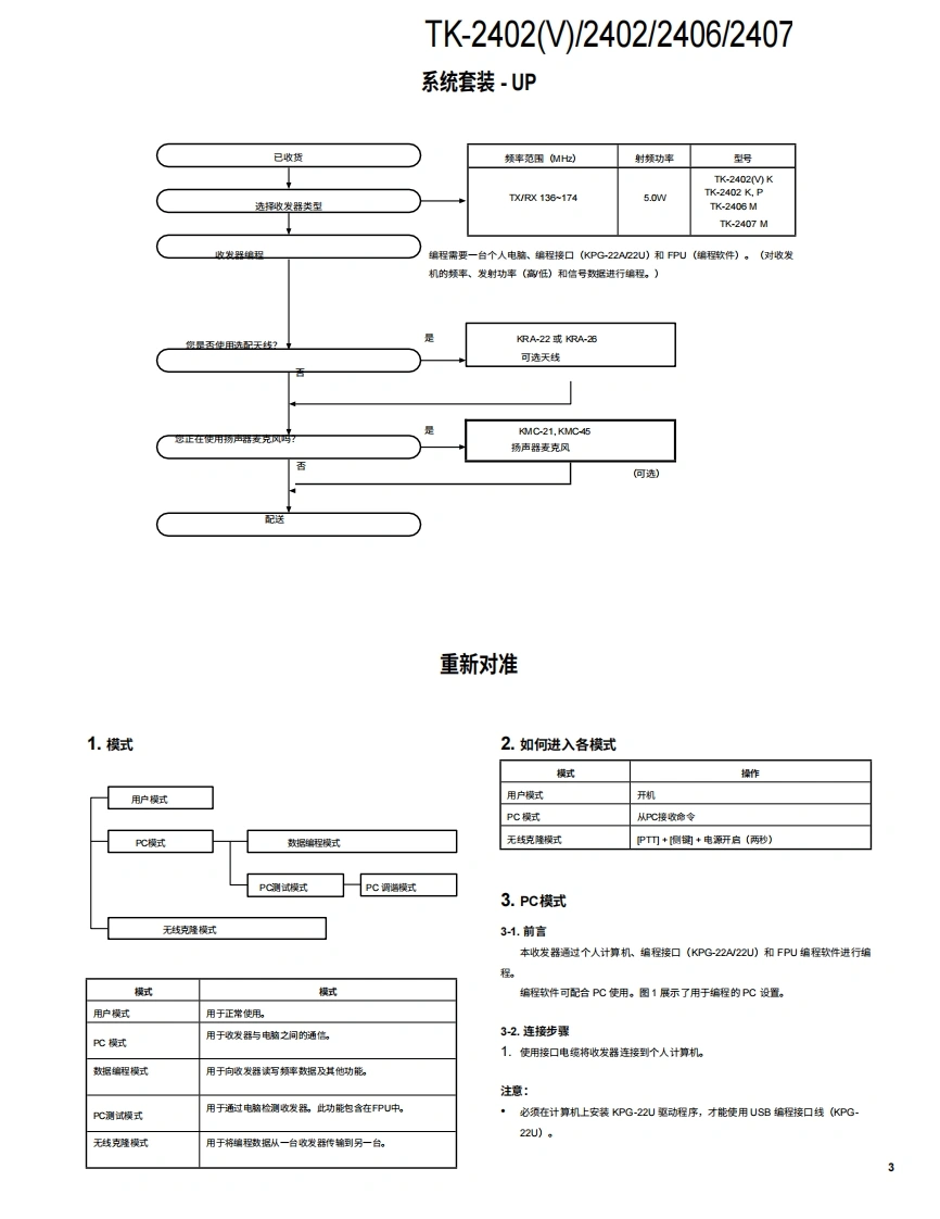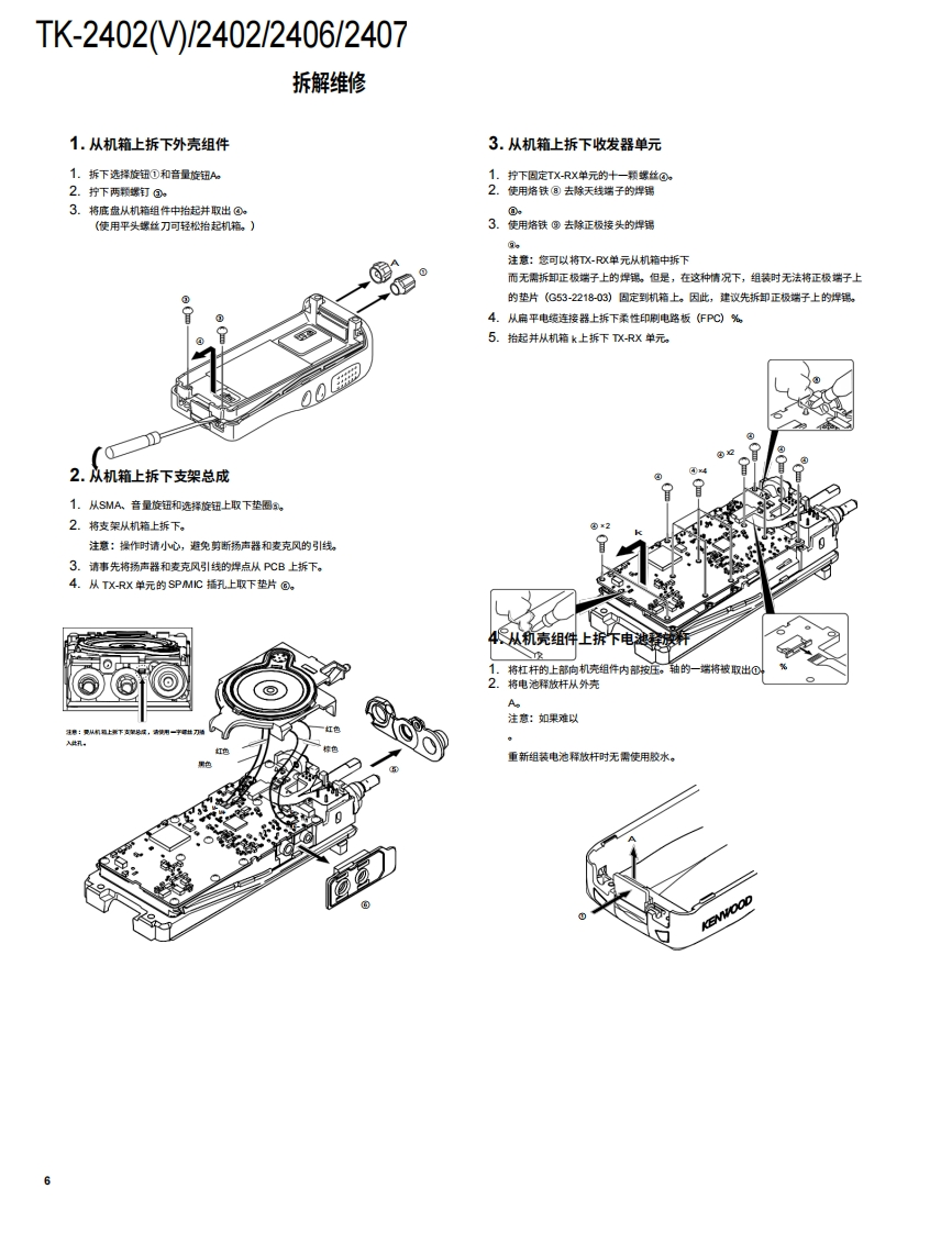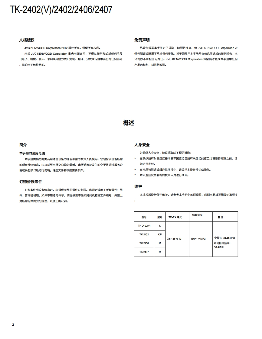 HFFM收发机TK-2402)/2402TK-KENWOOD2406/2407JVCKENWOOD Corporation维修手册2012-11日本印刷B53-7040-00Y0669目录通用系统设置重新对齐..3拆卸维修.….6电路说明…螺旋天线旋钮选择器》(T901038-1与:TK-2402MK249615030半导体数据…...14TK2402旋超(倍量(K29元件说明.….15g时14-030零件清单.16分解图…22包装..23KENWOOD调整…25PCB按钮旋钮PTT)K2丝收发器单元(X57-8310-10)309612-03)原理图.34按钮旋钮(SIDE1/SIDE2)功能框图..38K299613030电平图技术规格..41望科机柜总成(A02-420003LF