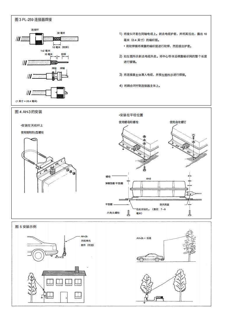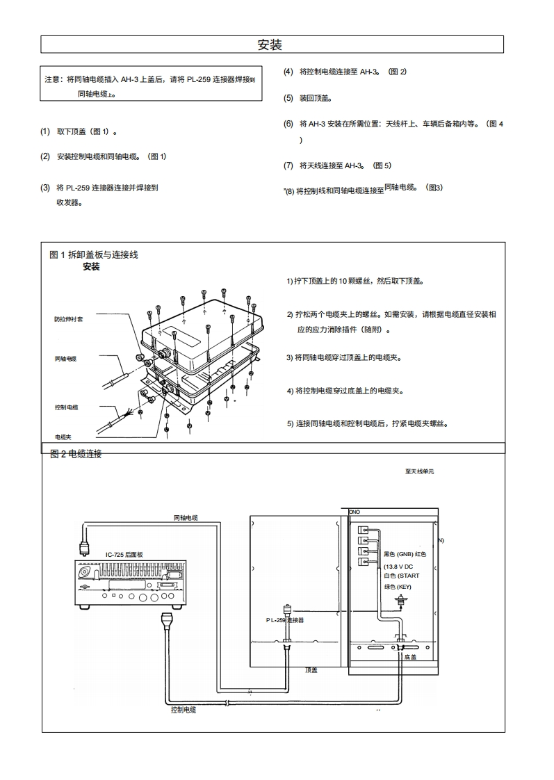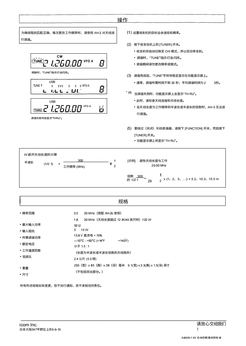 iCOM感谢您购买AH-3HF自动天线调谐器。AH3可将您的收发机与长度INSTRUCTIONS超过3米/10英尺(3.5M:及以上)或超过12米/40英尺(1.8HF AUTOMATIC ANTENNA TUNERMH忆及以上)的天线进行匹配。AH-3在安装和操作AH3之前,请仔细阅读本手册。危险?切勿在未接地的情况下使用本调谐器。操作前,请务必通过接地端子将调谐器接地。切吻切勿使用安装板进行接地。接地渊子切勿在未连接天线的情况下进行发射或调诺。若未使用天线,将损怀调诺器。安装板高压!在发射或调谐时,切勿触摸天线。将天线放置放置在您确定不会被触碰的位置。功能宽调谐范围八频段存储功能,调谐更吏快捷AH-3能为5.5MH位至30MH位的频率提供可靠的匹配AH3会自动存储先前使用过的8个频率的LC组合。一旦频率被存储,0.5MH化至3.5MHz的频率范围内提供句靠的匹配,前提是使用至少3米AH-3可在1秒内完成该频率的调诺。请注意,AH-3不会存储通常在2.5秒内(10英)长的天线,例如AH2b天线单元(带50厘米引)。即可调诺的频率。存储数据仅在电源开启时保留。在18M以上工作时,请使用至少12米(40英尺防风雨设计天线。自动数字控制调诺AH3采用密封性极佳的望料外壳,便于安装。内置的8位微处理器会从超过260,000种不同的LC组合中选择阻抗最小的几乎任何位置安装。AH3可安装在天线下方,在超过26万种不同的LC(线圈电容器)组合中选择最优的(线园/电容器)组合中选择最低的0.3W辐射功率调诺过程中的辐射功率小于0.3W,最大限度地避免对其他电台造成干扰。解包①u型螺检③U型螺检垫片。①⑦平垫国(M8大号》⑤平垫图(M6小号》②口洋簧垫国8)⑦③⊙⊙⊙⊙螺母M6⊙⊙⊙⊙■T⑨⑨六角头螺栓(M8x50)自攻螺丝A06x30④©回⊙◎①防拉力村套⑤0009@000①PL259连接器@回回回回回回回回0防风两盖…1控制电缆(5米,带连接器组件).1