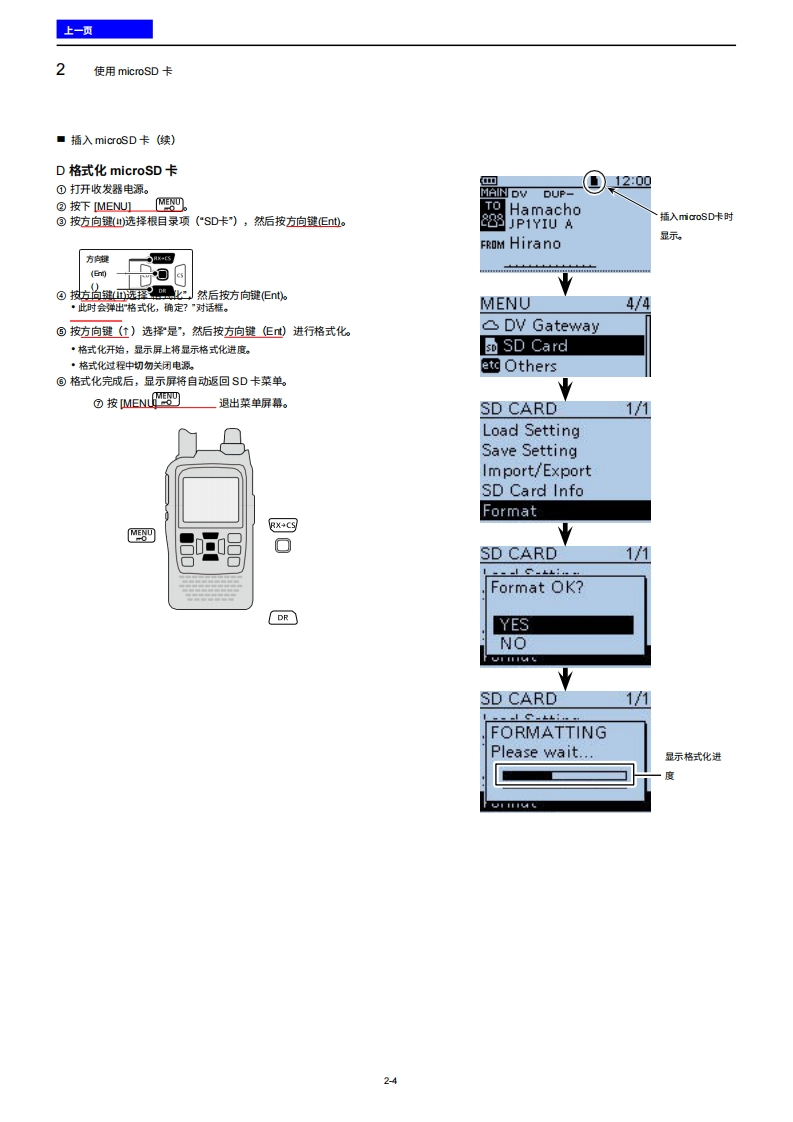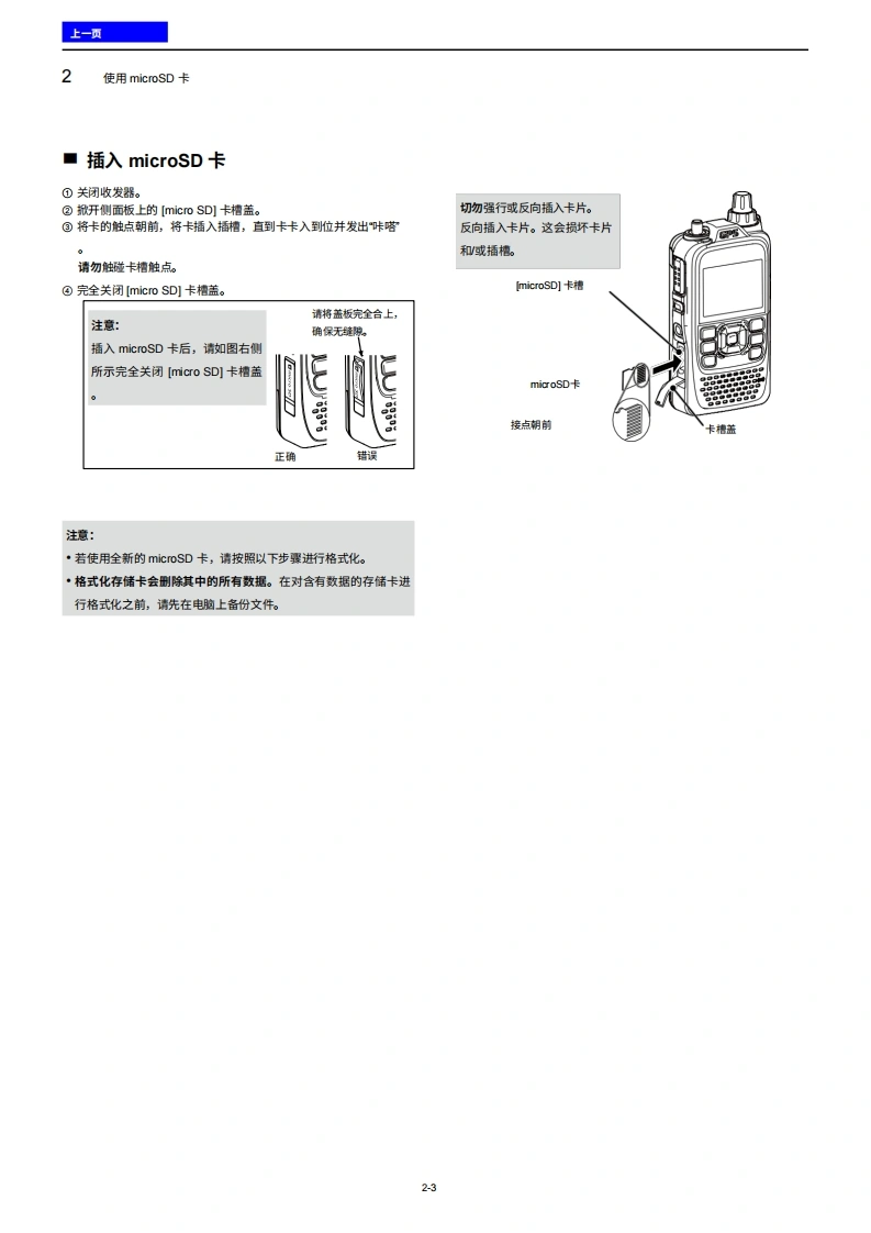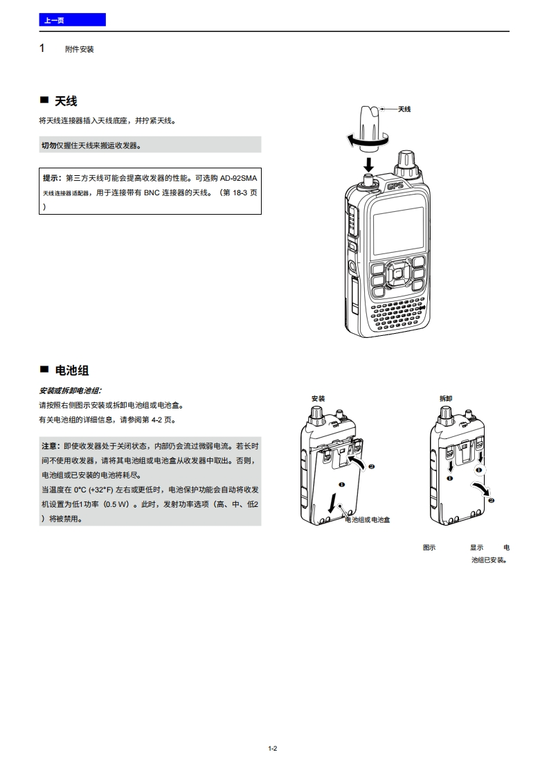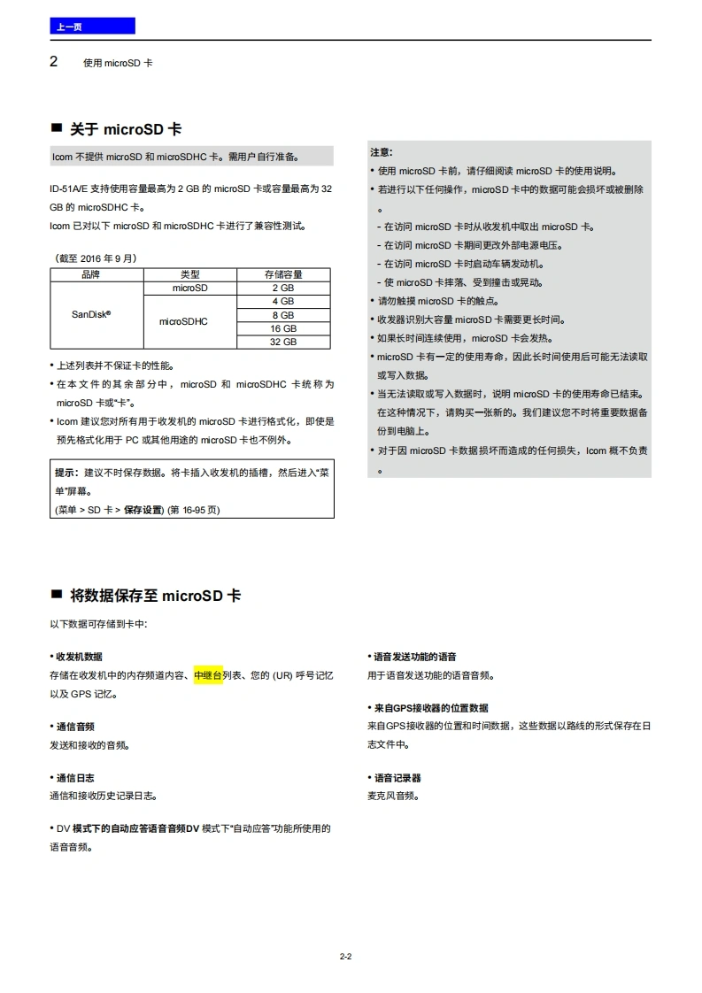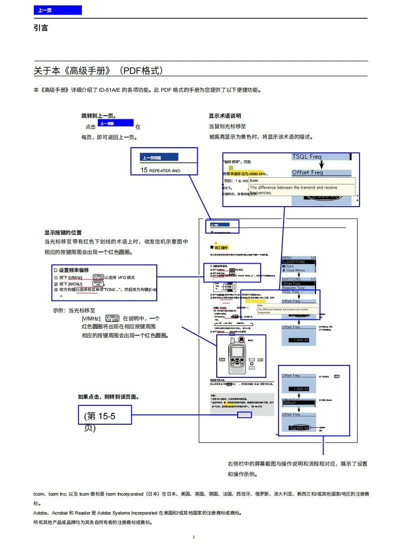 icOM要更新中继器列表,请点击此处!高级手册简介1附件安装2使用MicroSD卡3面板说明4电池充电VHF/UHF收发机5基本操作ID-51AID-51E6BC无线电操作D-STAR简介8D-STAR操作<基础9D-STAR操作<进阶>10GPS操作11语音记忆功能12存储操作13扫描操作14优先闹钟15中继器和双工操作本手册中描述了高级操作说明和更多详细信息请参阅《基础手册》以开始使用D-STAR,新用户尤其如此。16菜单屏幕17其他功能18选项19技术规格故障排除索引菜单项索引Icom Inc.