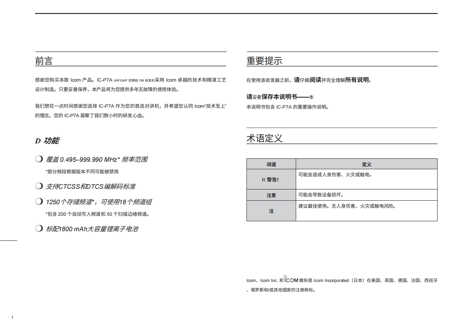 icp7a_使用说明书手册20260331中文版找手册网10天前发布关注私信11.21MB102页032icp7a_使用说明书手册20260331中文版此内容为付费资源,请付费后查看¥19¥21黄金会员免费钻石会员免费登录购买付费资源 第1页 / 共102页 第2页 / 共102页 第3页 / 共102页 第4页 / 共102页 第5页 / 共102页 第6页 / 共102页 第7页 / 共102页 第8页 / 共102页 第9页 / 共102页 第10页 / 共102页 试读已结束,还剩92页,您可下载完整版后进行离线阅读 THE END艾可慕 文本预览 iCOM使用说明书HF/UHF双频段FM收发机ICOMIC-P7A43.5500n802999本设备符合FCC规则第15部分的规定。使用须遵守以下两个条件:(1)本设备不得造成有害干扰;(2)本设备必须接受任何接收到的干扰,包括可能导致意外运行的干扰。BAND警告:根据FCC规则和联邦法律,禁止对本设备进行改装以接收蜂窝无线电电话服务信号。S LOCKIcom Inc.●●●S NW●●●●●SET 查看更多 收起部分 喜欢就支持一下吧收藏