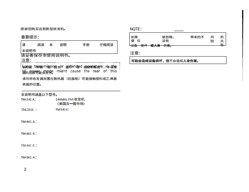 建武Kenwood_TM-241_441_541_Manual操作说明书手册中文版找手册网10天前发布关注私信9.75MB63页027建武Kenwood_TM-241_441_541_Manual操作说明书手册中文版此内容为付费资源,请付费后查看¥19¥21黄金会员免费钻石会员免费登录购买付费资源 第1页 / 共63页 第2页 / 共63页 第3页 / 共63页 第4页 / 共63页 第5页 / 共63页 第6页 / 共63页 第7页 / 共63页 第8页 / 共63页 第9页 / 共63页 第10页 / 共63页 试读已结束,还剩53页,您可下载完整版后进行离线阅读 THE END建武 文本预览 144 MHz FM收发机TM-241A/241E430/440 MHz FM收发机KENWOODTM-441A/441E1200 MHz FM收发机TM-541A/541E说明书KENWOOD CORPORATIONCB6200313012111009080706050403 查看更多 收起部分 喜欢就支持一下吧收藏