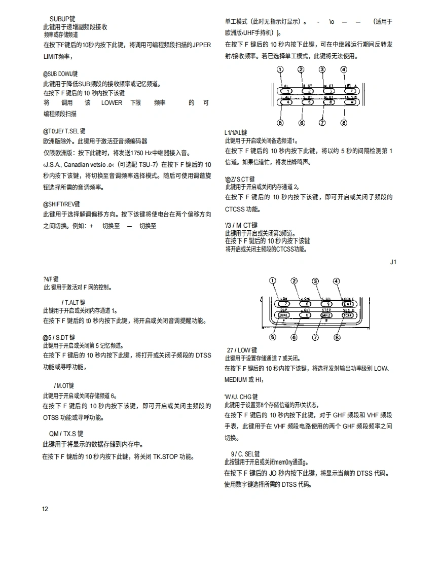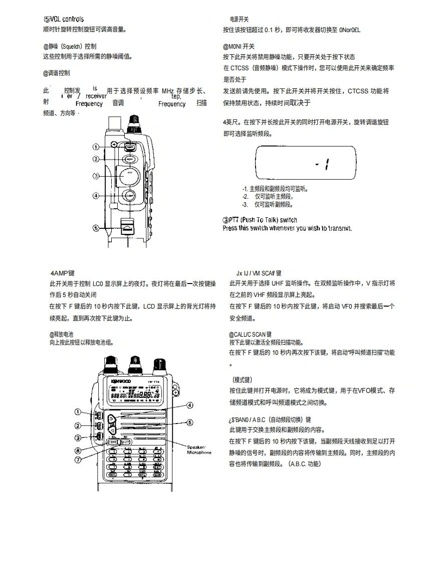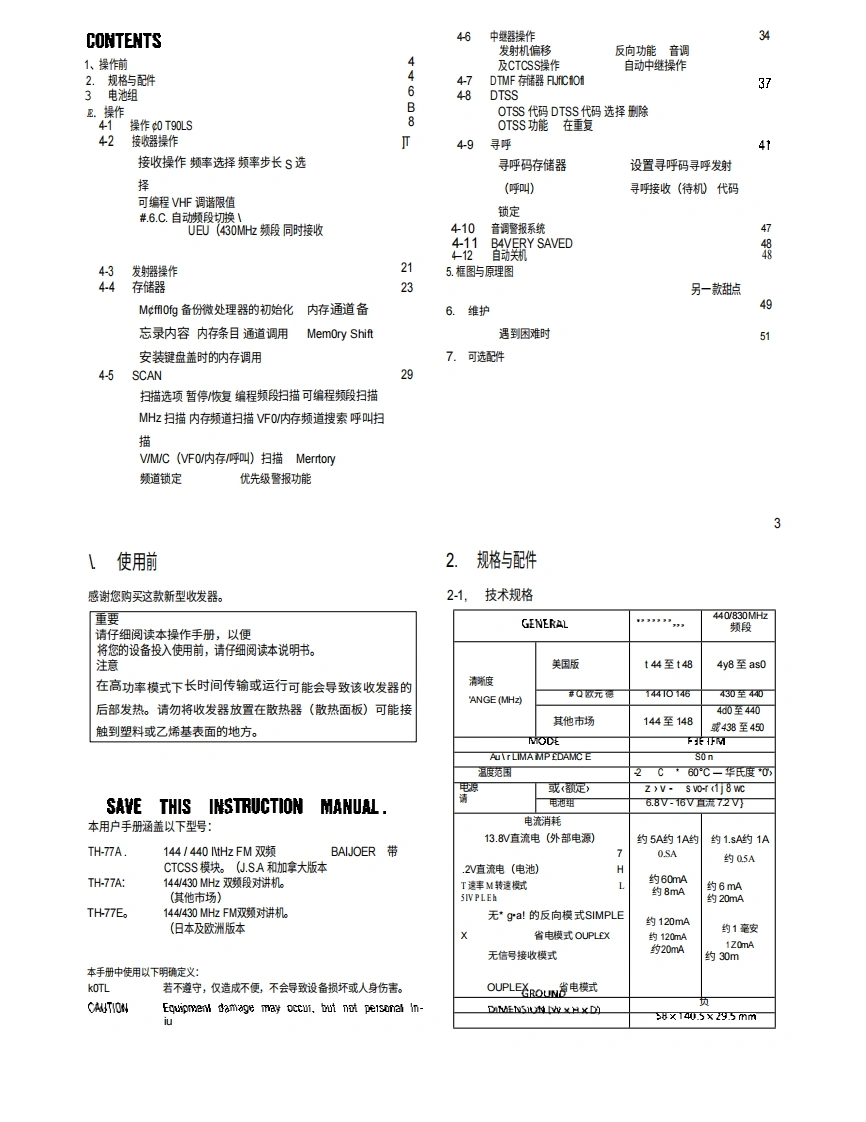 144/430 MHz FM双频段对讲机144/440 MHz FM双频对讲机TH-77AKENWOOD144/430 MHz FM双频对讲机TH-77E使用说明书cENWOOD COFIPORATtON日本印刷B62O710fk,T可9Z1211T098765432191/4211109g765FCCw'告This设备energy.可能会产生或使用射频对本设备内嵌件的更改或修改可能会导致有害干扰除非任何修改必须明确获得《使用说明书》的批准。如果进行未经授权的更改,用户可能会丧失操作本设备的权限0进行修改。按下电源开关长于0.1秒以上,以关闭收发机在固定台操作期间,随附的天线可能会导致对附近电子设备造成干扰。它还会增加来自外部直流电源的供电电压。为避免这些情况,可使用低增益的外部天线。高增益型天线可能导致互调失真。