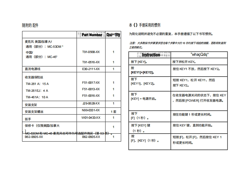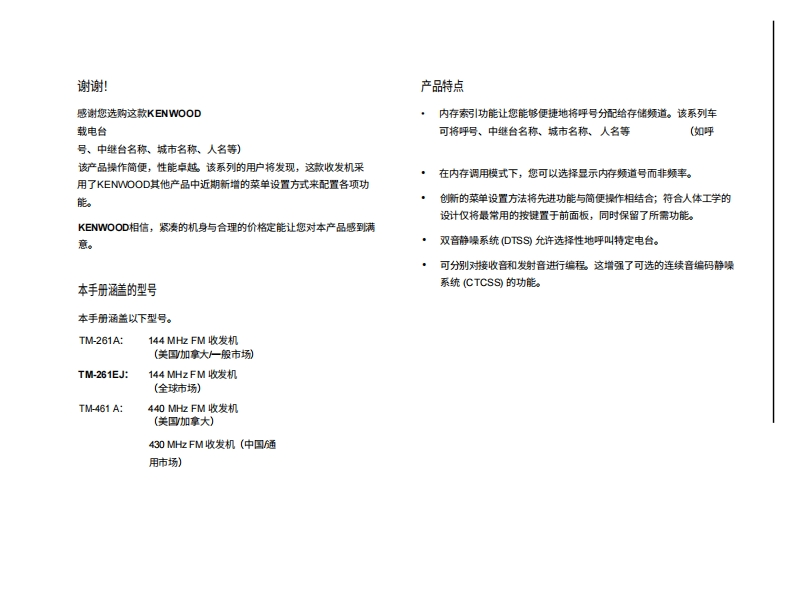 建武TM-261操作说明书手册中文版找手册网10天前发布关注私信10.20MB66页045建武TM-261操作说明书手册中文版此内容为付费资源,请付费后查看¥19¥21黄金会员免费钻石会员免费登录购买付费资源 第1页 / 共66页 第2页 / 共66页 第3页 / 共66页 第4页 / 共66页 第5页 / 共66页 第6页 / 共66页 第7页 / 共66页 第8页 / 共66页 第9页 / 共66页 第10页 / 共66页 试读已结束,还剩56页,您可下载完整版后进行离线阅读 THE END建武 文本预览 144MH也FM收发机TM-261AKENWO144MH2FM收发机TM-261EJ430/440 MHz FM收发机TM-461A用户手册KENWOOD CORPORATION@B820805-00K,M,C090g0708050403020100 查看更多 收起部分 喜欢就支持一下吧收藏