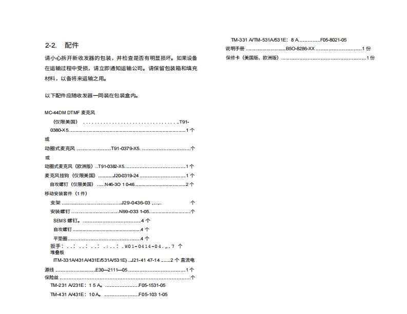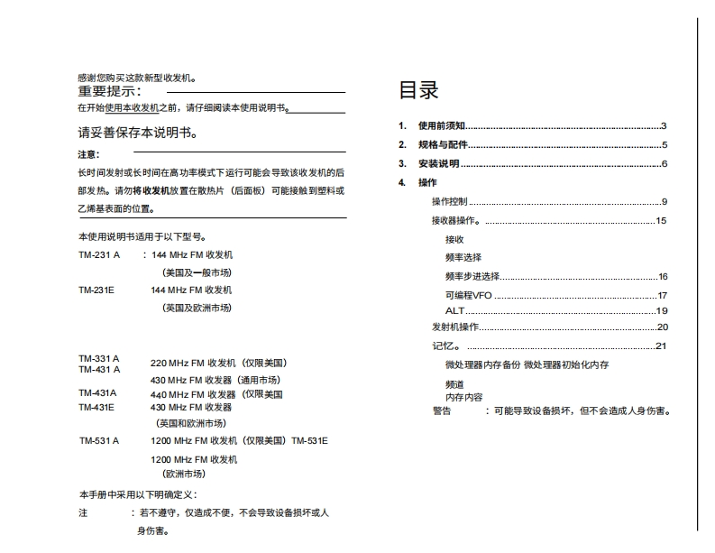 建武TM-531操作说明书手册中文版找手册网10天前发布关注私信5.40MB42页050建武TM-531操作说明书手册中文版此内容为付费资源,请付费后查看¥19¥21黄金会员免费钻石会员免费登录购买付费资源 第1页 / 共42页 第2页 / 共42页 第3页 / 共42页 第4页 / 共42页 第5页 / 共42页 第6页 / 共42页 第7页 / 共42页 第8页 / 共42页 第9页 / 共42页 第10页 / 共42页 试读已结束,还剩32页,您可下载完整版后进行离线阅读 THE END建武 文本预览 144 HZ FM收发却TM-2S1A/2S1EKE NWO220MzFM收发机TM-331A440/430 MHz FM收发机TM-43JA/431E1200 MHz FM收发机TM-S31A/S31E用户手册KENWOOD CORPORATION日本印刷B50-8286-20(K,M,W,T①90121110987654321891211109876 查看更多 收起部分 喜欢就支持一下吧收藏
