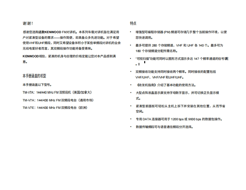 建武TM-V7E_使用说明书手册中文版找手册网10天前发布关注私信22.70MB111页038建武TM-V7E_使用说明书手册中文版此内容为付费资源,请付费后查看¥19¥21黄金会员免费钻石会员免费登录购买付费资源 第1页 / 共111页 第2页 / 共111页 第3页 / 共111页 第4页 / 共111页 第5页 / 共111页 第6页 / 共111页 第7页 / 共111页 第8页 / 共111页 第9页 / 共111页 第10页 / 共111页 试读已结束,还剩101页,您可下载完整版后进行离线阅读 THE END建武 文本预览 144/440MHz双频段调频对讲机TM-V7A144430 MHz FM双频对讲机KENWOODTM-V7A144/430MH2FM双频对讲机TM-V7E用户手册KENWOOD CORPORATIONE52-0578-00XEM09080705050403020100 查看更多 收起部分 喜欢就支持一下吧收藏