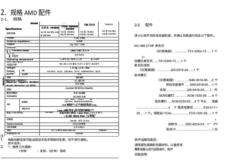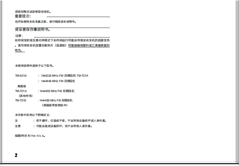建武tm621-721-series_使用说明书手册中文版找手册网10天前发布关注私信5.66MB42页023建武tm621-721-series_使用说明书手册中文版此内容为付费资源,请付费后查看¥19¥21黄金会员免费钻石会员免费登录购买付费资源 第1页 / 共42页 第2页 / 共42页 第3页 / 共42页 第4页 / 共42页 第5页 / 共42页 第6页 / 共42页 第7页 / 共42页 第8页 / 共42页 第9页 / 共42页 第10页 / 共42页 试读已结束,还剩32页,您可下载完整版后进行离线阅读 THE END建武 文本预览 144/220 MHz FM双频对讲机TM-621A144/440 MHz FM双频对讲机TM-721A144/430 MHz FM双频段对讲机TM-721ATM-721E使用说明书KENWOOD CORPORATION日本印刷B50-8225-10(K,M,T.W)(T89/12111098765432188/12111098 查看更多 收起部分 喜欢就支持一下吧收藏