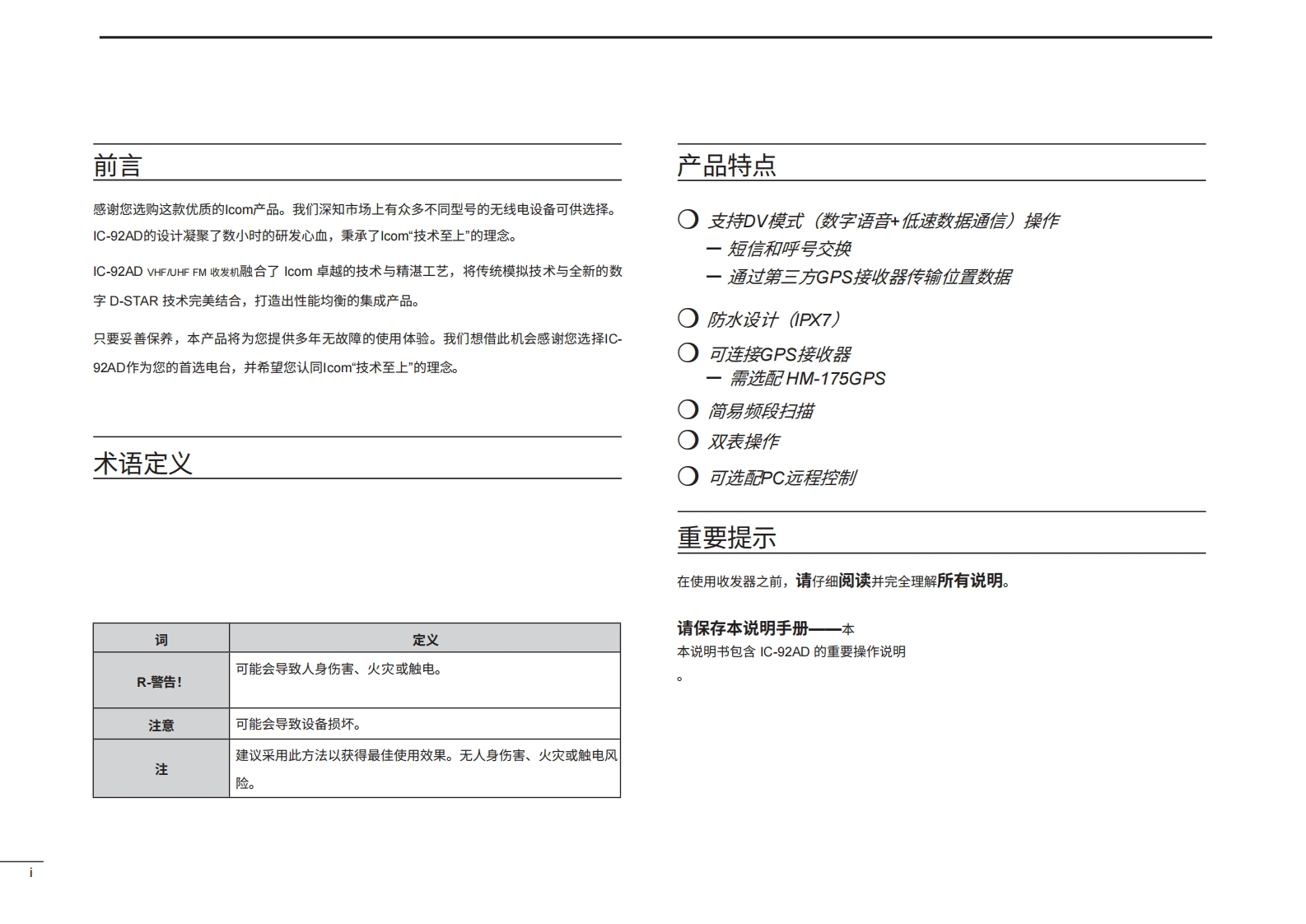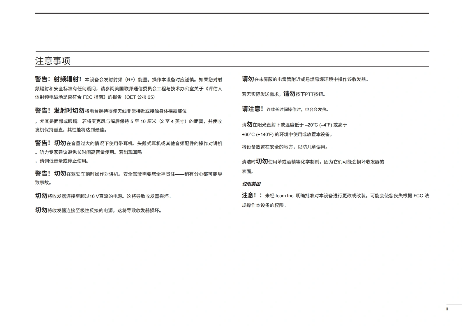 艾可慕ic92ad_使用说明书手册20260331中文版找手册网10天前发布关注私信6.12MB163页037艾可慕ic92ad_使用说明书手册20260331中文版此内容为付费资源,请付费后查看¥19¥21黄金会员免费钻石会员免费登录购买付费资源 第1页 / 共163页 第2页 / 共163页 第3页 / 共163页 第4页 / 共163页 第5页 / 共163页 第6页 / 共163页 第7页 / 共163页 第8页 / 共163页 第9页 / 共163页 第10页 / 共163页 试读已结束,还剩153页,您可下载完整版后进行离线阅读 THE END艾可慕 文本预览 COM使用说明书VHF/UHF数字收发机i92A)ICOM-92FO a9本设备符合美国联邦通信委员会(FCC)规则第15部分的规定。使用本设备须遵守以下两项条件:(1)本设C-92A0备不得造成有害干扰;(②)本设备必须接受任何接收到的干扰,包括可能导致意外运行的干扰。警告:根据FCC规则和联邦法律,禁止对本设备进行改装以接收蜂窝无线电电话服务信号。Icom Inc.D-7A月 查看更多 收起部分 喜欢就支持一下吧收藏
