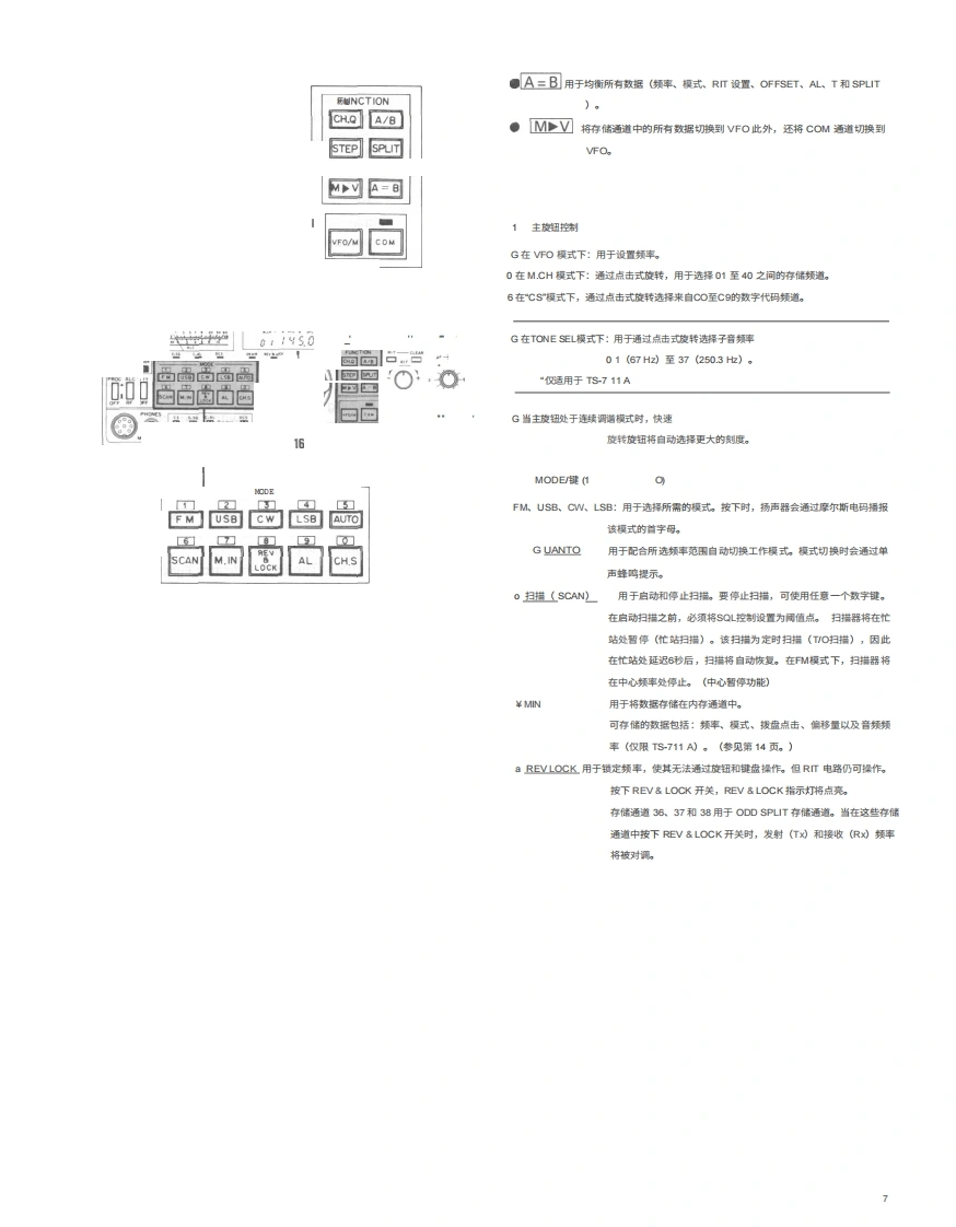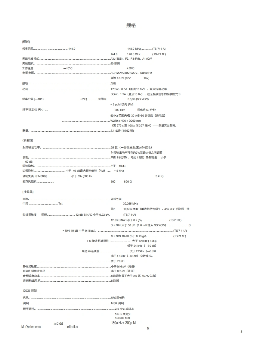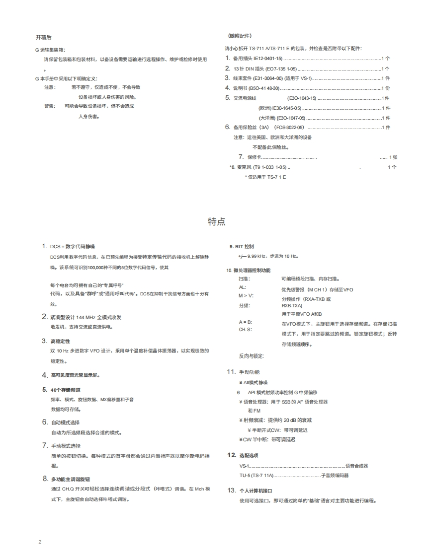 KENIVO ODTS-711A/E144MHz全模式收发机使用说明书0:450800c9品品品品©可iii图示为TS711A板本,感谢您购买我们的最新产品一TS711AWE收发机。在开始使用本收发机之前,请仔细阅读本使用说明书。本设备经过精心设计并按照严格的质量标准制造,应能为您提供多年令人满意且可靠的运行。目录附件(随)2产品特点2规格.3控制装置、连接器和指示灯。操作自动模式设置11拔号频率。11初始频率设置11通过蜂鸿声确认11FM操作。。11单边带(SS8操作12电报操作。卫星通信.功能控制与开关14数字功能一扫描.警报操作。专DCS系统功能6国定站操作.…19移动安装概述的维护与调整。20故障州除。22附件(何选电路说明25框图,凡L单元原理图