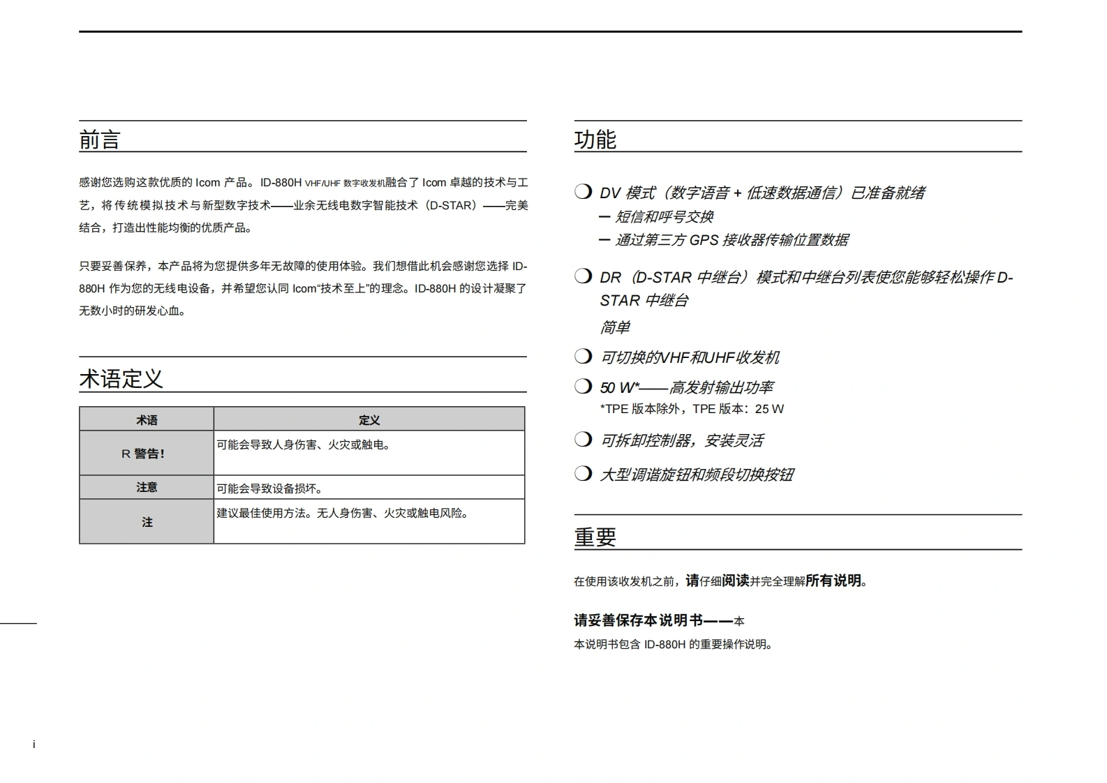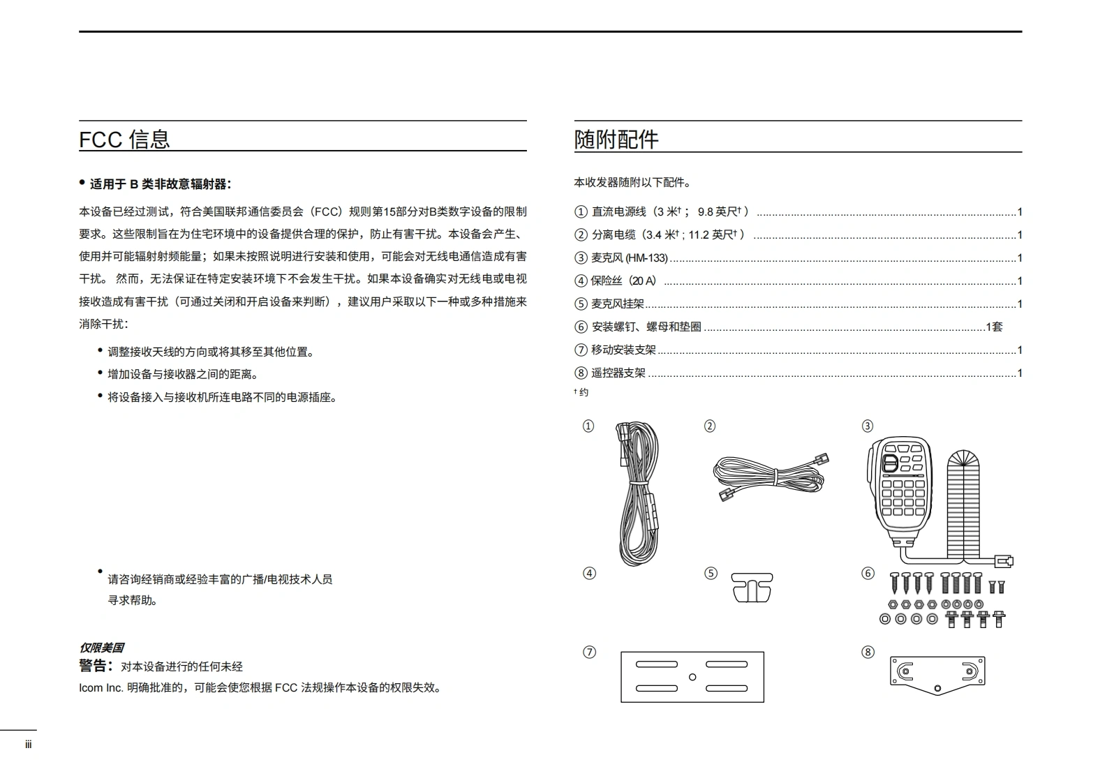 ICOM艾可慕ID-880H_user操作说明书手册20260331中文版找手册网7天前发布关注私信16.20MB203页038ICOM艾可慕ID-880H_user操作说明书手册20260331中文版此内容为付费资源,请付费后查看¥19¥21黄金会员免费钻石会员免费登录购买付费资源 第1页 / 共203页 第2页 / 共203页 第3页 / 共203页 第4页 / 共203页 第5页 / 共203页 第6页 / 共203页 第7页 / 共203页 第8页 / 共203页 第9页 / 共203页 第10页 / 共203页 试读已结束,还剩193页,您可下载完整版后进行离线阅读 THE END艾可慕 文本预览 cOM使用说明书HF/UHF数字收发机ID-880H田围D-STAR本设备符合FCC规则第15部分的规定。使用须遵守以下两个条件:(1)本设备不得造成有害干扰;(2)本设ID-882 H备必须接受任何接收到的干扰,包括可能导致意外运行的干扰。RsOo四警告:根据F℃C规则和联邦法律,禁止对本设备进行改装以接收蜂窝无线电电话服务信号。Icom Inc. 查看更多 收起部分 喜欢就支持一下吧收藏
