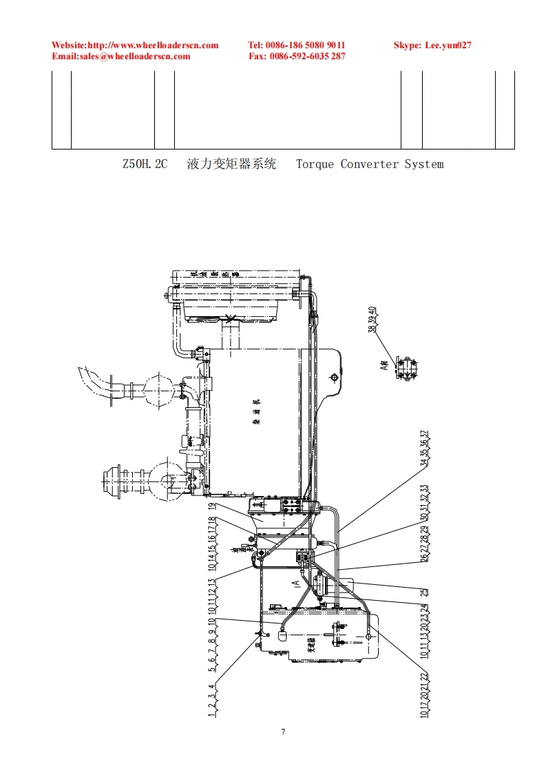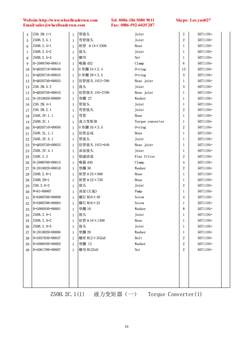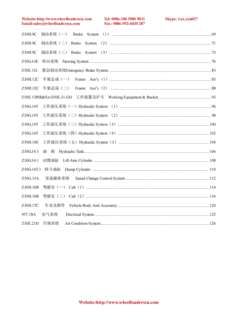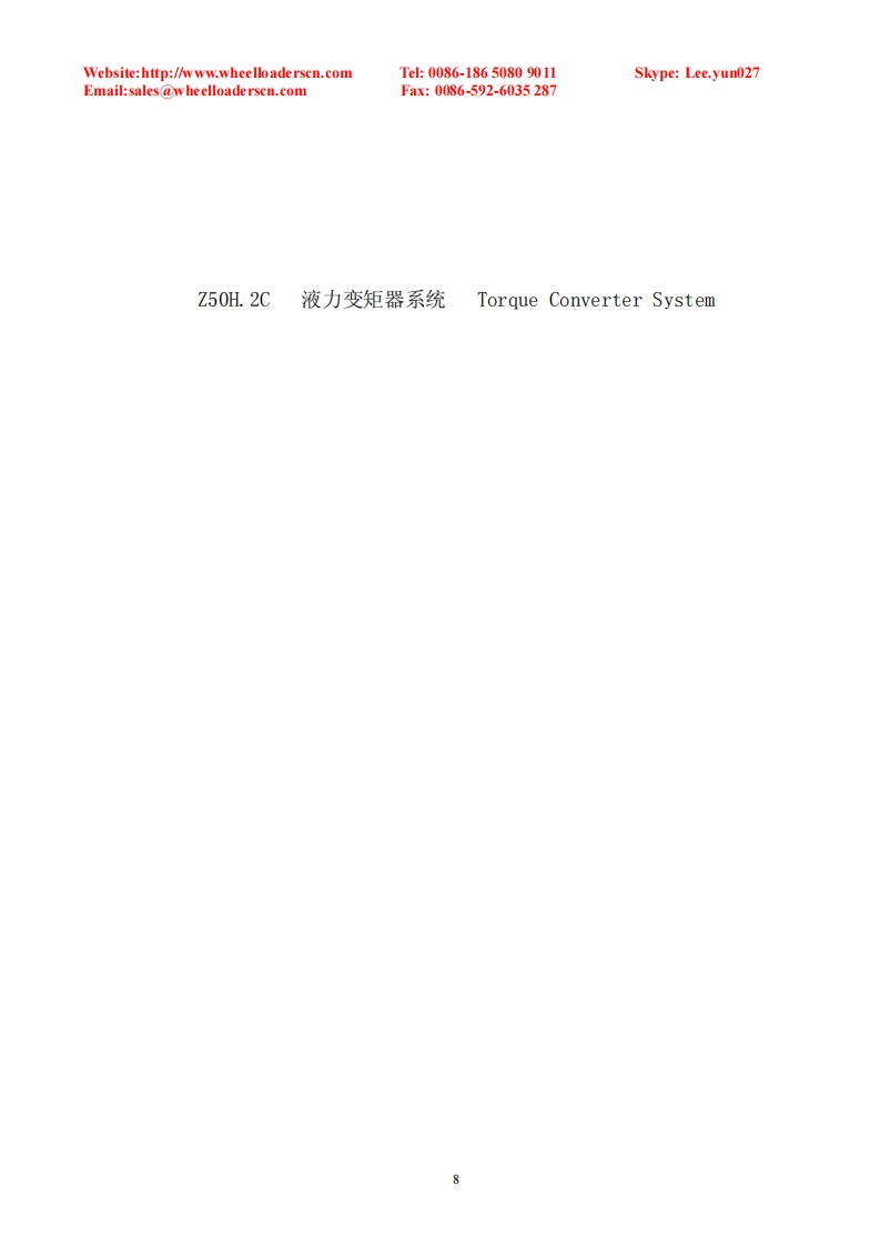 Website:http://www.wheelloaderscn.comTel:0086-18650809011Skype:Lee.yun027Email:sales@wheelloaderscn.comFax:0086-592-6035287录ContentsZ50GlD发动机系统Engine System.3Z50G1D.1柴油箱总成Fuel Tank..5Z50H.2C液力变矩器系统Torque Converter System.....>Z50H.2C液力变矩器系统Torque Converter System.Z50H.2C.1(1)液力变矩器(一)Torque Converter(1).10Z50H2C.1(2)液力变矩器(二)Torque Converter(2)13Z50H.2C.1(3)液力变矩器(三)Torque Converter(3)15Z50H.2C.1(4)液力变矩器(四)Torque Converter(4).17Z50H.2C.1(5)液力变矩器(五)Torque Converter(5).19Z50E.2.3精滤清器Fine Filter..21Z50B.3主传动轴Main Drive Shaft.24Z50H.4B变速箱体及附件Transmission And Accessories.26Z50H.4.1变速箱输出轴总成Output Shaft Ass'y30Z50H.4.2变速箱二、三档总成2 nd And3 th Clutch Ass'y..32Z50H.4.3一档总成Ist Clutch Ass'y...34Z50H.4.4中间轴总成Center Shaft Ass'y..36Z50H.4.5倒档轴总成Reverse Shaft Ass'y.….39Z50H.4.6前进倒退档总成Forward And Reverse Clutch Ass'y41Z50H.4.7档位阀总成Clutch Valve Ass'y43Z50H.4.7.1分配阀总成Distributing Valve Ass'y45Z30.4.13档位阀总成Control Valve Ass'y47Z50E.5L前传动轴(一)Front Drive Shaft(1)49Z50E.5L前传动轴(二)Front Drive Shaft(2)51Z50H.6A前桥Front Axle.…54Z50H.8A后桥FrontAxle…56Z50H.6.1/8.1前/后桥主传动Front/Rear Axle Main Drive..59Z50B.6.2A车轮Wheel Ass'y64Z50E.7C后传动轴总成Rear Drive Shaft Ass'y..........................….66Website:http://www.wheelloaderscn.com