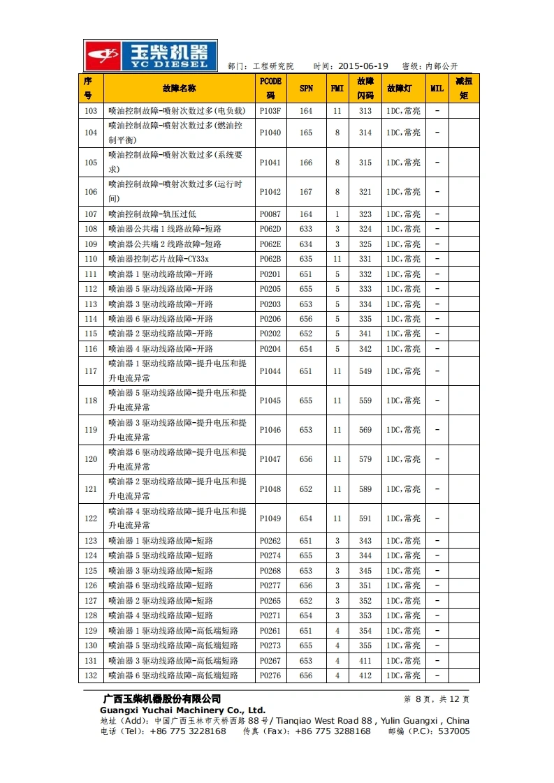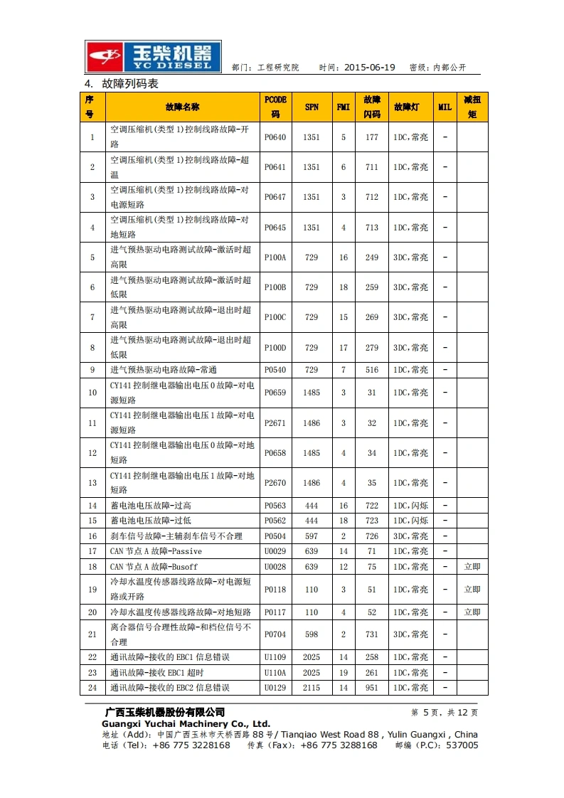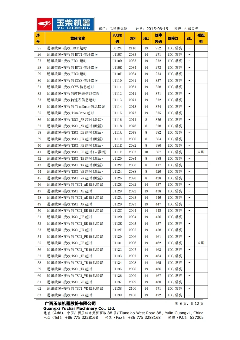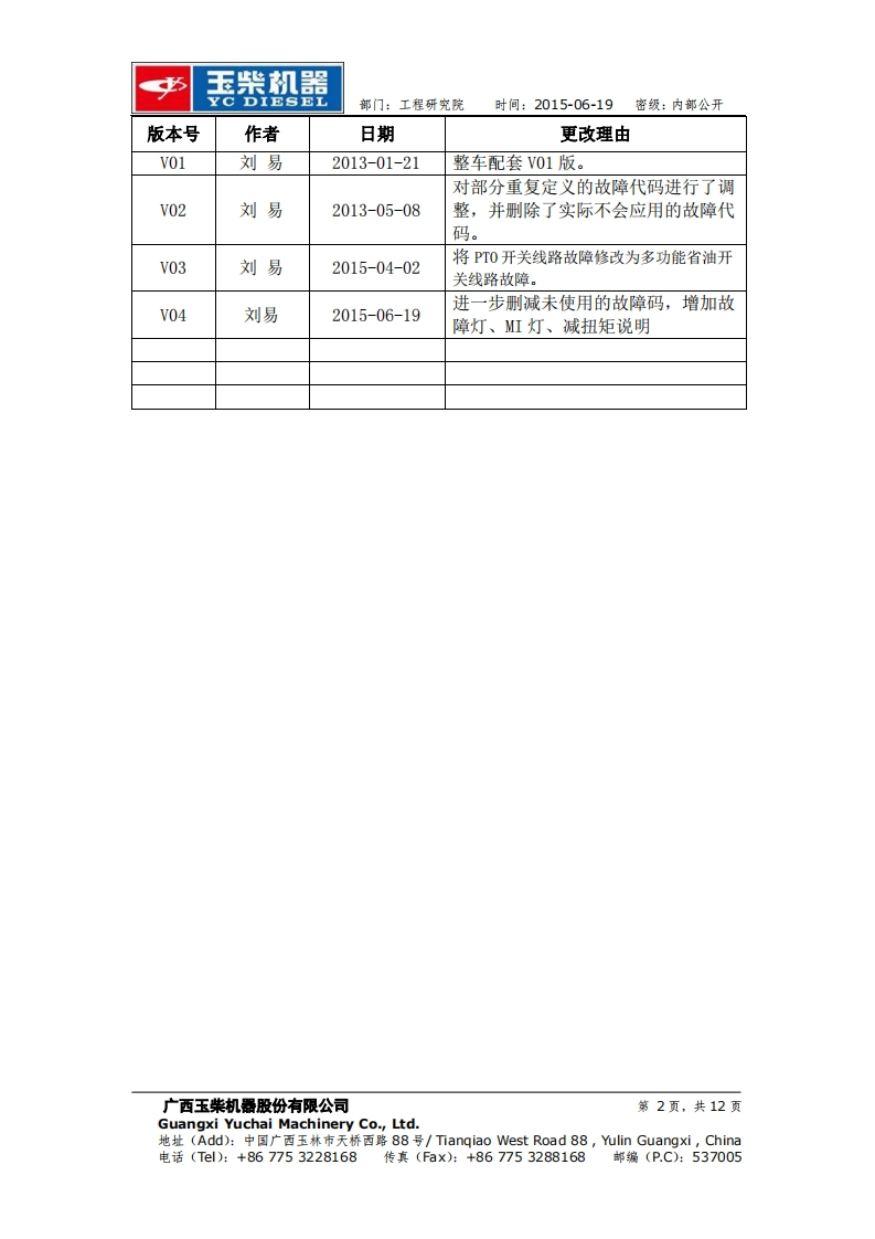 玉柴机器YC DIESEL部门:工程研究院时间:2015-06-19密级:内部公开玉柴BOSCH系统EDC17 Basic版故障列码表工程研究院电控系统研发部2015-06-19更改记录广西玉柴机器股份有限公司第1页,共12页Guangxi Yuchai Machinery Co.,Ltd.地址(Add):中国广西玉林市天桥西路88号/Tiangiao West Road88,ulin Guangxi,China电话(Tl):+867753228168传真(Fax):+867753288168邮编(P.C):537005