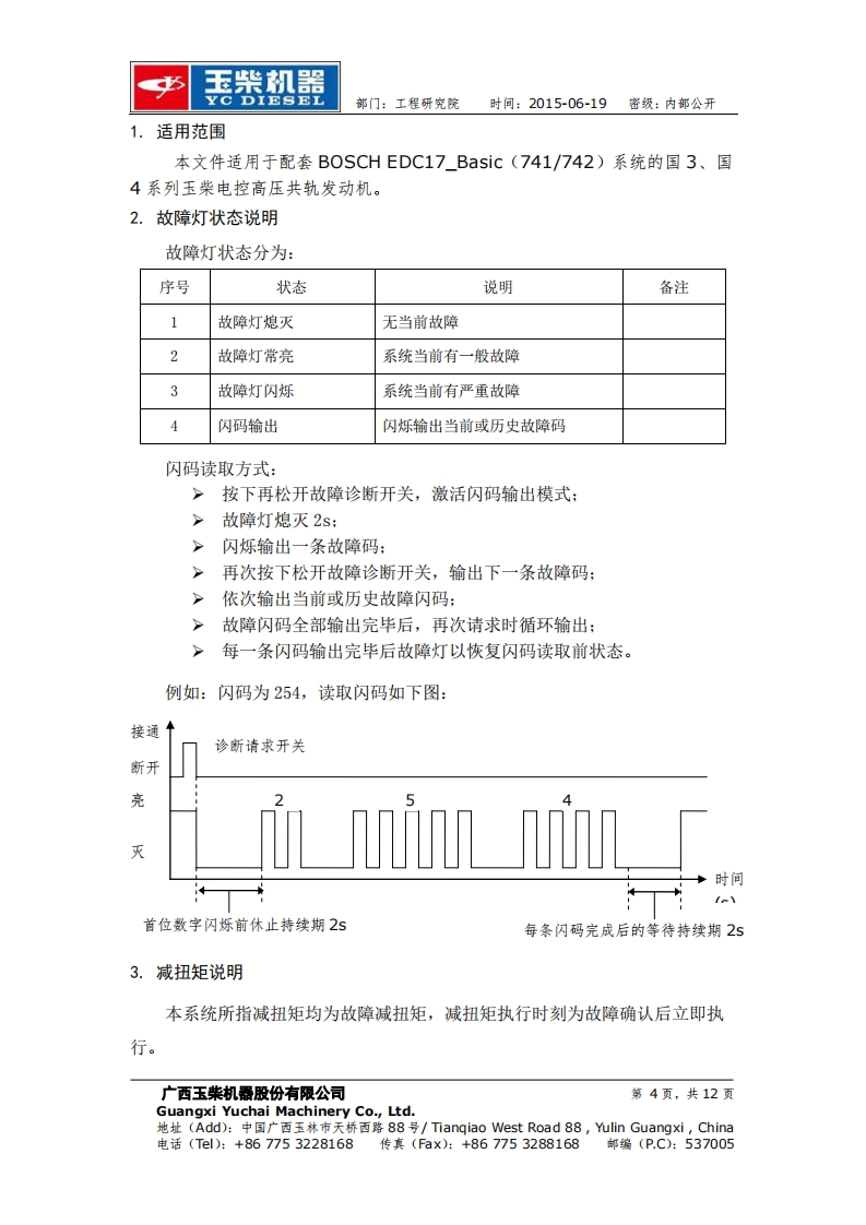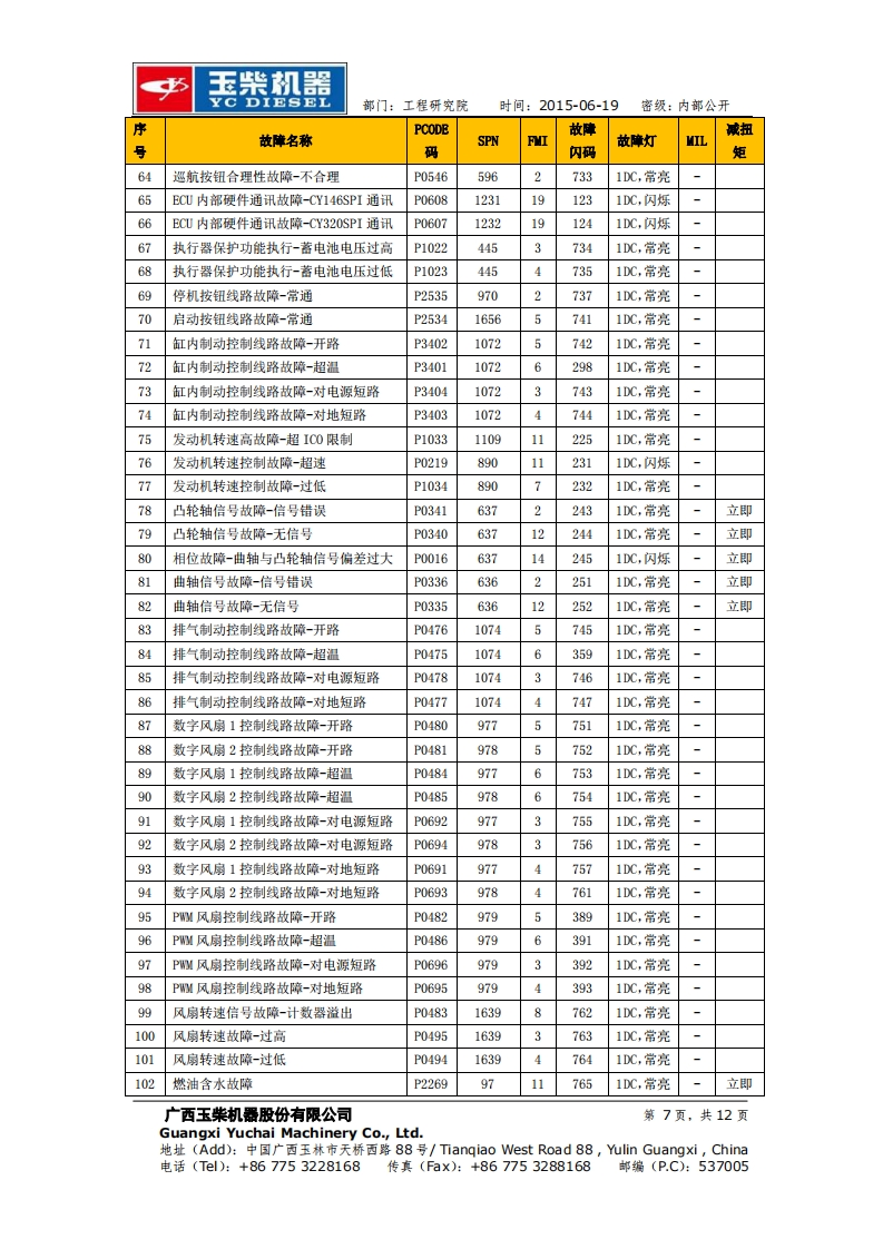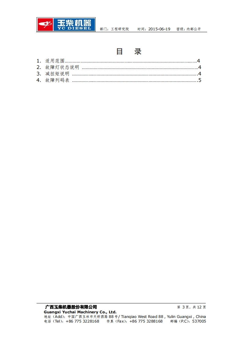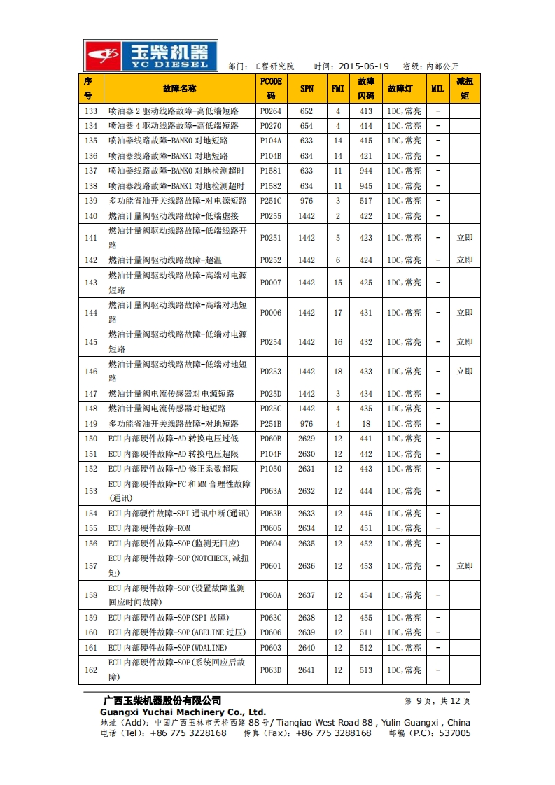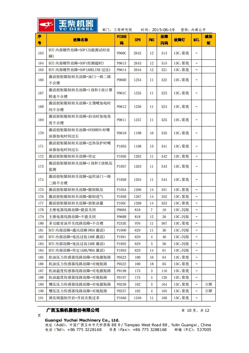 玉柴机器YC DIESEL部门:工程研究院时间:2015-06-19密级:内部公开玉柴BOSCH系统EDC17 Basic版故障列码表工程研究院电控系统研发部2015-06-19更改记录广西玉柴机器股份有限公司第1页,共12页Guangxi Yuchai Machinery Co.,Ltd.地址(Add):中国广西玉林市天桥西路88号/Tiangiao West Road88,ulin Guangxi,China电话(Tl):+867753228168传真(Fax):+867753288168邮编(P.C):537005