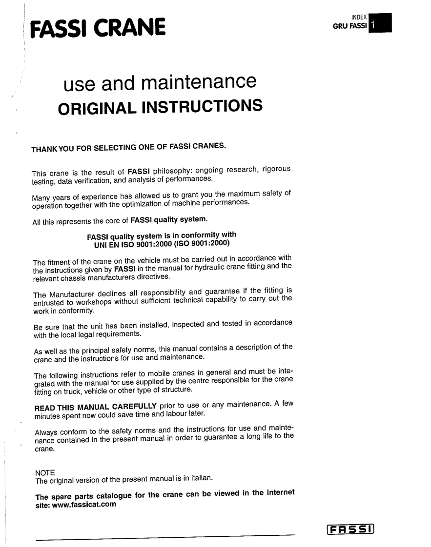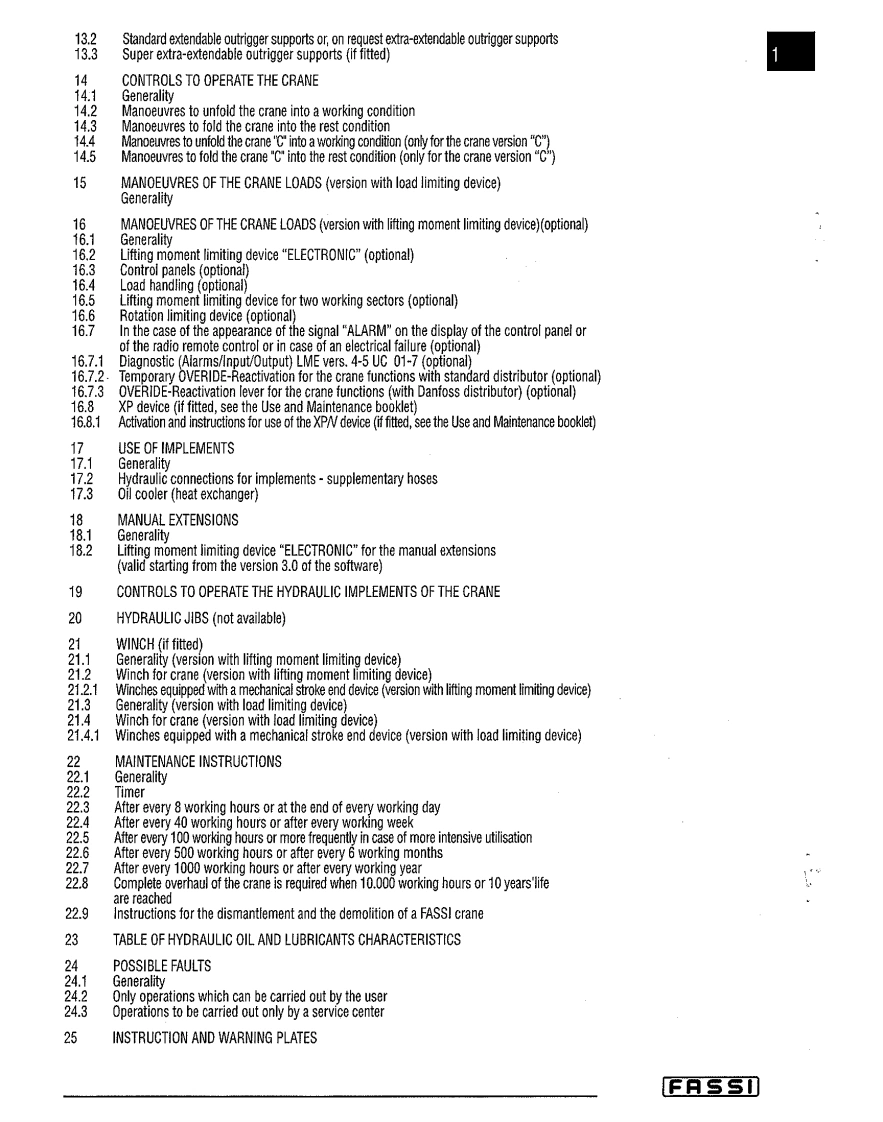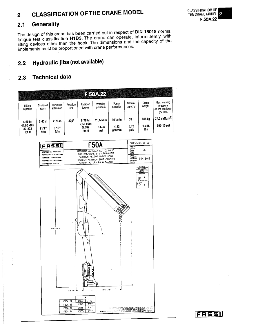 FASSI CRANE1F50A.22use and maintenanceFROM SERIAL NUMBER *5001*INDEX1INTRODUCTION2CLASSIFICATION OF THE CRANE MODEL2.1Generality2.2Hydraulic jibs(not available)2.3Technical data3CAPACITY PLATES3.1Generality3.2Capacity plates with lifting moment limiting device(optional)3.3Capacity plates with load limiting device41HYDRAULIC SCHEMATICS (version with lifting moment limiting device)(if fitted)HYDRAULIC SCHEMATICS (version with load limiting device)5ELECTRIC SCHEMATICS6SAFETY NORMSWARNING AND INSTRUCTIONS7.1GeneralityBefore operating3During operation7.4At the end of the operation (Prior to driving the vehicle)7.5Residual risksIDENTIFICATION OF THE CRANE MODEL8.1Generality8.2Crane markCRANE NOMENCLATURE9.1Version with ground controls for crane and outriggers10NOMENCLATURE OF THE SAFETY AND PROTECTION DEVICES10.1Version with ground controls for crane and outriggers11SUPPLEMENTARY BEAMS11.1Generality11.2Identification of the supplementary beams12TILTABLE OUTRIGGER RAMS12.1Manually tiltable outrigger ramsMANOEUVRES AND CONTROLS TO STABILIZE THE VEHICLE13.1GeneralityFRSSIEdition ExtraCE 28.04.2006.