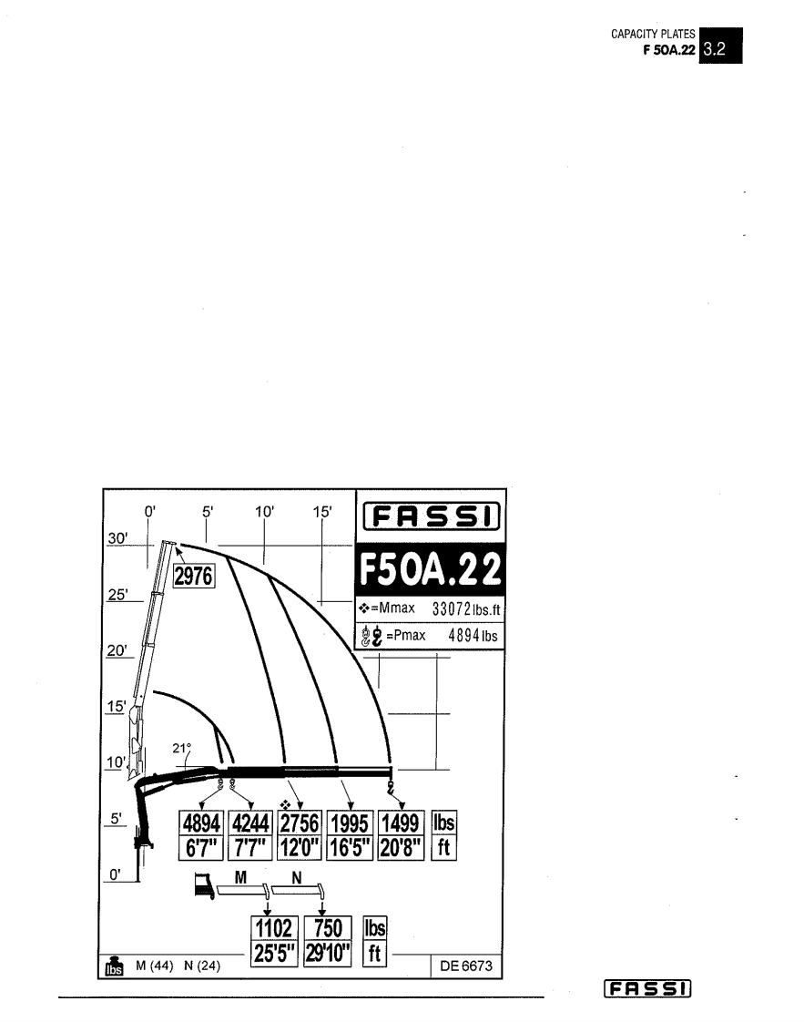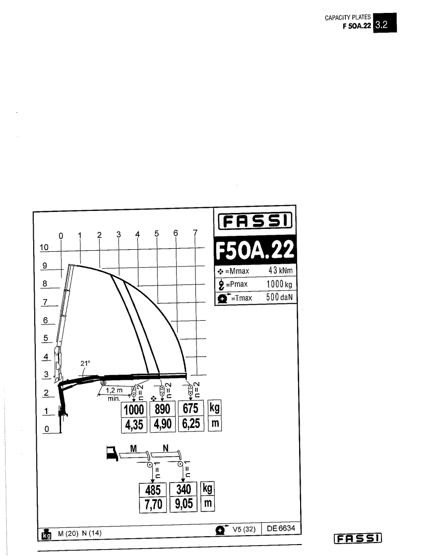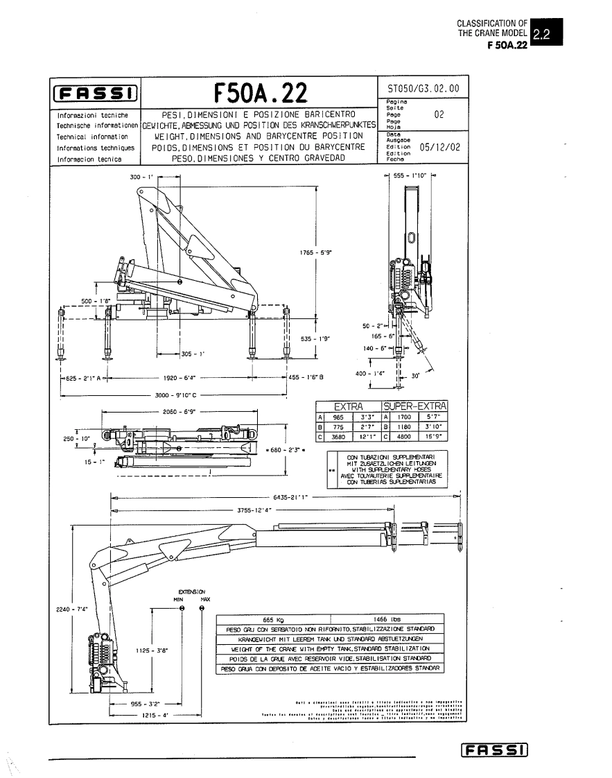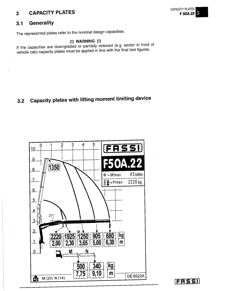 FASSI CRANE1F50A.22use and maintenanceFROM SERIAL NUMBER *5001*INDEX1INTRODUCTION2CLASSIFICATION OF THE CRANE MODEL2.1Generality2.2Hydraulic jibs(not available)2.3Technical data3CAPACITY PLATES3.1Generality3.2Capacity plates with lifting moment limiting device(optional)3.3Capacity plates with load limiting device41HYDRAULIC SCHEMATICS (version with lifting moment limiting device)(if fitted)HYDRAULIC SCHEMATICS (version with load limiting device)5ELECTRIC SCHEMATICS6SAFETY NORMSWARNING AND INSTRUCTIONS7.1GeneralityBefore operating3During operation7.4At the end of the operation (Prior to driving the vehicle)7.5Residual risksIDENTIFICATION OF THE CRANE MODEL8.1Generality8.2Crane markCRANE NOMENCLATURE9.1Version with ground controls for crane and outriggers10NOMENCLATURE OF THE SAFETY AND PROTECTION DEVICES10.1Version with ground controls for crane and outriggers11SUPPLEMENTARY BEAMS11.1Generality11.2Identification of the supplementary beams12TILTABLE OUTRIGGER RAMS12.1Manually tiltable outrigger ramsMANOEUVRES AND CONTROLS TO STABILIZE THE VEHICLE13.1GeneralityFRSSIEdition ExtraCE 28.04.2006.