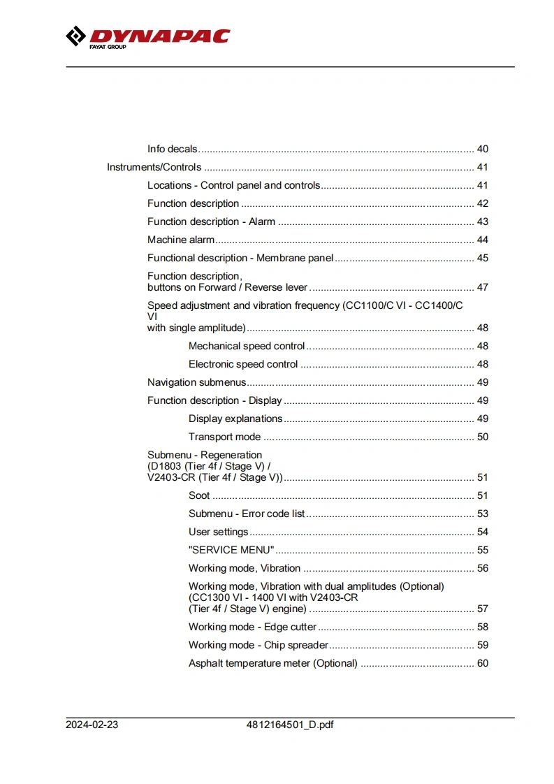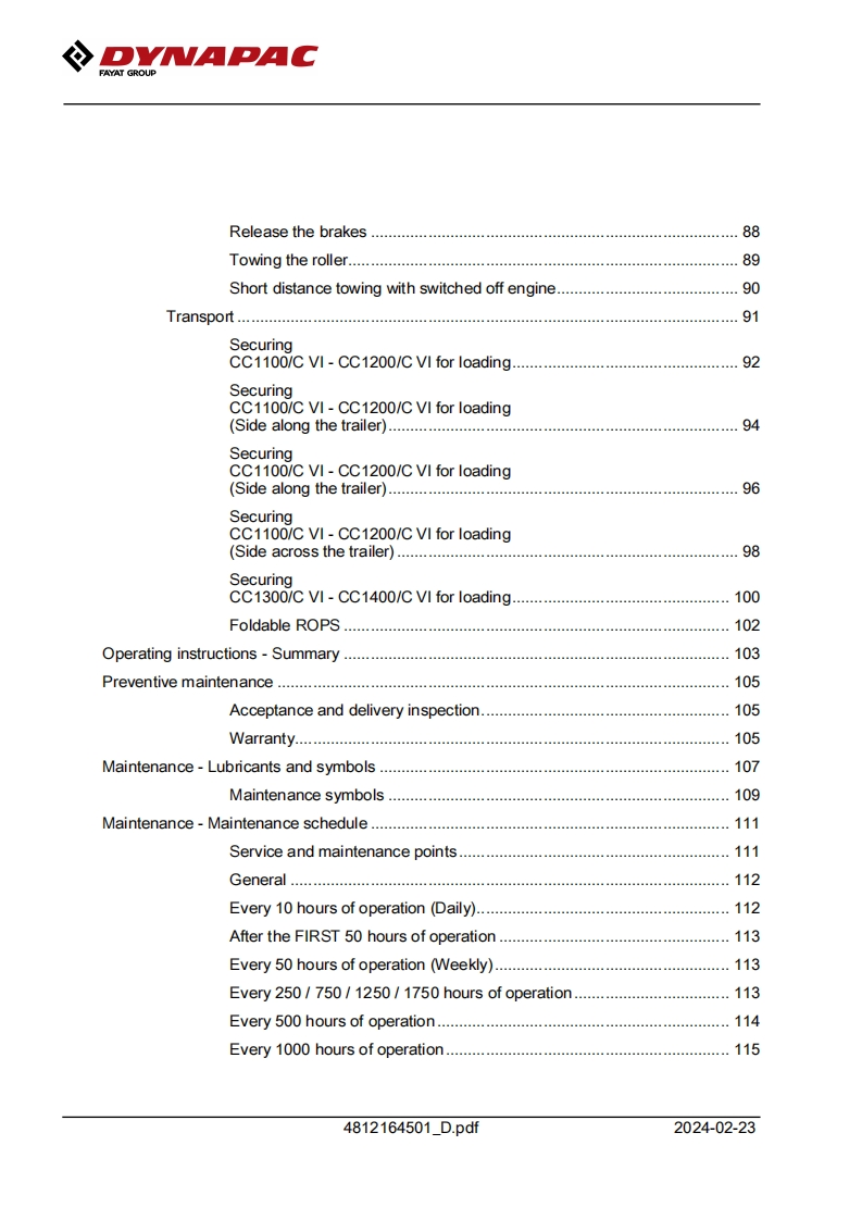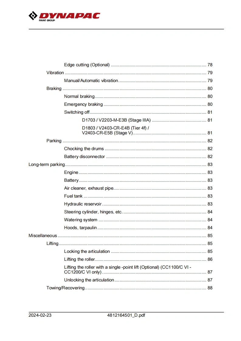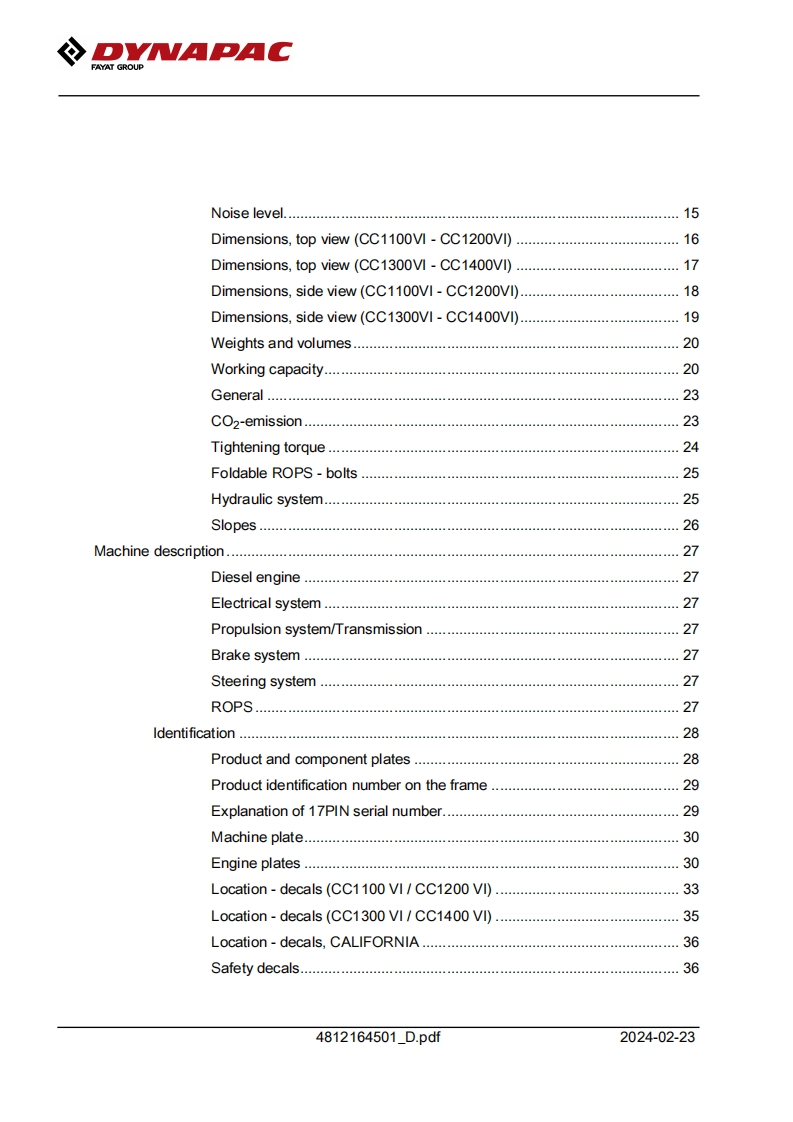 DVNAPACFAYAT GROUPInstruction manualOperating Maintenance4812164501D.pdfVibratory rollersCC1100 VI-CC1400 VIEngineKubota D1703/D1803/V2203/V2403Models and PINCC1100 VI(Stage IIIA)(26 kW)10000389xxA018679CC1100V1(Tier 4f)(18.5 kW)10000390xA021827-xA023287CC1100V1(Tier 4f)(28 kW)10000391XxA021487-CC1100 VI(Stage V)(18.5 kW)10000444xxA024596-CC1100V1(Stage V)(28 kW)10000452xA026395CC1200V1(Stage IlIA)(26 kW)100003950xA018609-CC1200V1(Tier 4f)(18.5 kW)100003960A018676-CC1200V1(Tier 4f)(28 kW)10000397xA016877CC1200V1(Stage V)(18.5kW))10000446xxA023389-CC1200V1(Stage V)(28 kW)10000454xxA031142-CC1300V1(Stage IIIA)(35 kW)100004690A030704CC1300V1(Tier 4f)(37 kW)10000470A031597-CC1300V1(Stage V)(37 kW)10000471XxA030199-CC1400V1(Stage IIIA)(35 kW)10000475xxA025500-CC1400V1(Tier 4f)(37 kW)10000476xA030197-CC1400 VI(Stage V)(37 kW)10000477A026844-Translation of original instructionReservation for changesPrinted in SwedenEN