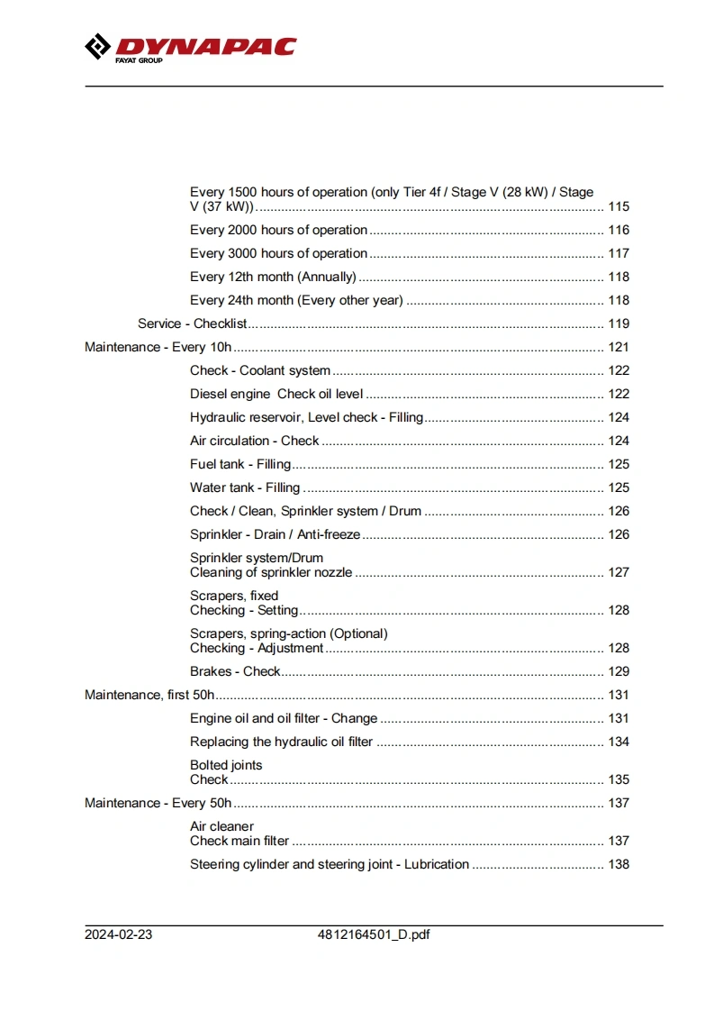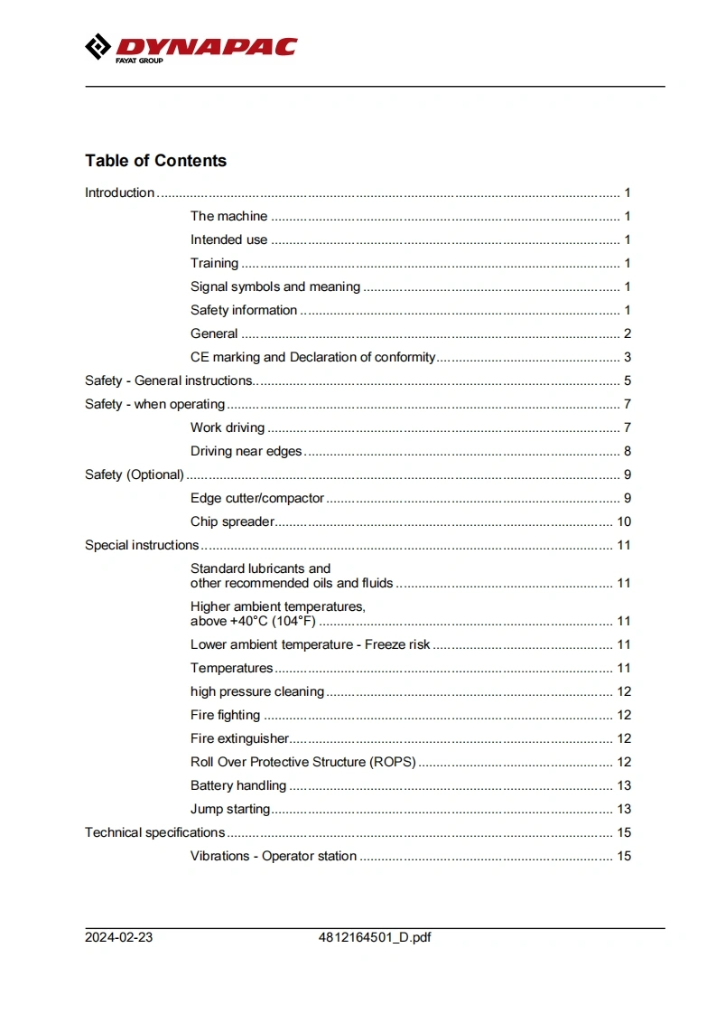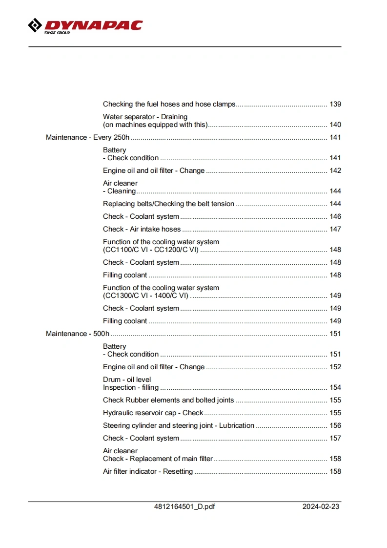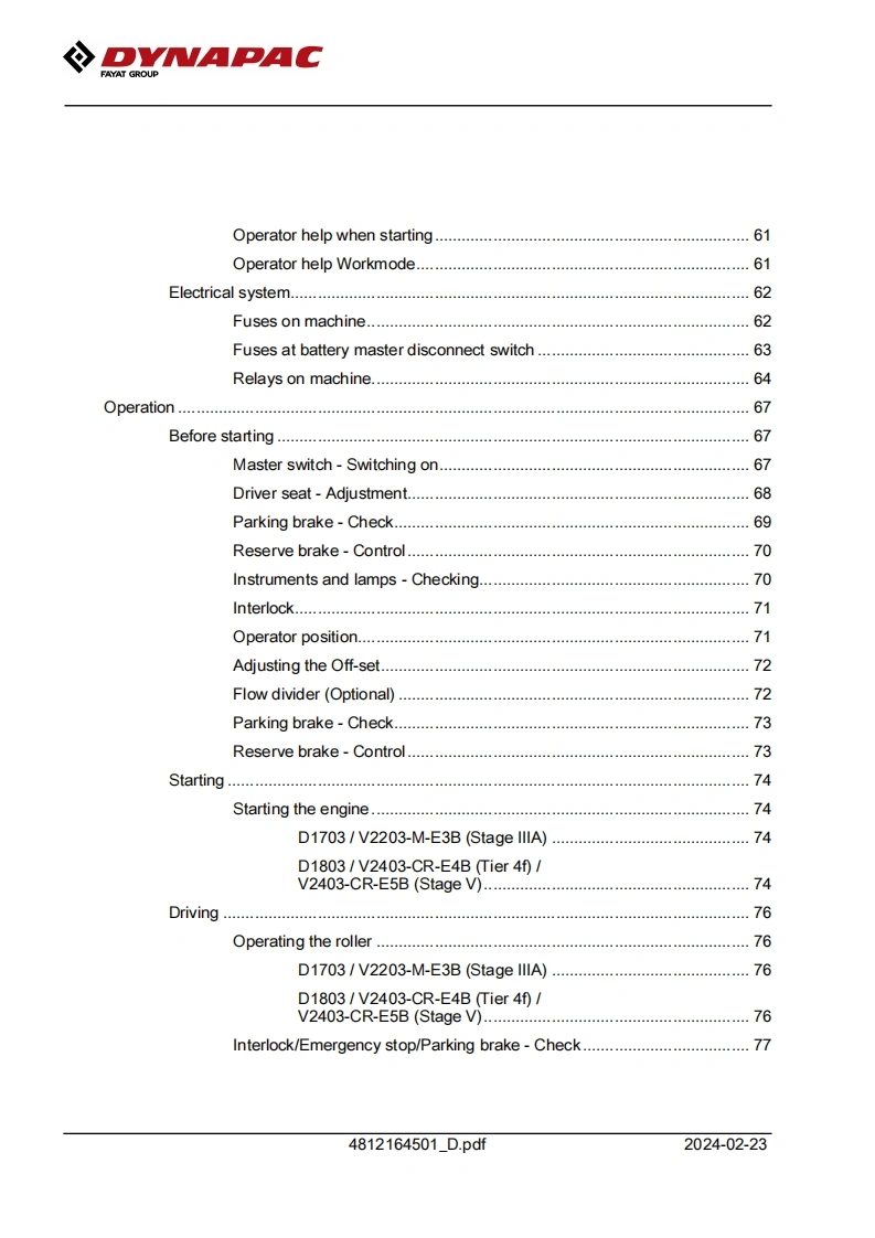 DVNAPACFAYAT GROUPInstruction manualOperating Maintenance4812164501D.pdfVibratory rollersCC1100 VI-CC1400 VIEngineKubota D1703/D1803/V2203/V2403Models and PINCC1100 VI(Stage IIIA)(26 kW)10000389xxA018679CC1100V1(Tier 4f)(18.5 kW)10000390xA021827-xA023287CC1100V1(Tier 4f)(28 kW)10000391XxA021487-CC1100 VI(Stage V)(18.5 kW)10000444xxA024596-CC1100V1(Stage V)(28 kW)10000452xA026395CC1200V1(Stage IlIA)(26 kW)100003950xA018609-CC1200V1(Tier 4f)(18.5 kW)100003960A018676-CC1200V1(Tier 4f)(28 kW)10000397xA016877CC1200V1(Stage V)(18.5kW))10000446xxA023389-CC1200V1(Stage V)(28 kW)10000454xxA031142-CC1300V1(Stage IIIA)(35 kW)100004690A030704CC1300V1(Tier 4f)(37 kW)10000470A031597-CC1300V1(Stage V)(37 kW)10000471XxA030199-CC1400V1(Stage IIIA)(35 kW)10000475xxA025500-CC1400V1(Tier 4f)(37 kW)10000476xA030197-CC1400 VI(Stage V)(37 kW)10000477A026844-Translation of original instructionReservation for changesPrinted in SwedenEN