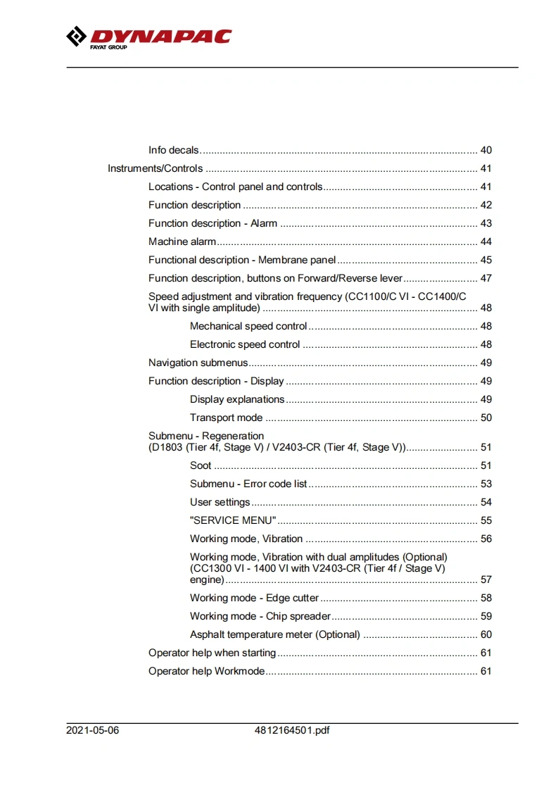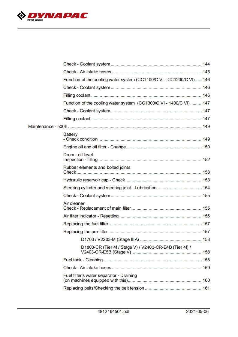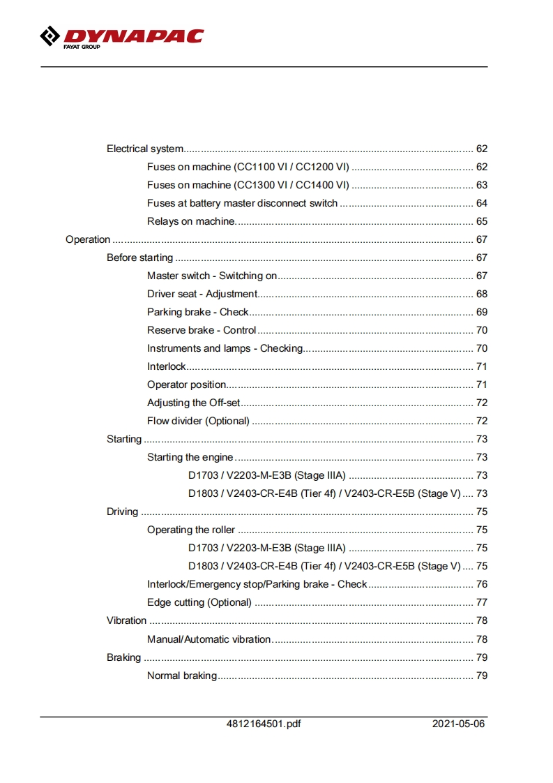 DNAPACFAYAT GROUPInstruction manualOperating Maintenance4812164501.pdfVibratory rollersCC1100 VI-CC1400 VIEngineKubota D1703/D1803/V2203/V2403Models and PINCC1100 VI(Stage IIIA(26 kW)10000389xxA018679CC1100V1(Tier 4f)(18.5 kW)10000390xA021827-xA023287CC1100V1(Tier 4f)(28 kW)10000391XxA021487-CC1100 VI(Stage V)(18.5 kW)10000444xA024596-CC1100V1(Stage V)(28 kW)10000452xA026395CC1200V1(Stage IlIA (26 kW)100003950A018609-CC1200V1(Tier 4f)(18.5 kW)100003960xA018676CC1200V1(Tier 4f)(28 kW)10000397xA016877CC1200V1(Stage V)(18.5 kW)10000446xxA023389-CC1200V1(Stage V)(28 kW)10000454xxA031142-CC1300V1(Stage IIIA(35 kW)100004690A030704CC1300V1(Tier 4f)(37 kW)10000470A031597-CC1300V1(Stage V)(37 kW)10000471XxA030199-CC1400V1(Stage IlIA(35 kW)10000475xxA026843-CC1400 VI(Tier 4f)(37 kW)10000476xA030197-CC1400 VI(Stage V)(37 kW)10000477A026844-Translation of original instructionReservation for changesPrinted in SwedenEN