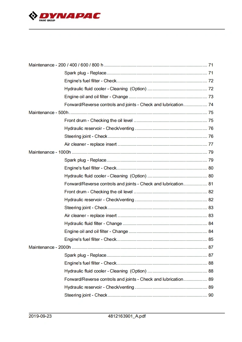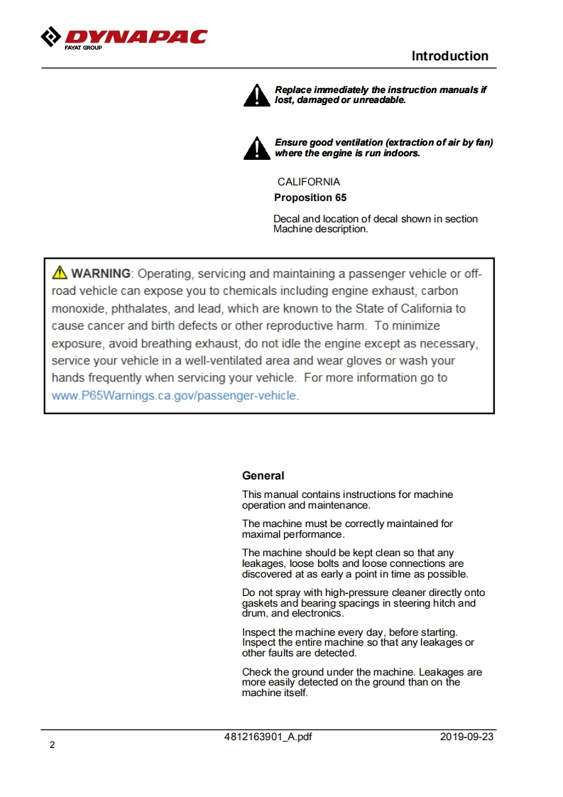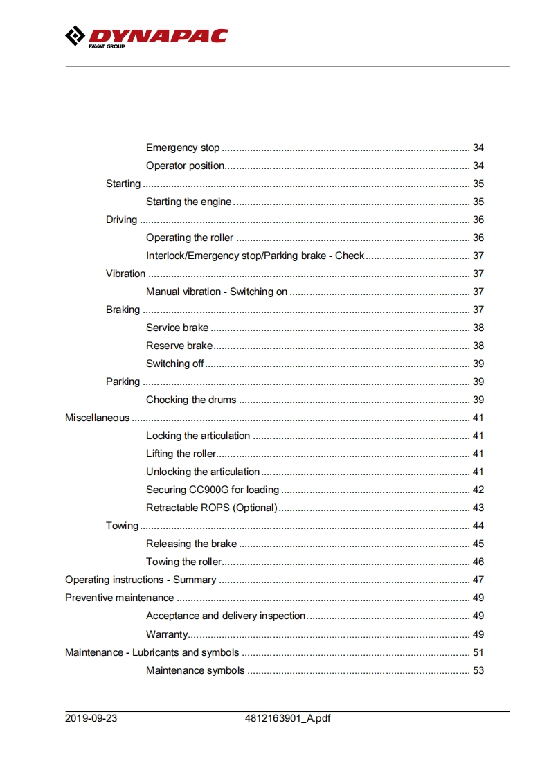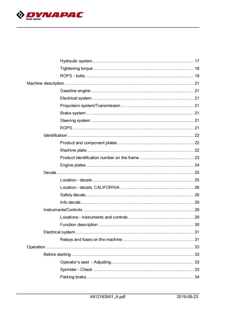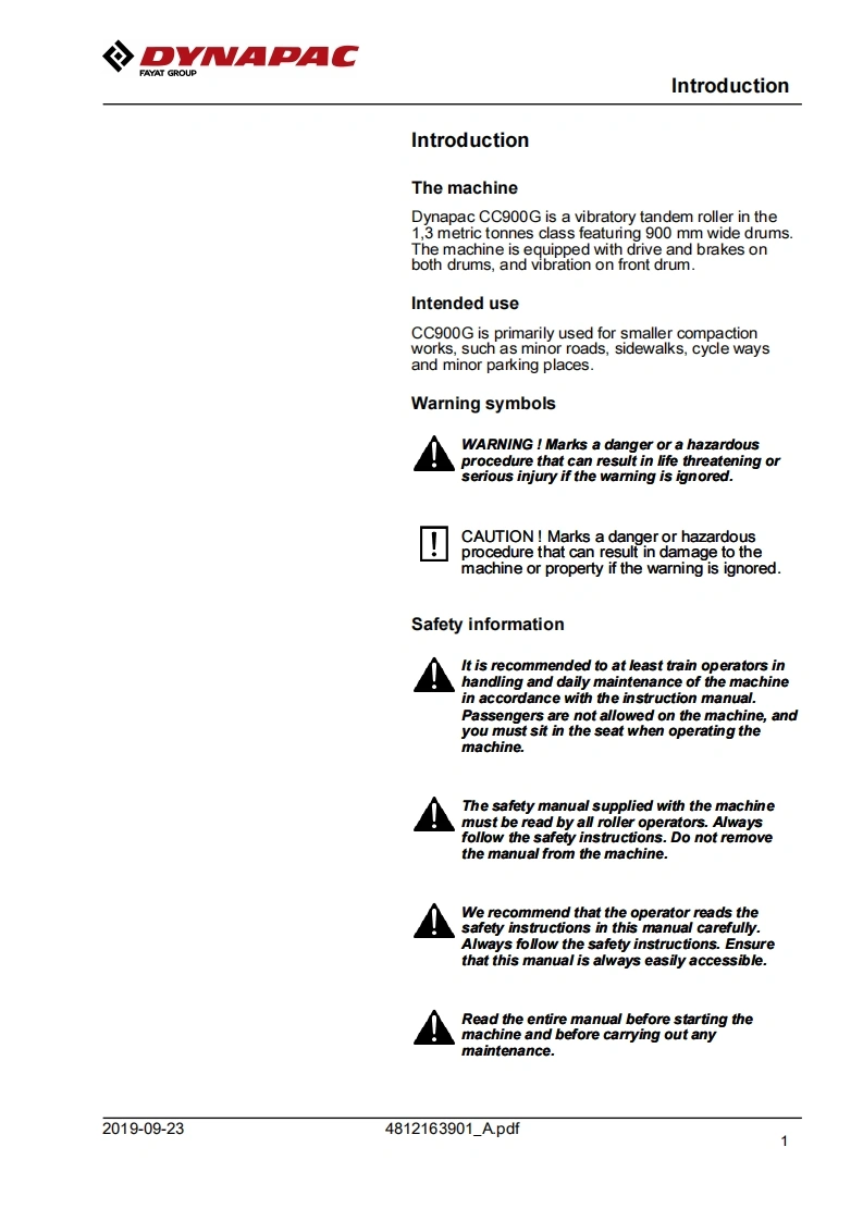 Dynapac戴纳派克-CC900G操作与维护手册找手册网7天前发布关注私信10.82MB104页026Dynapac戴纳派克-CC900G操作与维护手册此内容为付费资源,请付费后查看¥29¥31黄金会员免费钻石会员免费登录购买付费资源 第1页 / 共104页 第2页 / 共104页 第3页 / 共104页 第4页 / 共104页 第5页 / 共104页 第6页 / 共104页 第7页 / 共104页 第8页 / 共104页 第9页 / 共104页 第10页 / 共104页 试读已结束,还剩94页,您可下载完整版后进行离线阅读 THE END约翰迪尔/戴纳派克 文本预览 DVMAPACFAYAT GROUPInstruction manualOperating Maintenance4812163901A.pdfVibratory rollerCC900GEngineHonda GX630RH QYDSerial number10000303XxA023833-Translation of original instructionReservation for changesPrinted in SwedenEN 查看更多 收起部分 喜欢就支持一下吧收藏