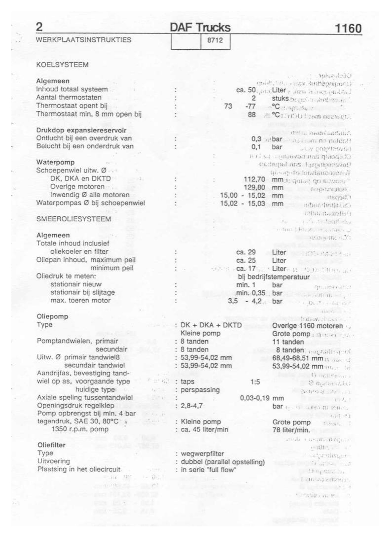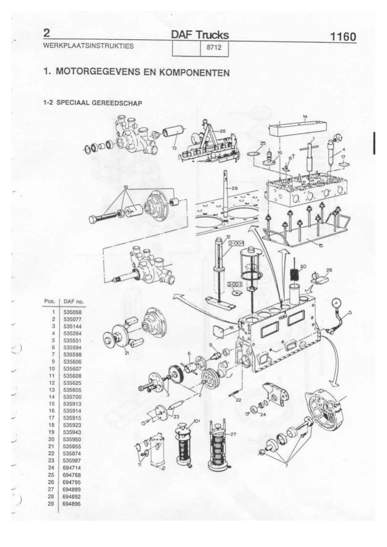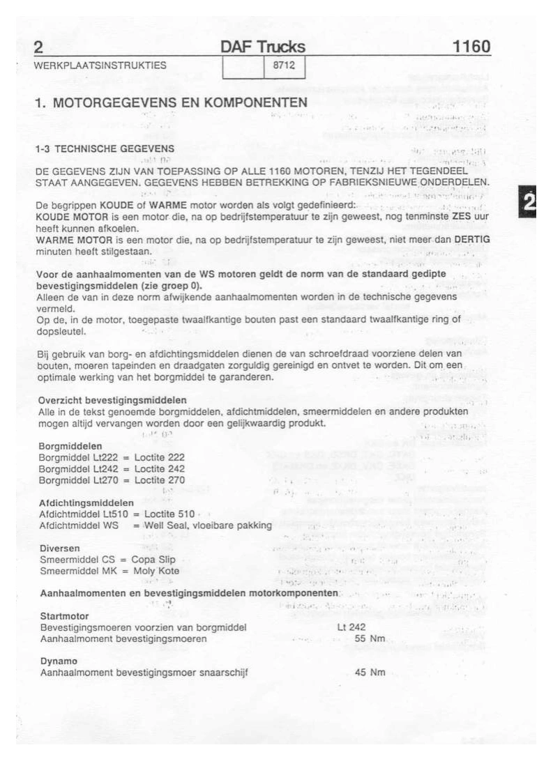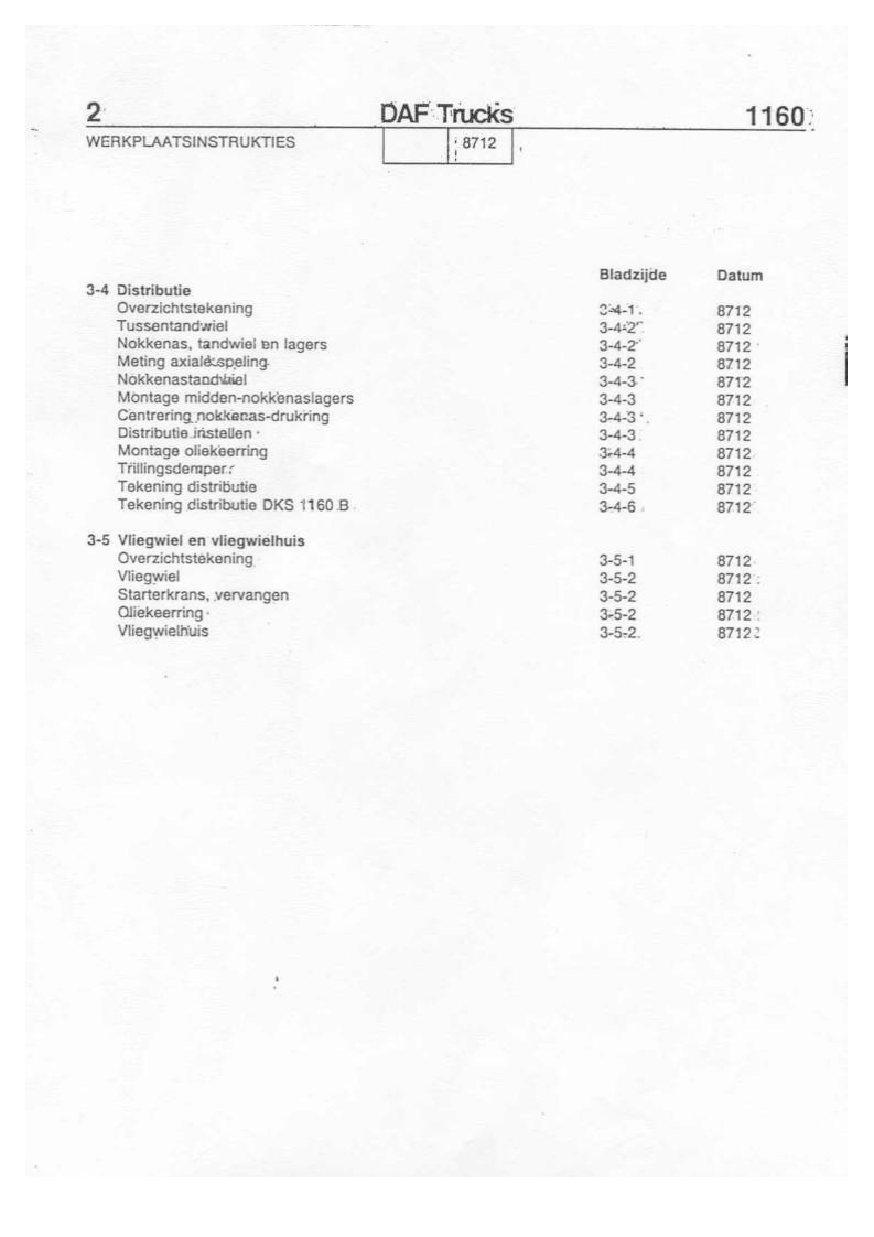 2DAF Trucks1160WERKPLAATSINSTRUKTIES8712INHOUD MOTORENsrtaSTVa1160:BladzijdeDatum1.MOTORGEGEVENS EN -KOMPONENTEN1-1 Algemeen1-1-18712(aanzichten motor met legende en lokatie motordelen).1-2 Speciaal gereedschap1-2-187121-3 Technische gegevens1-3-1/1187121-4 Onderhoud7111Motorolie h oliefilter-element vernieuwen1-418712V-snaren 'kontroleren.1-4-18712Klepspeling1-4-287121-5 Uit-,en Inbouwen motorkomponentenStartmotorc.c1-5-1-48712Dynamo1-5-118712Stuurpomp1-5-18712Luchtkompressor1-5-28712Gloeispiralen,1-528712mmlaatspruitstuk1-53…4…18712Turbokompressor1-5-38712Uitlaatspruitstuk1-5-48712Opnemers em gevers1-5-48712Oliekoeler1-5-48712BrandstotpompDemonteren1-5-518712Monteren+afstellen1-5-5/68712Kontrole inspuitmoment1-5-68712Verstuivers1-5-6/78712Thermostaat1-5-88712Waterpomp1-5-9"87122.MOTORSYSTEMEN2-1 KoelsysteemAlgemeenEP2Koelvloeistof-2-1-18712Koelsysteem vullen en ontluchten2.1-18712Koelproblemen2-1-18712Testen koelsysteem2-1-18712Koelvloeistofverliezen2-1-1n9f8712Schema koelsysteem.2-1-3/48712Komponenten koelsysteemWaterpomp2-1-58712Thermostaten2-1-5/68712Overdruk-Vuldop2-1-78712Ventllator2-1-7/88712