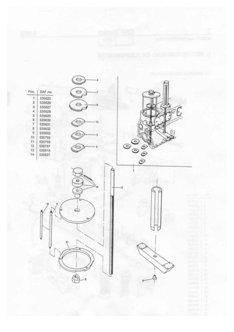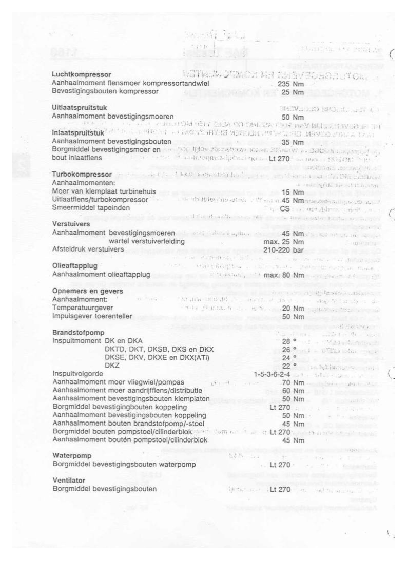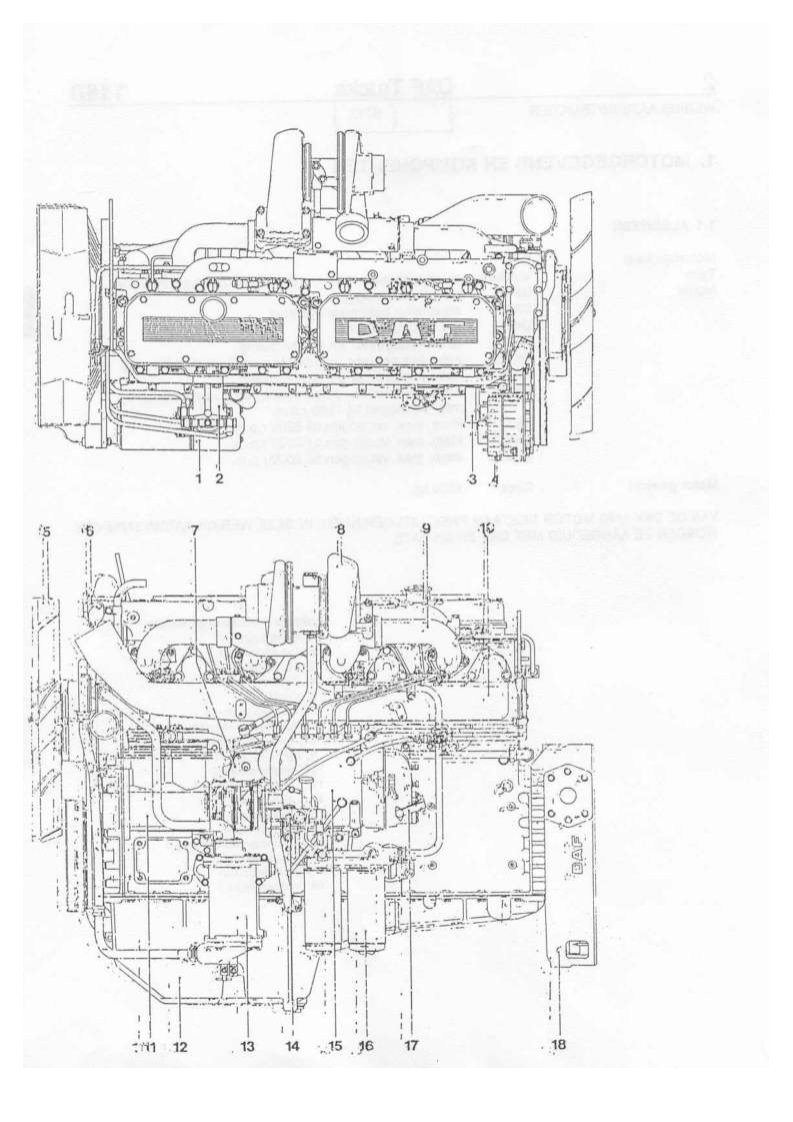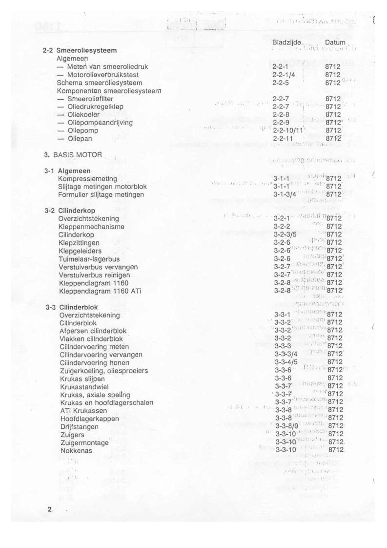 2DAF Trucks1160WERKPLAATSINSTRUKTIES8712INHOUD MOTORENsrtaSTVa1160:BladzijdeDatum1.MOTORGEGEVENS EN -KOMPONENTEN1-1 Algemeen1-1-18712(aanzichten motor met legende en lokatie motordelen).1-2 Speciaal gereedschap1-2-187121-3 Technische gegevens1-3-1/1187121-4 Onderhoud7111Motorolie h oliefilter-element vernieuwen1-418712V-snaren 'kontroleren.1-4-18712Klepspeling1-4-287121-5 Uit-,en Inbouwen motorkomponentenStartmotorc.c1-5-1-48712Dynamo1-5-118712Stuurpomp1-5-18712Luchtkompressor1-5-28712Gloeispiralen,1-528712mmlaatspruitstuk1-53…4…18712Turbokompressor1-5-38712Uitlaatspruitstuk1-5-48712Opnemers em gevers1-5-48712Oliekoeler1-5-48712BrandstotpompDemonteren1-5-518712Monteren+afstellen1-5-5/68712Kontrole inspuitmoment1-5-68712Verstuivers1-5-6/78712Thermostaat1-5-88712Waterpomp1-5-9"87122.MOTORSYSTEMEN2-1 KoelsysteemAlgemeenEP2Koelvloeistof-2-1-18712Koelsysteem vullen en ontluchten2.1-18712Koelproblemen2-1-18712Testen koelsysteem2-1-18712Koelvloeistofverliezen2-1-1n9f8712Schema koelsysteem.2-1-3/48712Komponenten koelsysteemWaterpomp2-1-58712Thermostaten2-1-5/68712Overdruk-Vuldop2-1-78712Ventllator2-1-7/88712