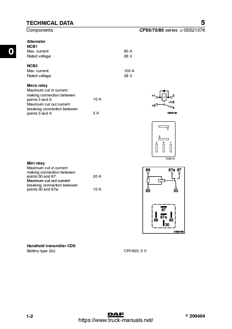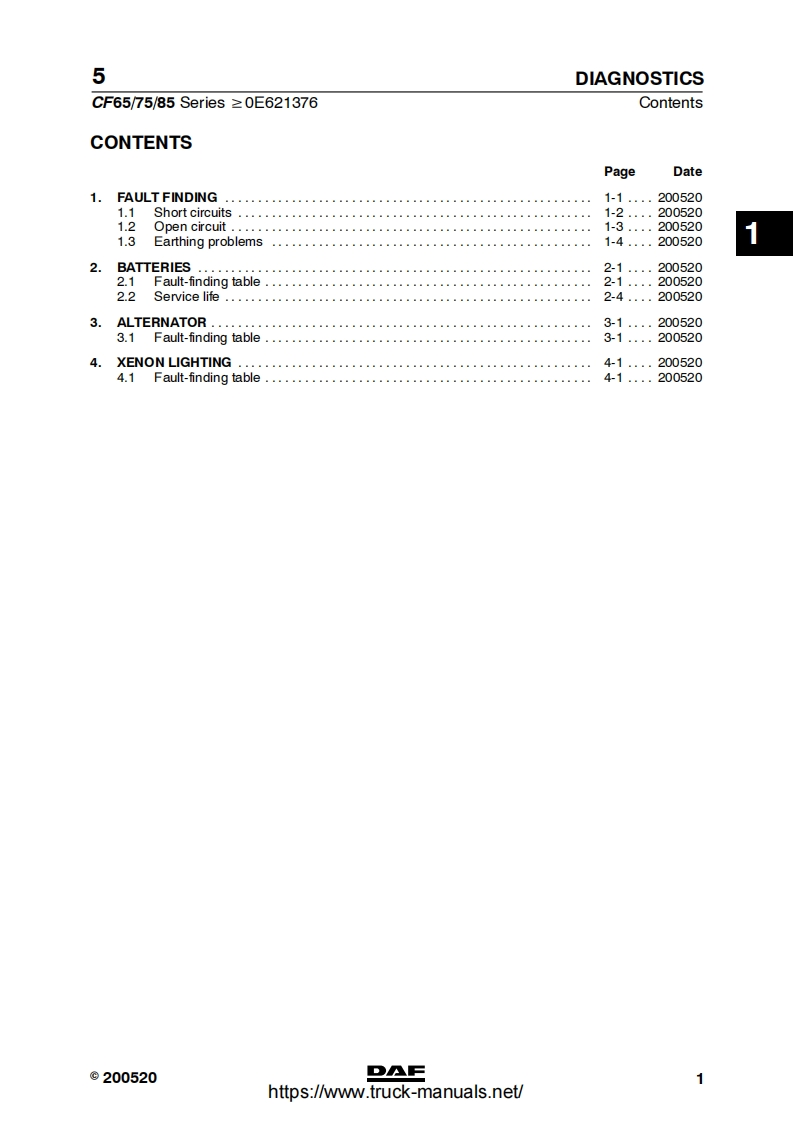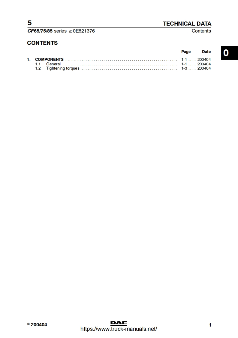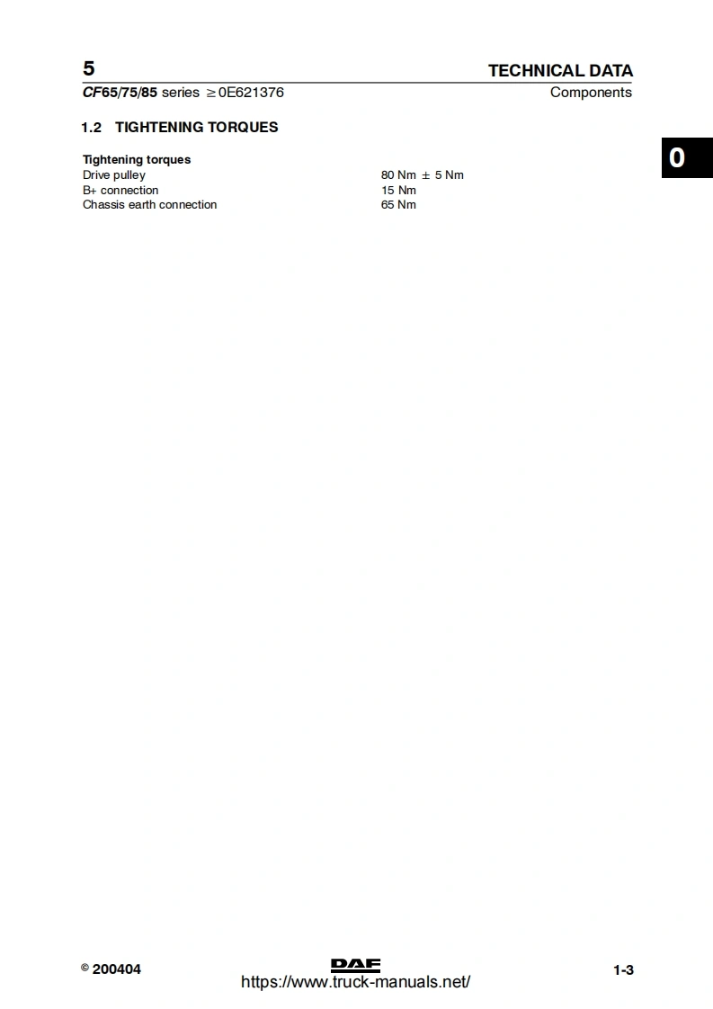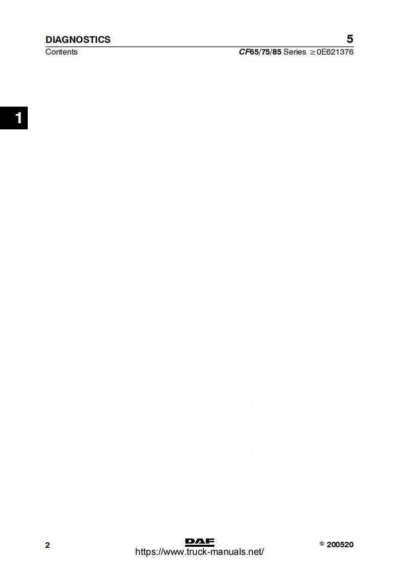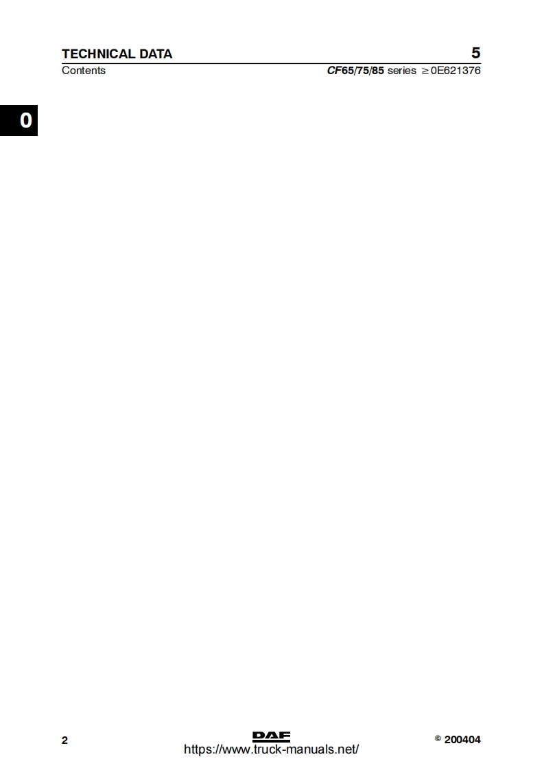 5CONTENTSCF65/75/85 Series≥0E621376TECHNICAL DATADIAGNOSTICSCOMPONENTSWIRING REPAIRBATTERIESCONNECTION OF ACCESSORIESREADING DIAGRAMSLOCATION OF COMPONENTSLOCATION OF CONNECTORSELECTRICAL SYSTEM10CHANGES IN THE ELECTRICAL SYSTEM11ELECTRICAL SYSTEM:OPTIONS AND SPECIAL APPLICATIONS12©200520DAFDW23271004https://www.truck-manuals.net/