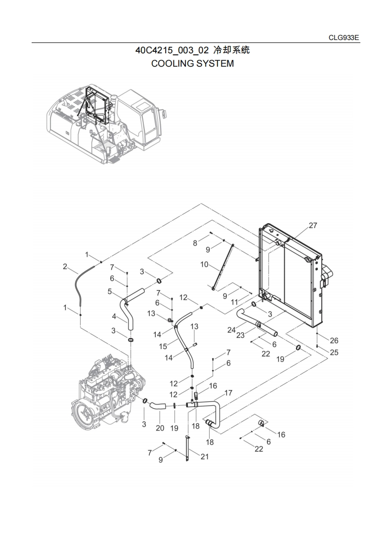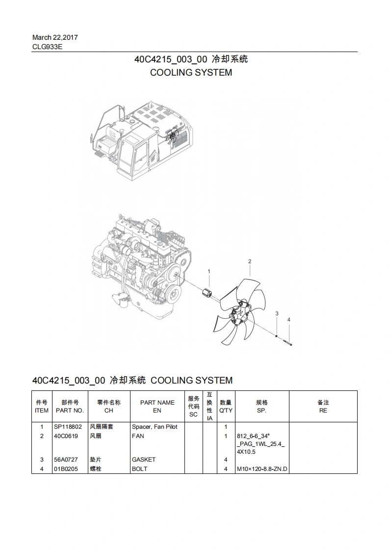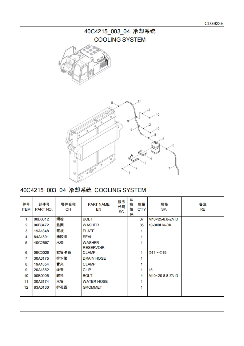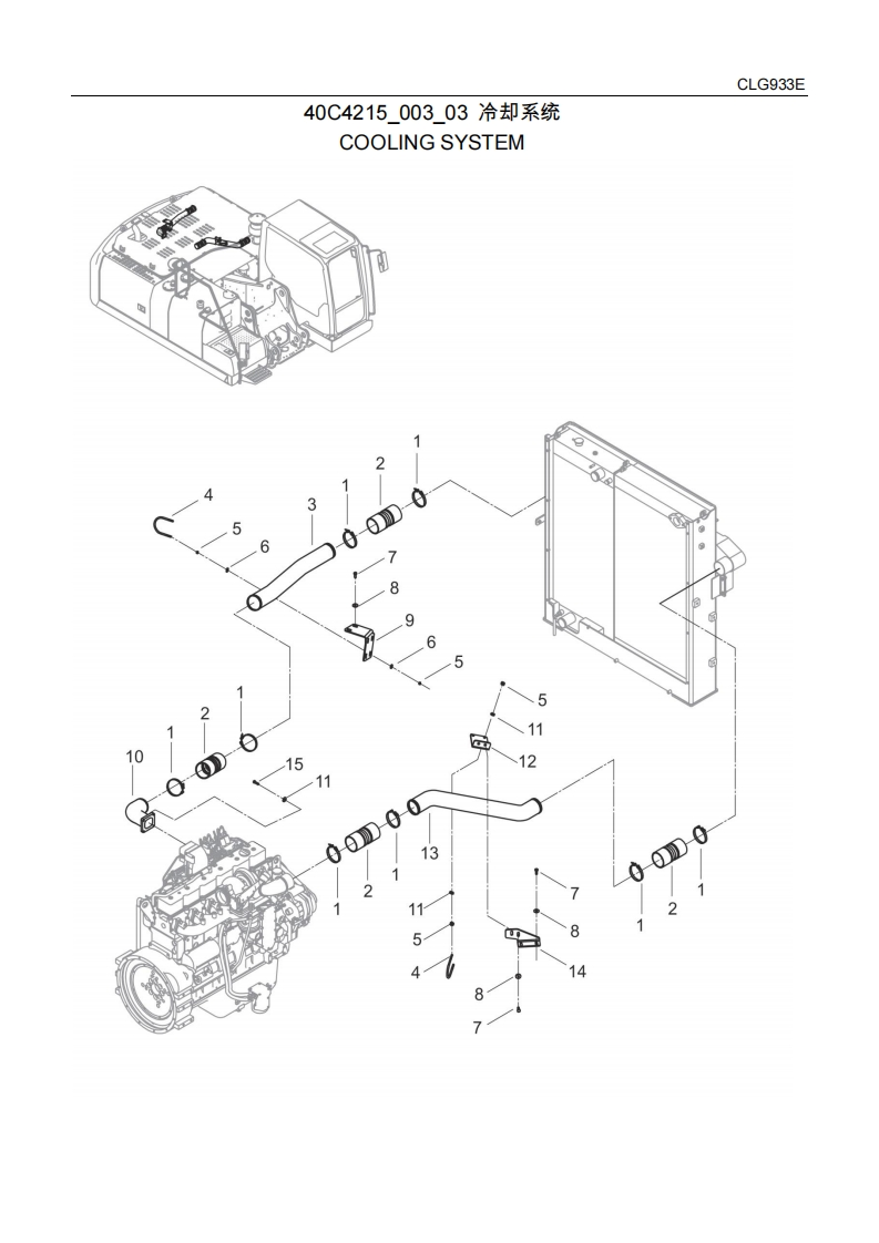 CLG933E动力系统POWER SYSTEM00Y0401000_00柴油机系统ENGINE SYSTEM互件号部件号霁件名称PART NAME服务数量规格备注ITEMPART NOCHEN代码s性QTYSP.REA140C2581柴油机DIESEL ENGINE1F-CLG930E-6CTAA40C4215希却系统COOLINGCSYSTEM40C6165发动机安装ENGINECMOUNTING40C6166燃油系统FUEL SYSTEMC140C7006进排气系统INTAKE ANDEXHAUSTSYSTEM柴油机系统骨ENGINEA架SYSTEM-SKEL